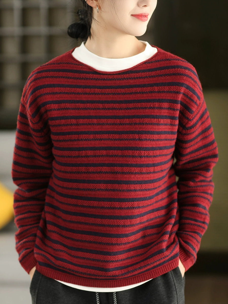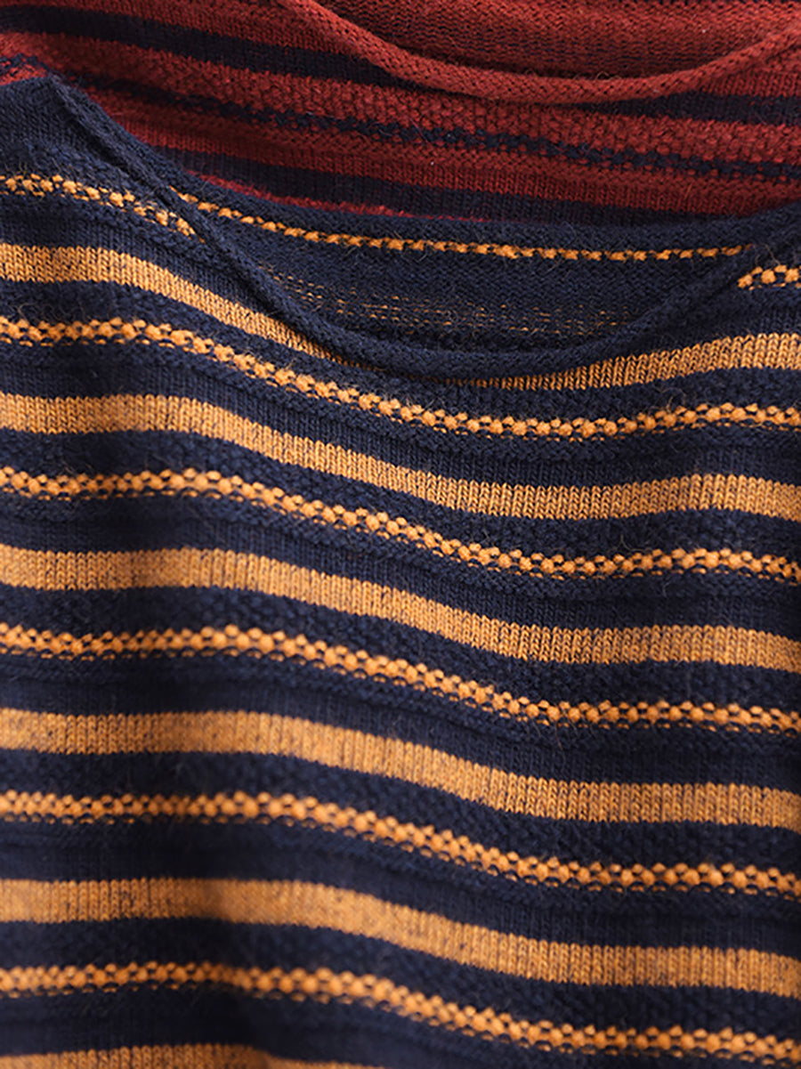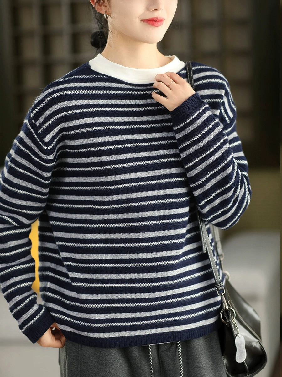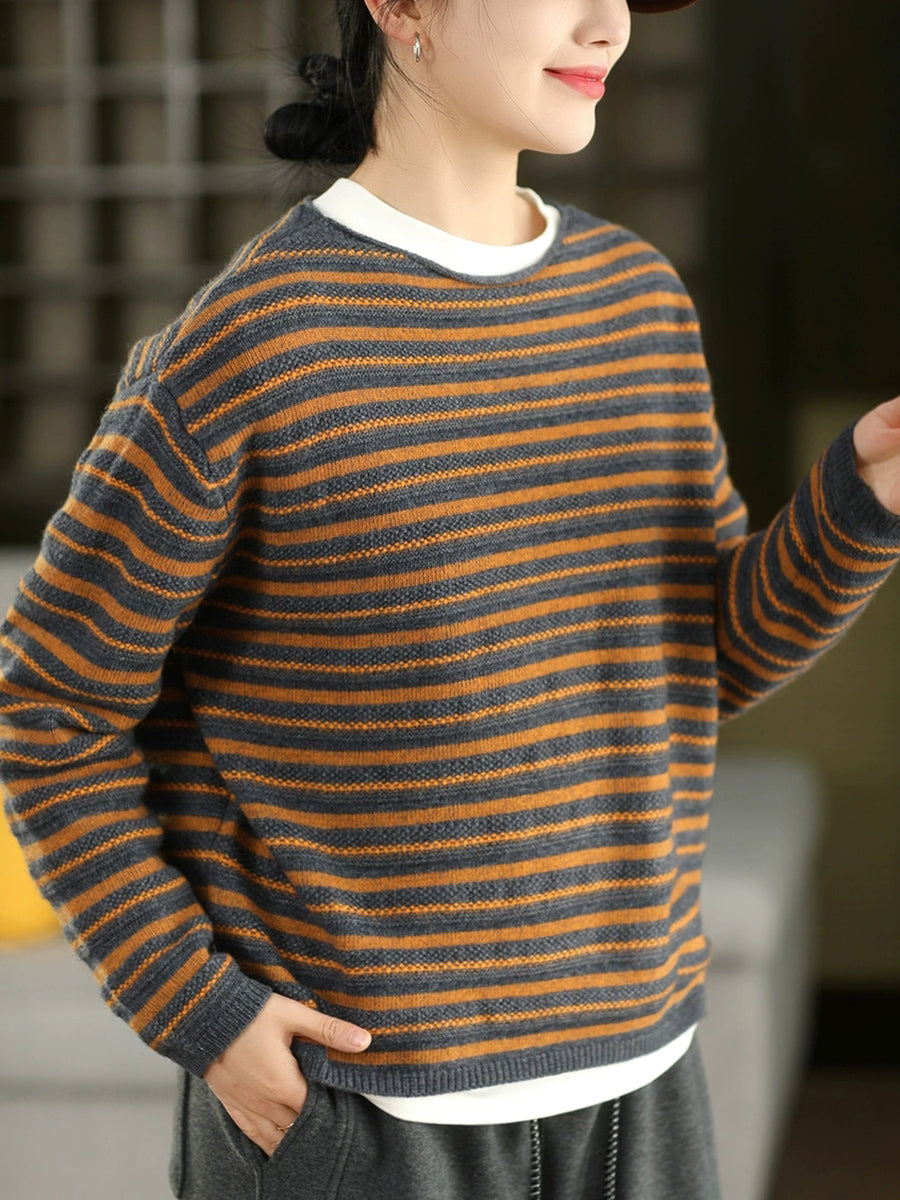 Dámský podzimní vintage pruhovaný pletený svetr s výstřihem do O-neck