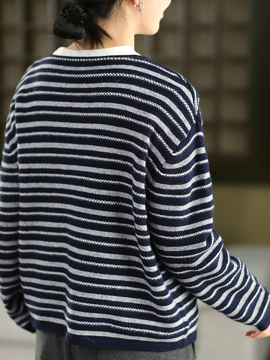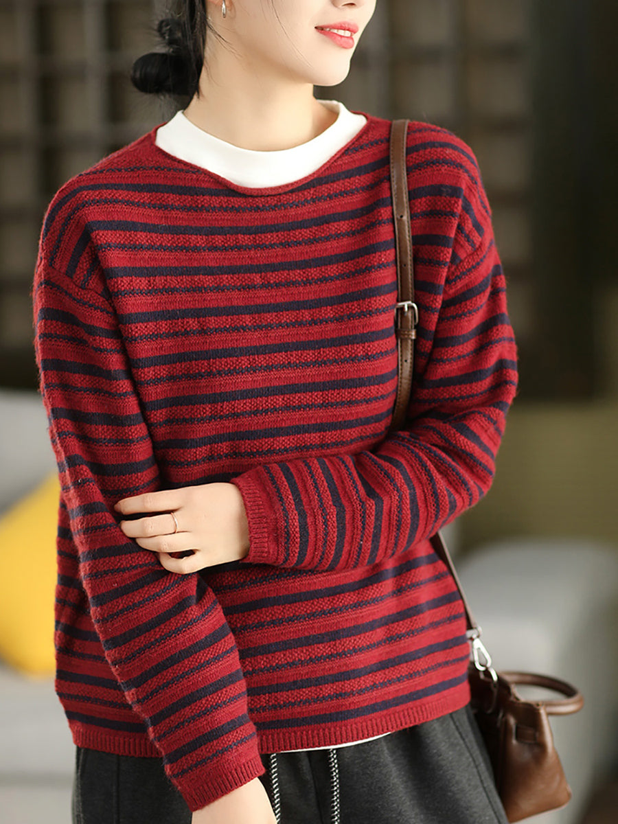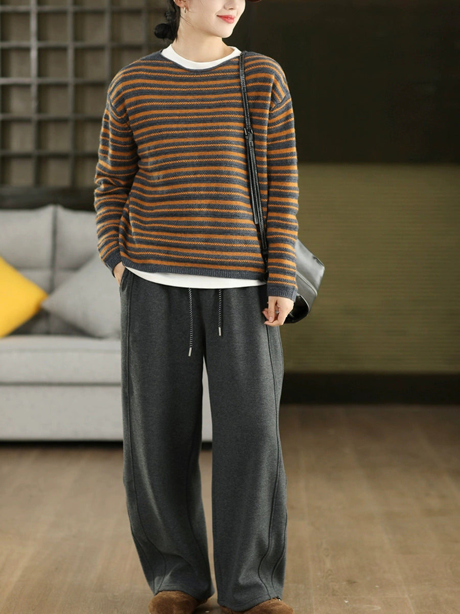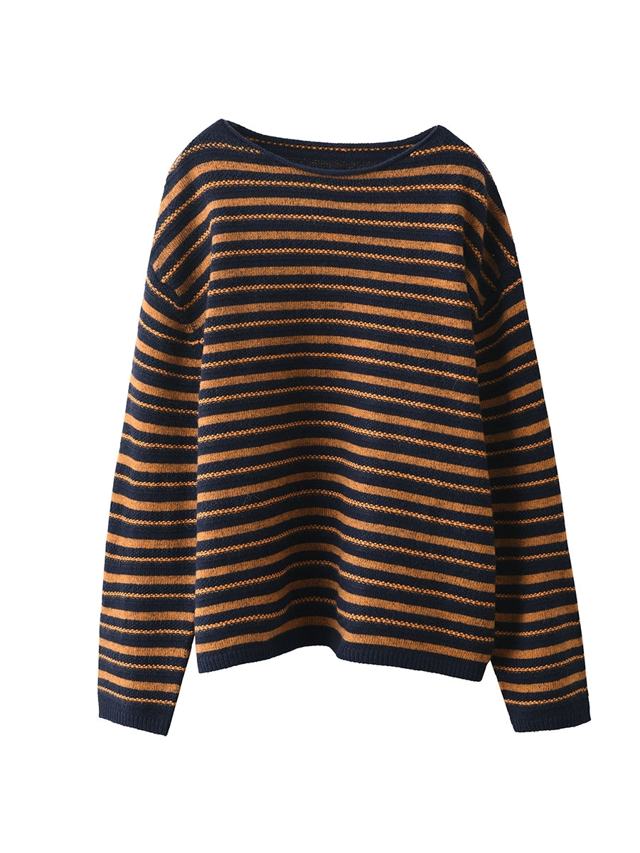 Dámský podzimní vintage pruhovaný pletený svetr s výstřihem do O-neck