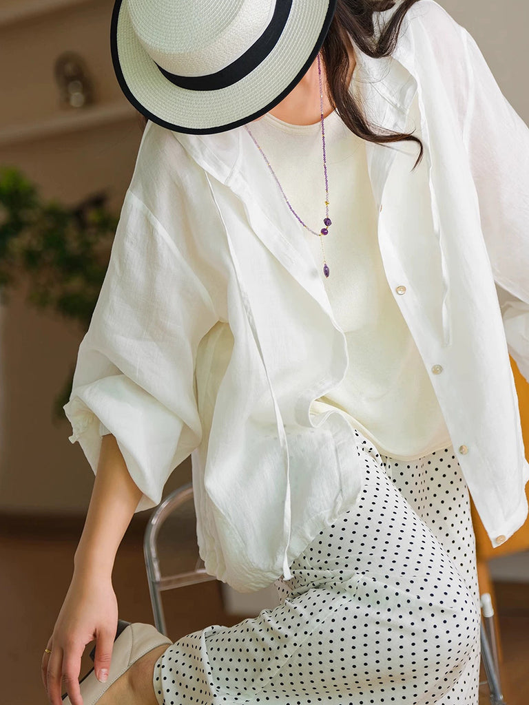 Dámská letní retro čistě barevná lněná košile s neopracovaným okrajem a výstřihem do O-kroju