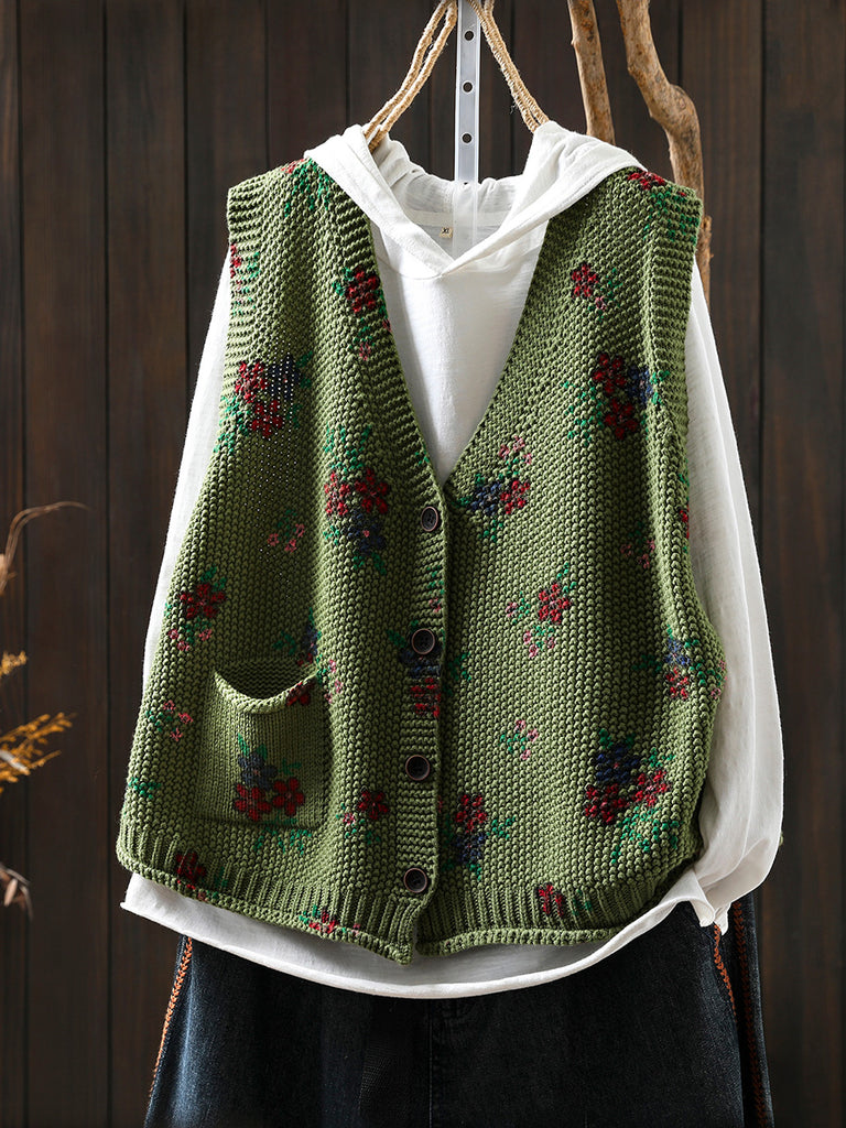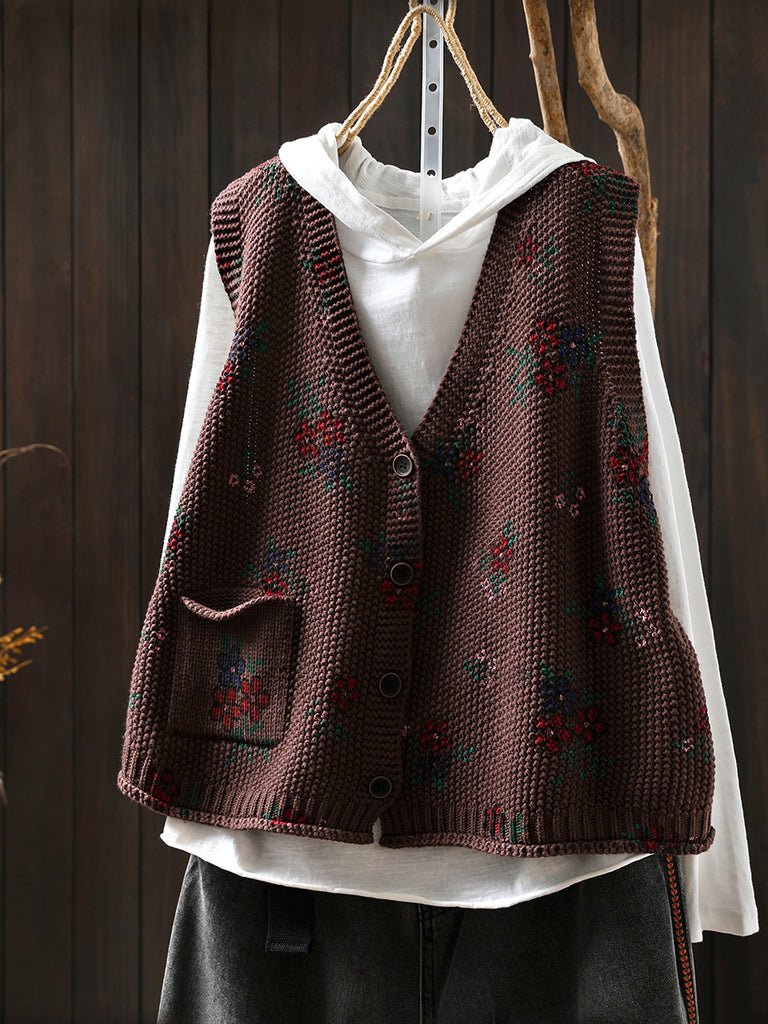 Dámská podzimní retro květinová pletená vesta s výstřihem do V