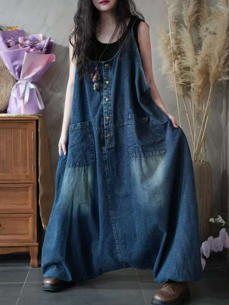 Dámské vintage retro čisté barvy s nízkým rozkrokem a džínové overaly