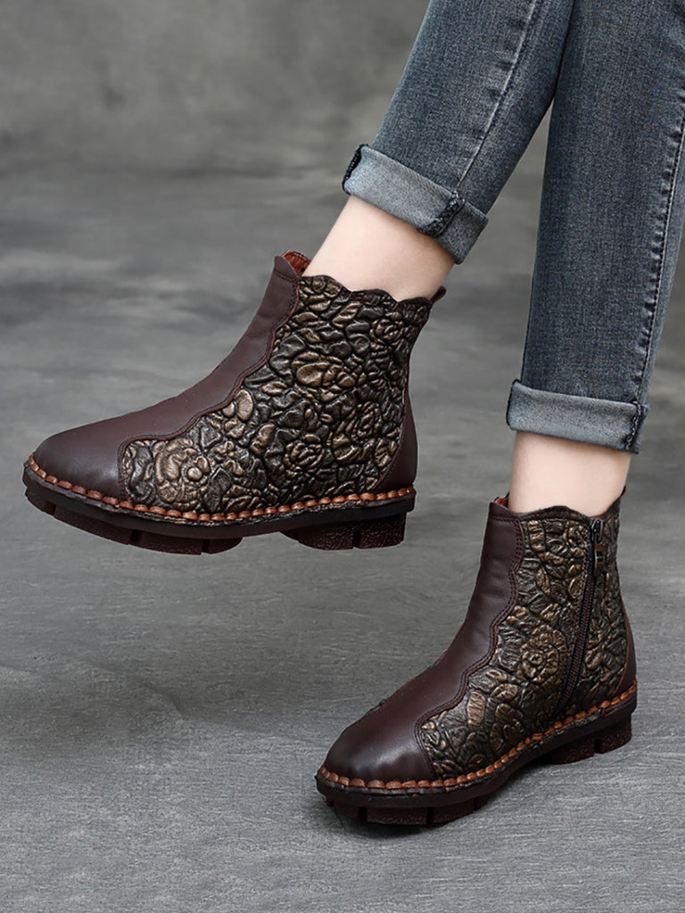 Dámské kozačky na nízkém podpatku se zapínáním na zip z retro květinové kůže