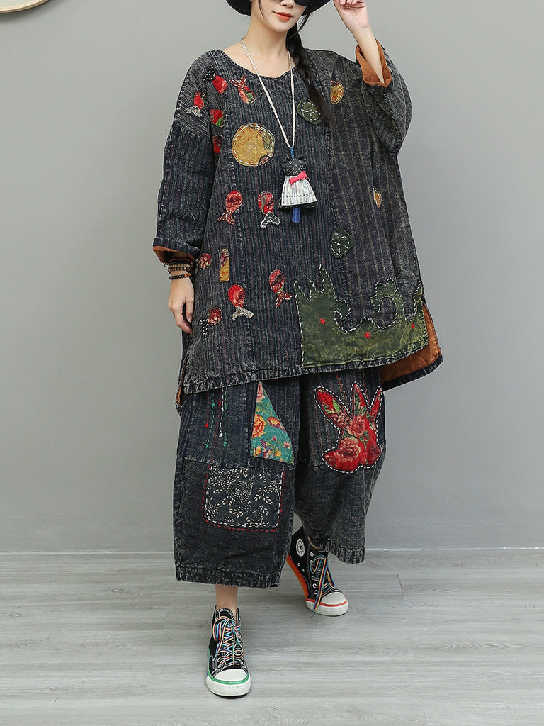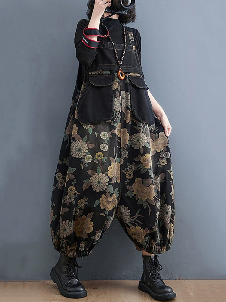 Dámské podzimní umělecké květinové džínové kalhoty s širokými nohavicemi
