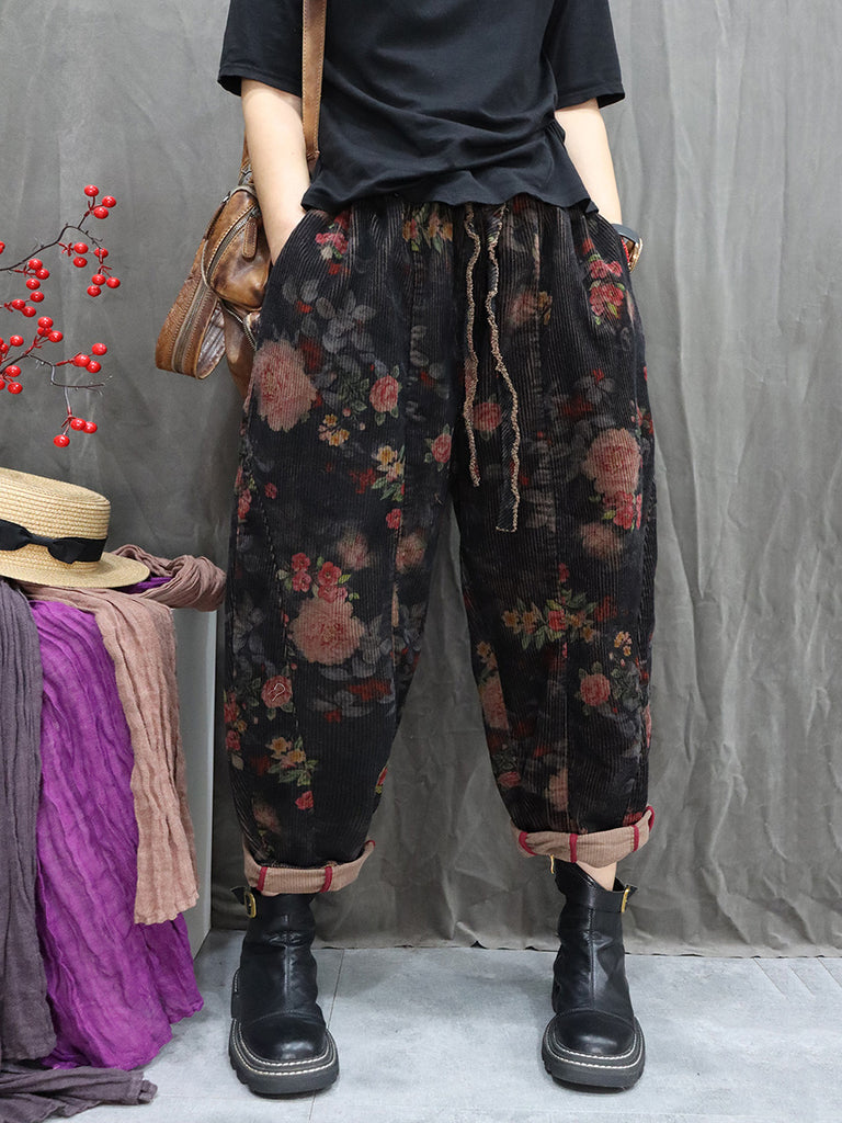 Dámské zimní retro květinové manšestrové harémové kalhoty