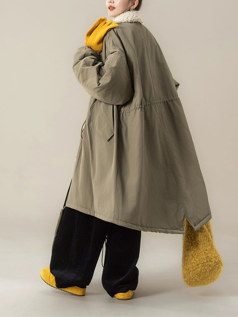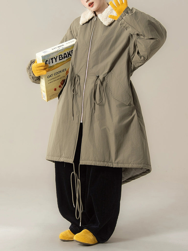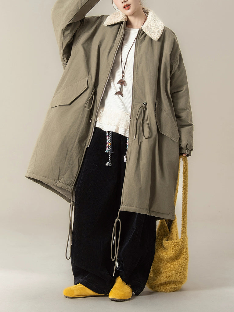 Tento kabát, určený na zimu a podzim, se vyznačuje jednobarevným střihem s klasickým odnímatelným límcem. Nabízí raglánové rukávy po celé délce v retro stylu, který kombinuje nadčasovou eleganci s praktickým teplem.