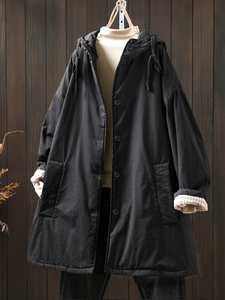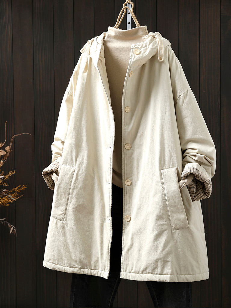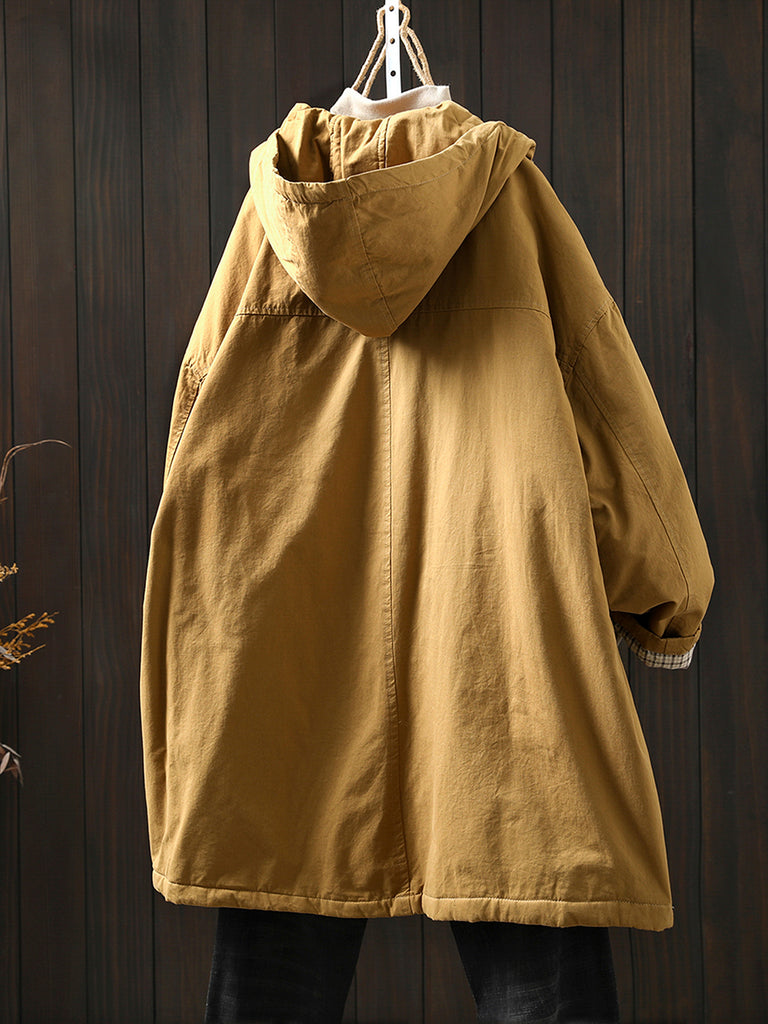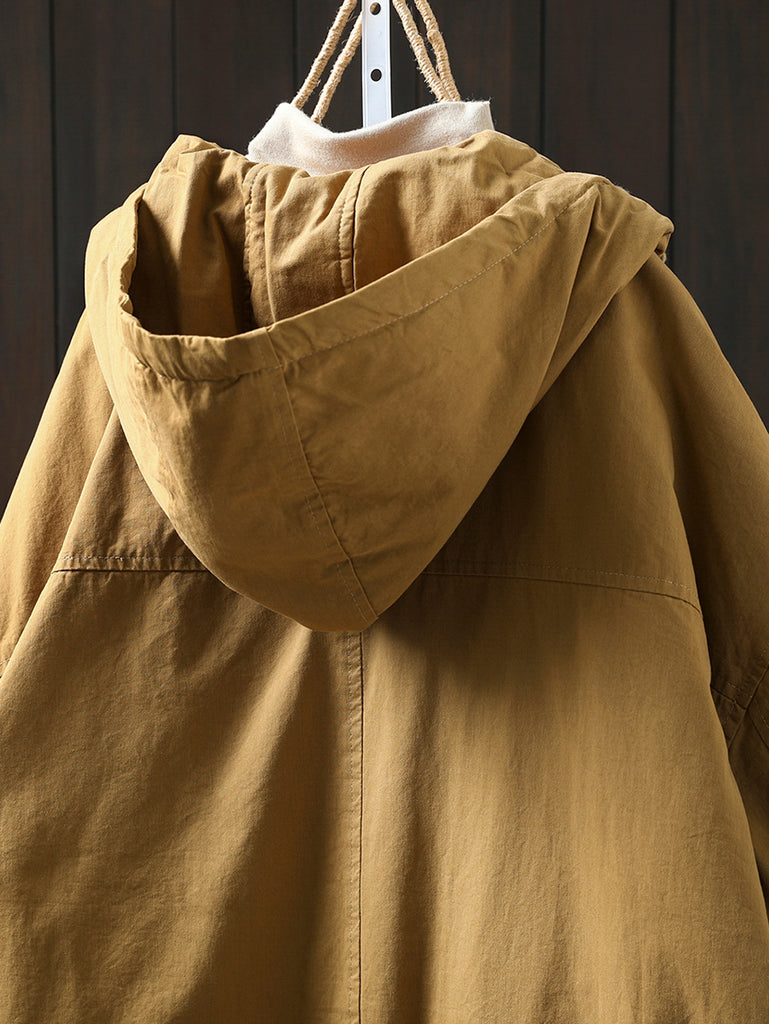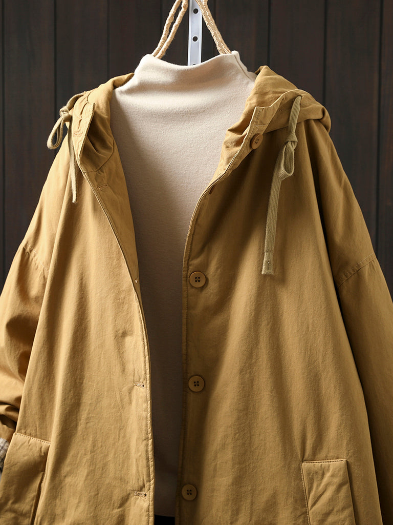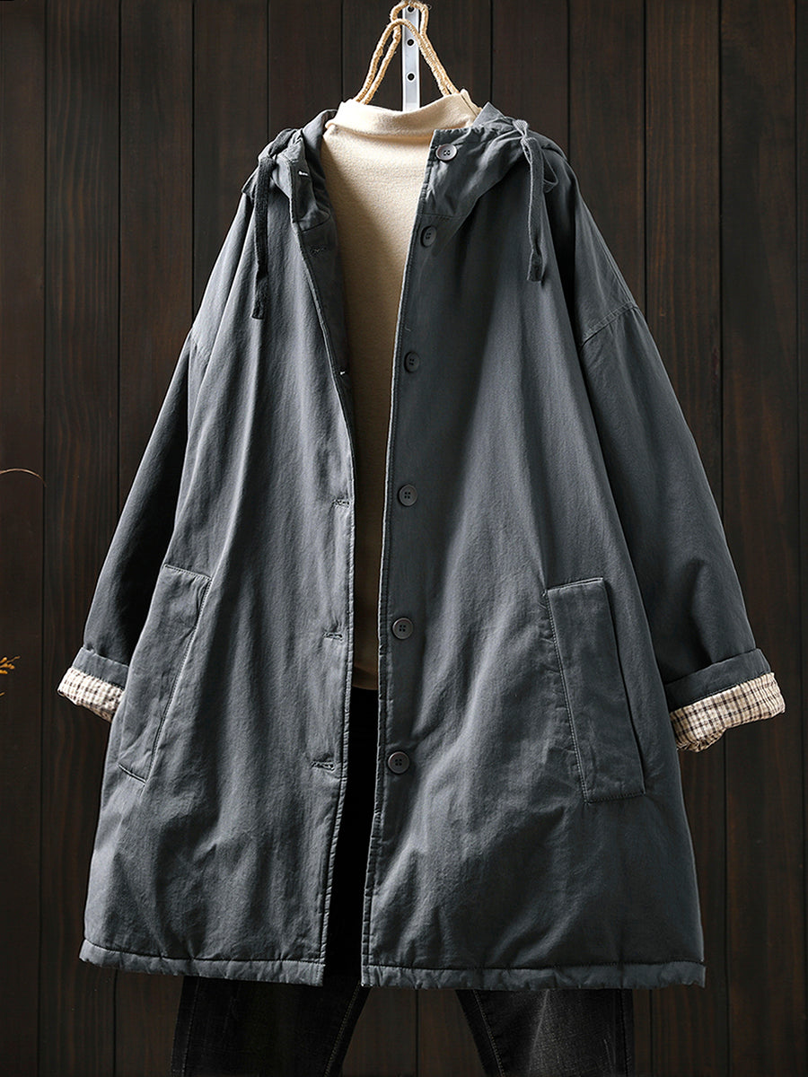 Tento kabát se vyznačuje jednobarevným designem s kapucí a límcem. Má raglánové rukávy po celé délce ve vintage stylu, ideální pro podzimní a zimní období.