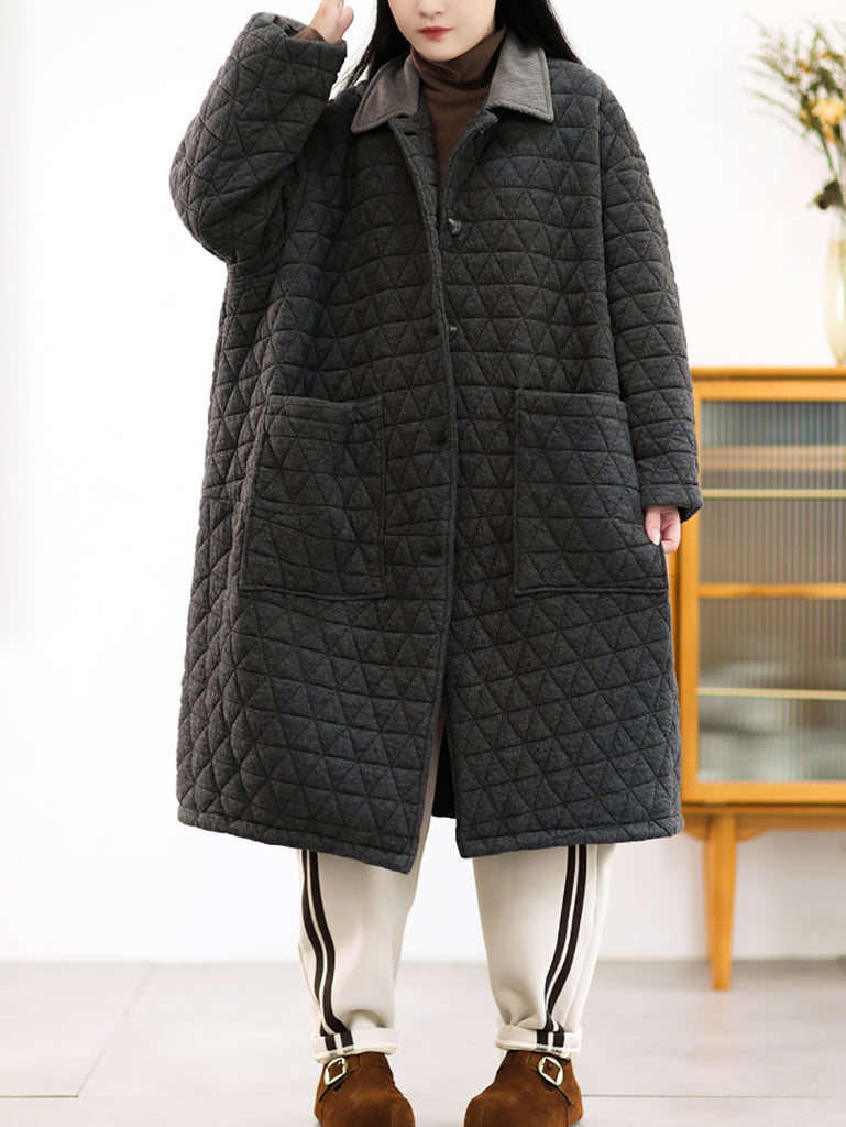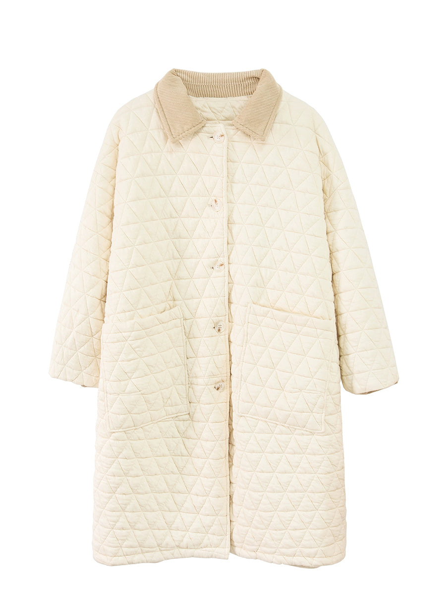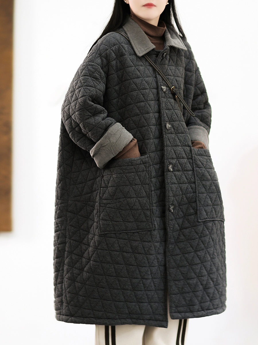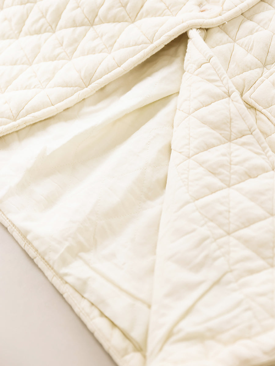 Tento prodloužený prošívaný kabát je vyroben z prémiové bavlny a vyznačuje se klasickým odhalovacím límcem a raglánovými rukávy, které poskytují neomezený pohyb a moderní pohodlí. Decentní jednobarevná kombinace nabízí výjimečnou všestrannost pro vrstvení a styling napříč ročními obdobími. Díky vintage designu a celorozměrnému střihu rukávů poskytuje tento kousek dostatek tepla během podzimních a zimních měsíců a zároveň si zachovává elegantní a sofistikovaný vzhled.