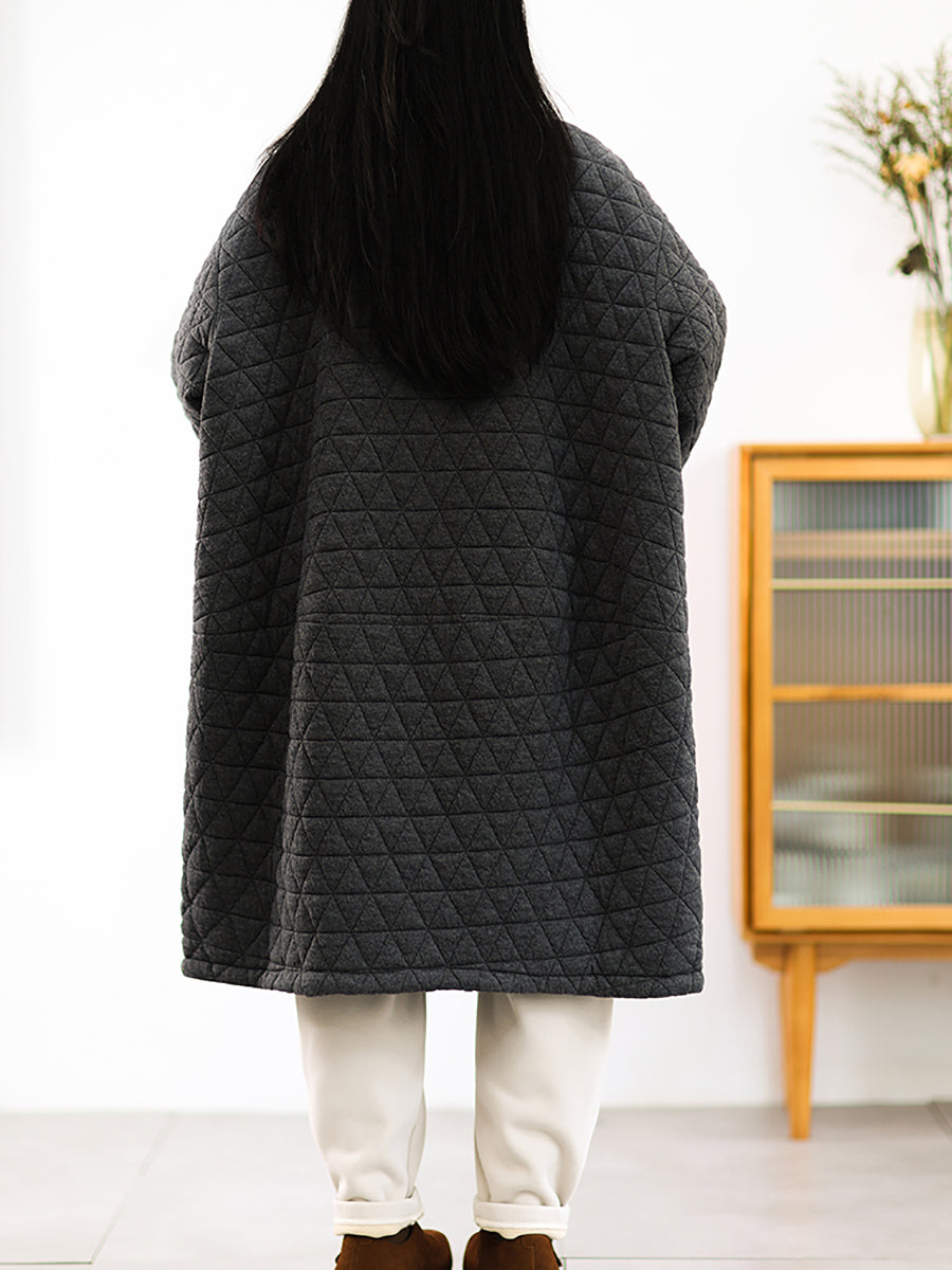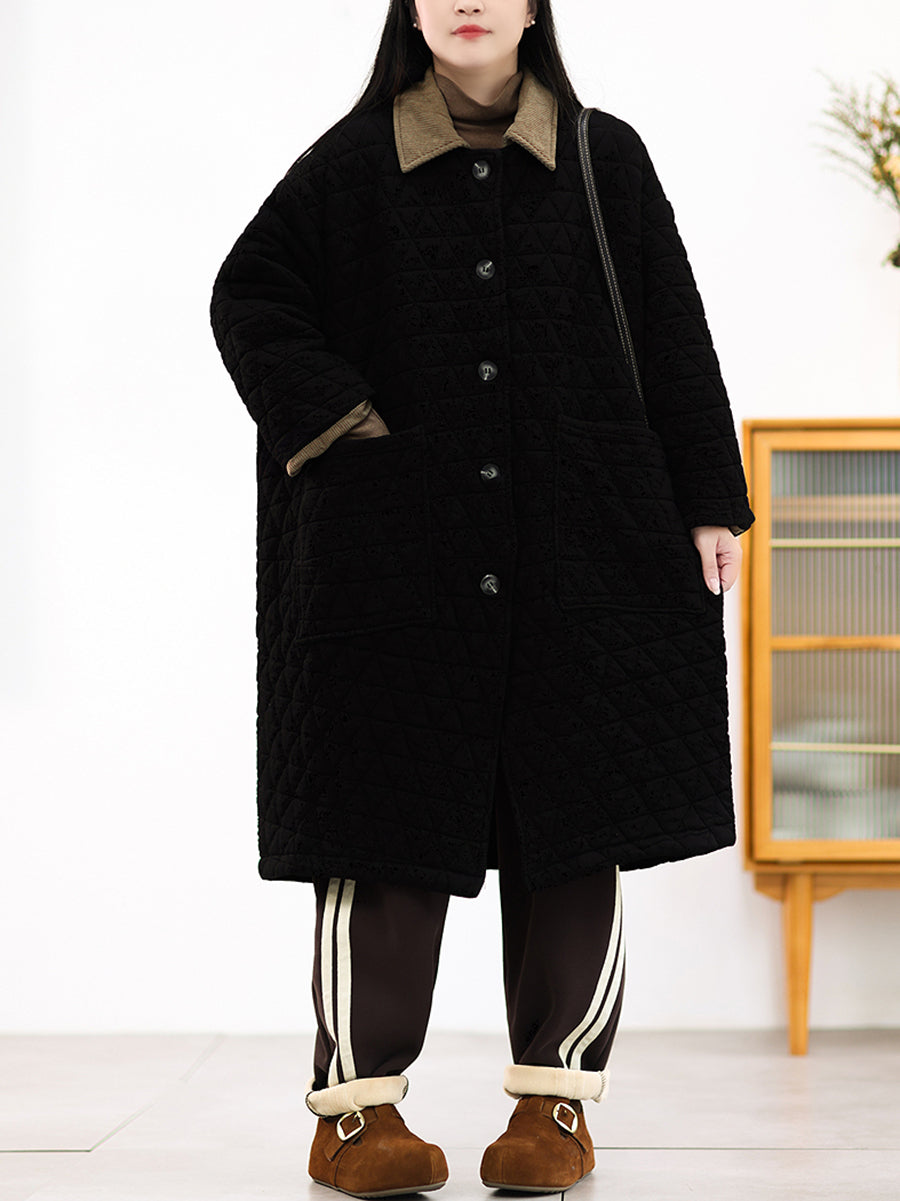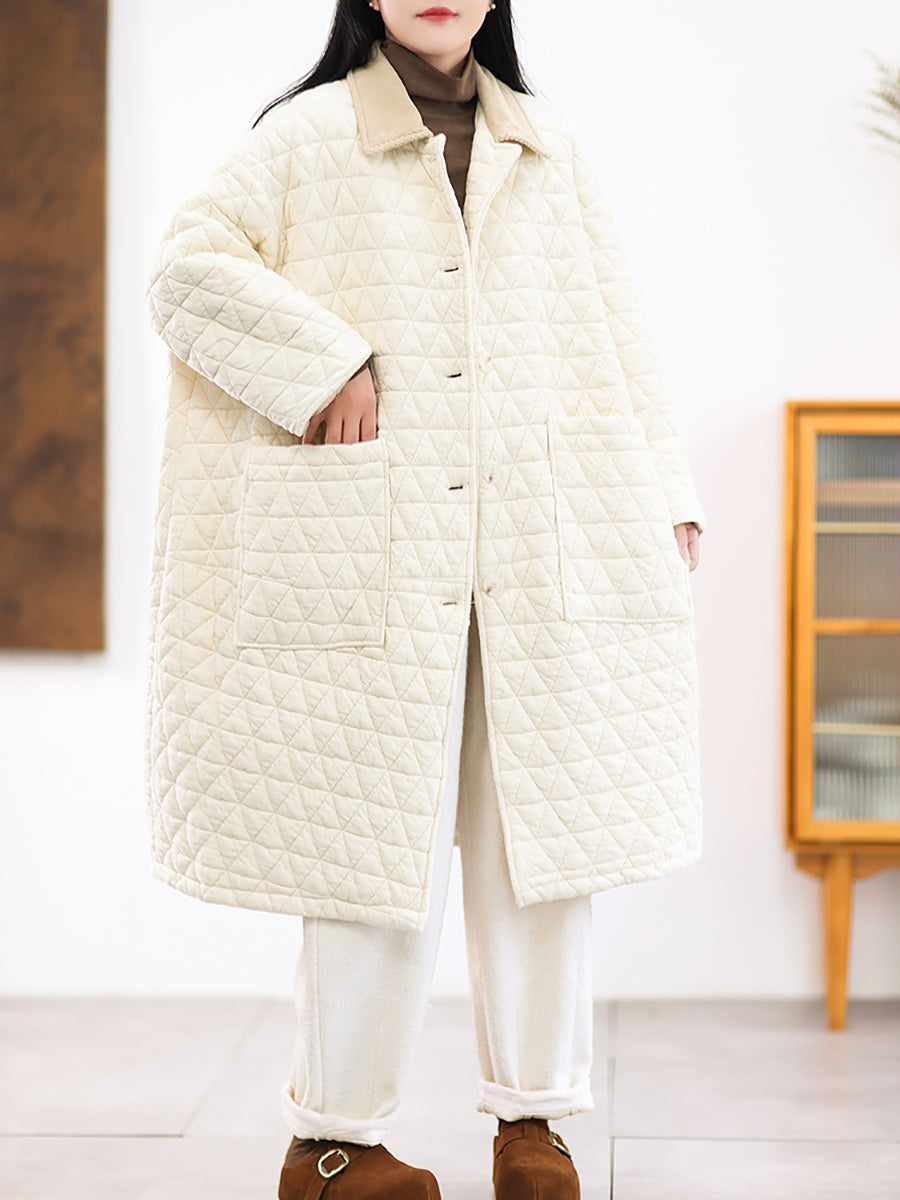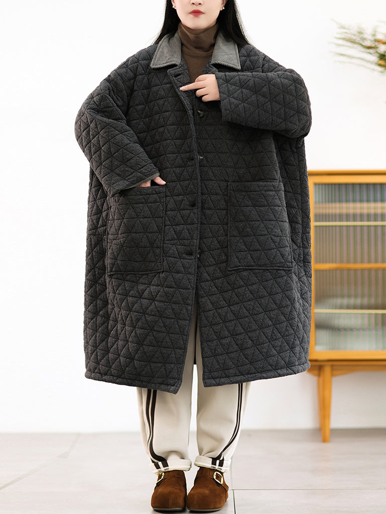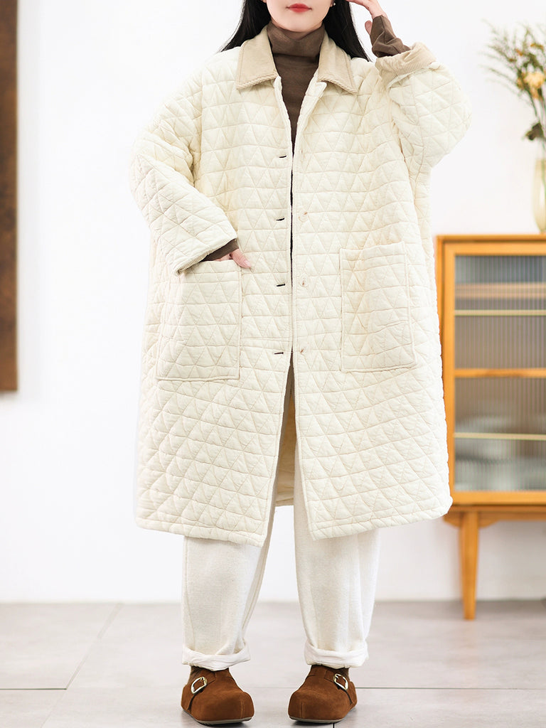 Tento prodloužený prošívaný kabát je vyroben z prémiové bavlny a vyznačuje se klasickým odhalovacím límcem a raglánovými rukávy, které poskytují neomezený pohyb a moderní pohodlí. Decentní jednobarevná kombinace nabízí výjimečnou všestrannost pro vrstvení a styling napříč ročními obdobími. Díky vintage designu a celorozměrnému střihu rukávů poskytuje tento kousek dostatek tepla během podzimních a zimních měsíců a zároveň si zachovává elegantní a sofistikovaný vzhled.