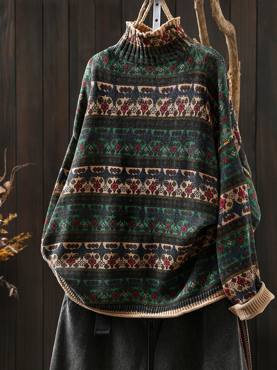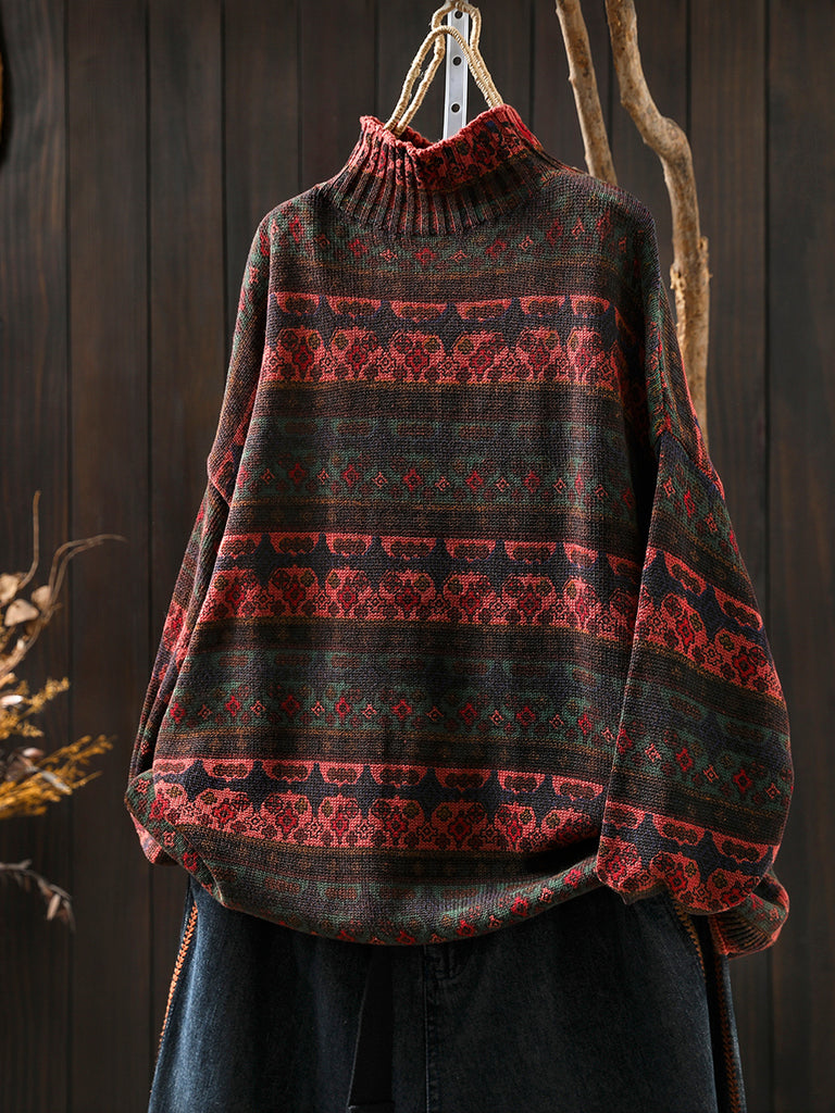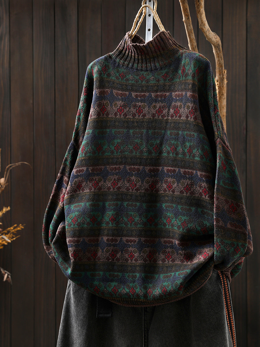 Tento svetr s vintage nádechem, vyrobený z prémiové směsi 45 % bavlny a 55 % akrylu, nabízí pohodlí i odolnost. Poloviční rolák poskytuje rafinované teplo, zatímco dlouhé rukávy klasické zakrytí. Díky elegantnímu květinovému vzoru se tento kousek plynule hodí mezi podzimní a zimní sezónou, což z něj činí nezbytný doplněk každého sofistikovaného šatníku.