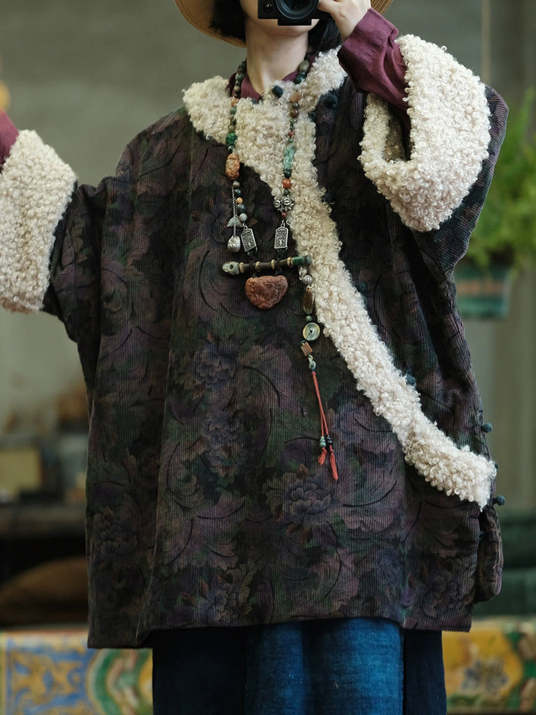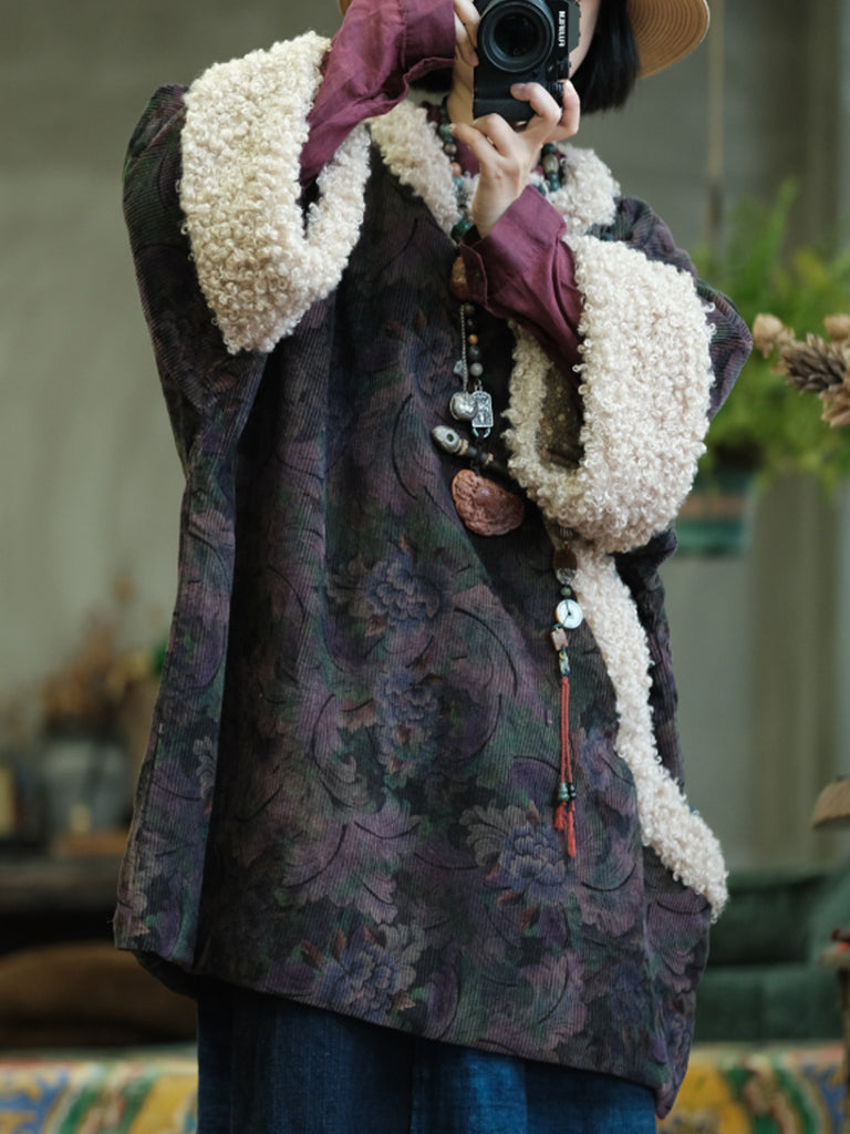 Dámský vintage zimní květinový fleecový manšestrový kabát s výstřihem do O-neck