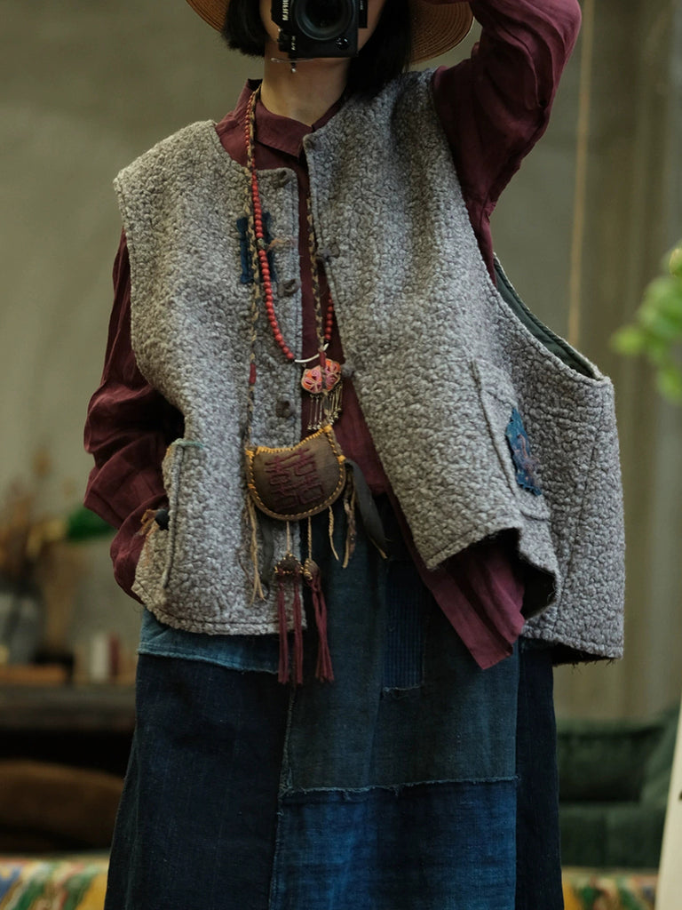 Dámská zimní vintage fleecová vesta s výstřihem do O-neck