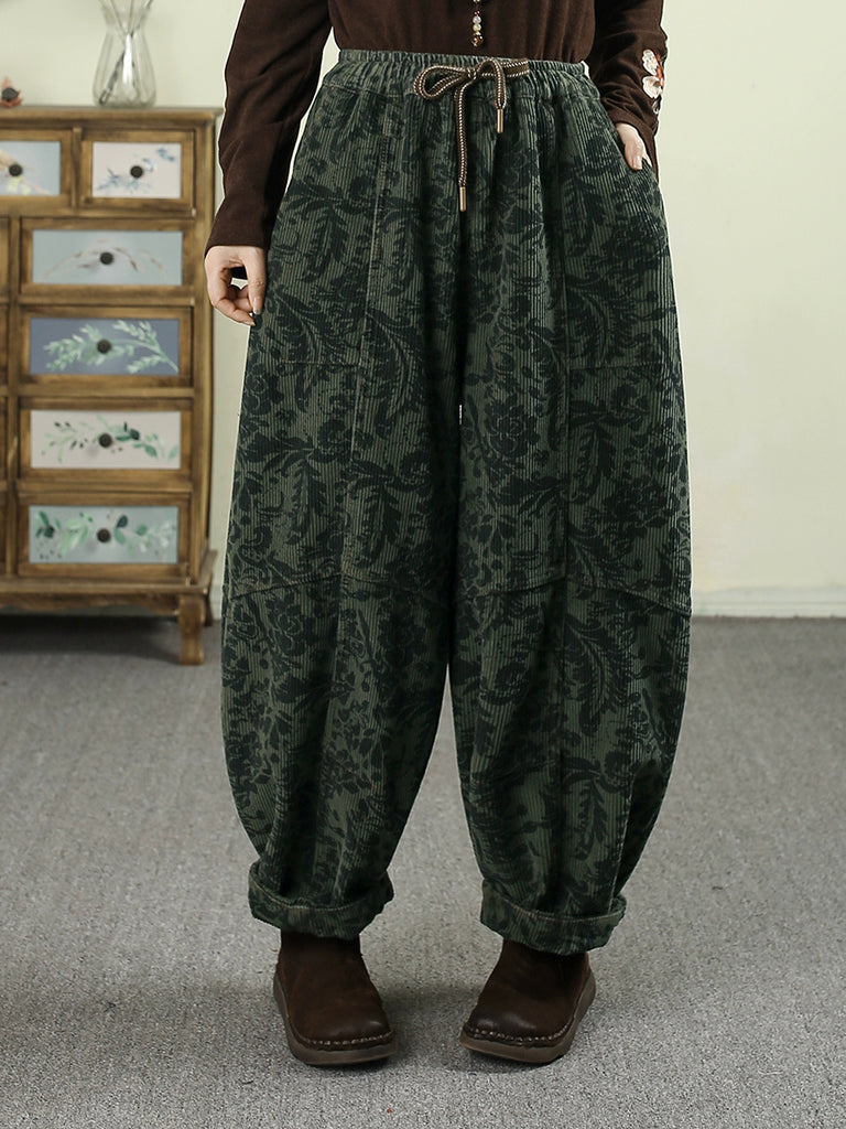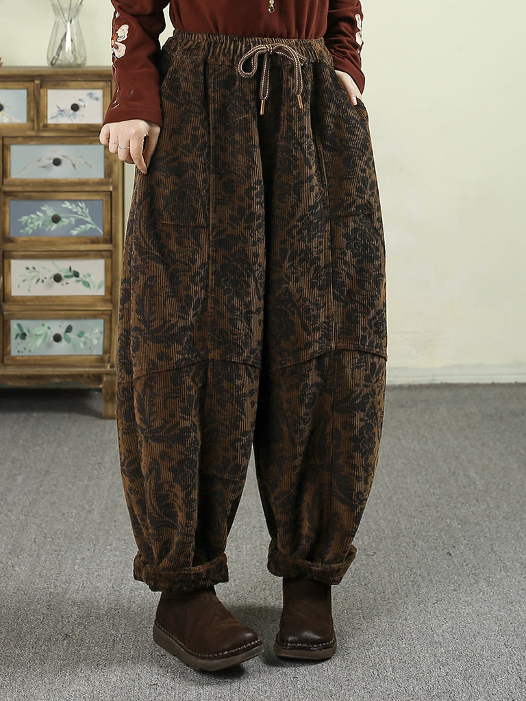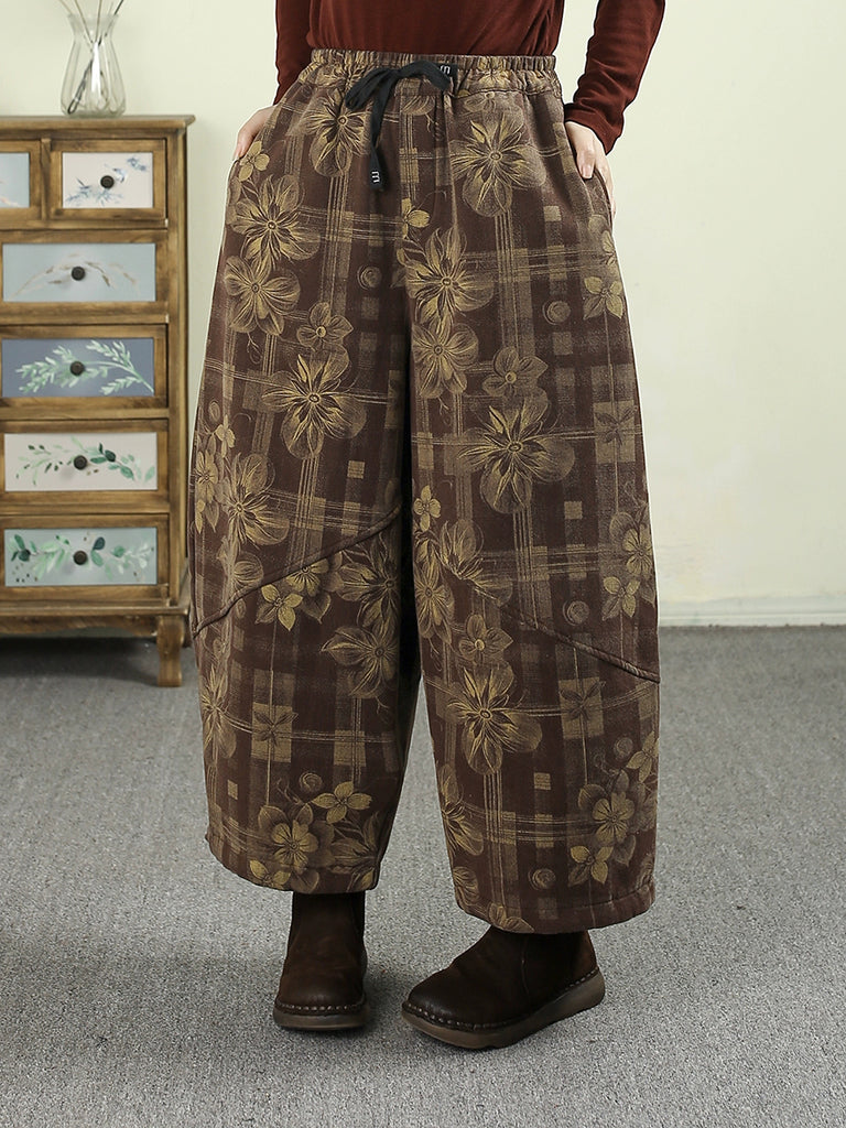 Dámské zimní retro květinové harémové kalhoty s fleecovou podšívkou
