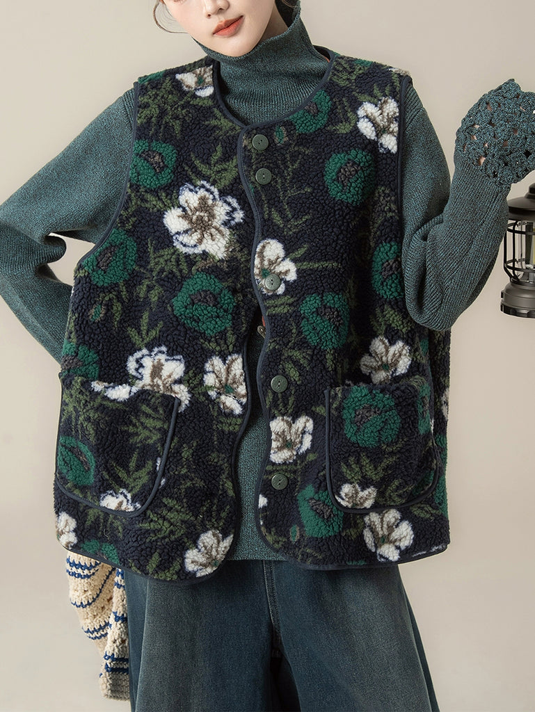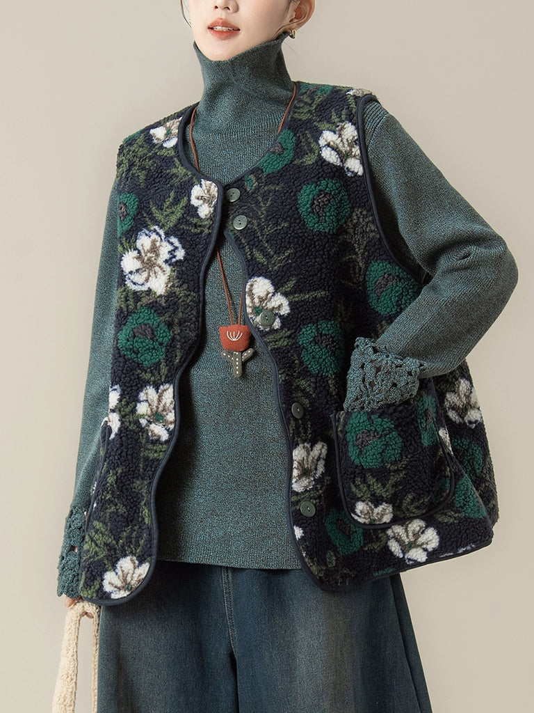 Dámská zimní umělecká květinová fleecová vesta s výstřihem do O-neck