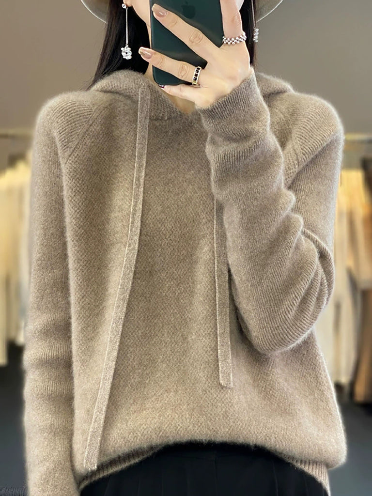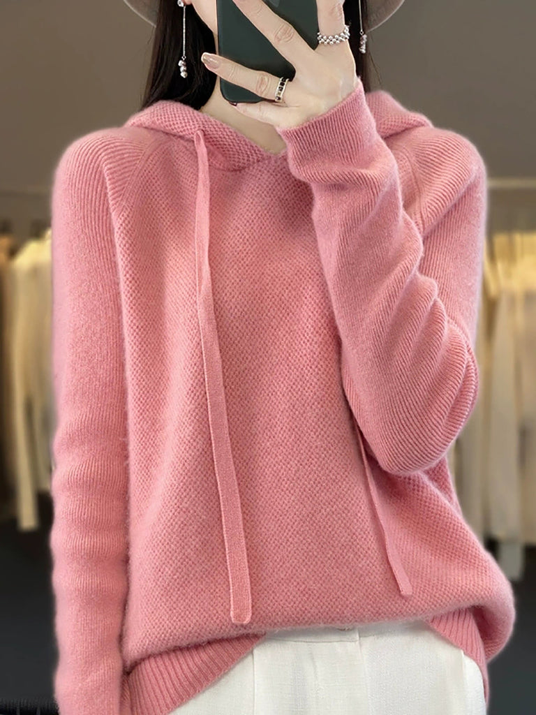 Dámský podzimní ležérní pletený svetr s kapucí v čistě barevných barvách