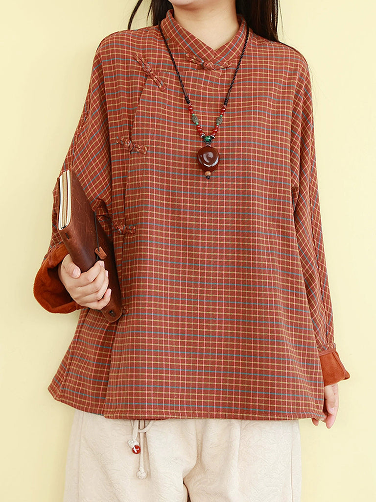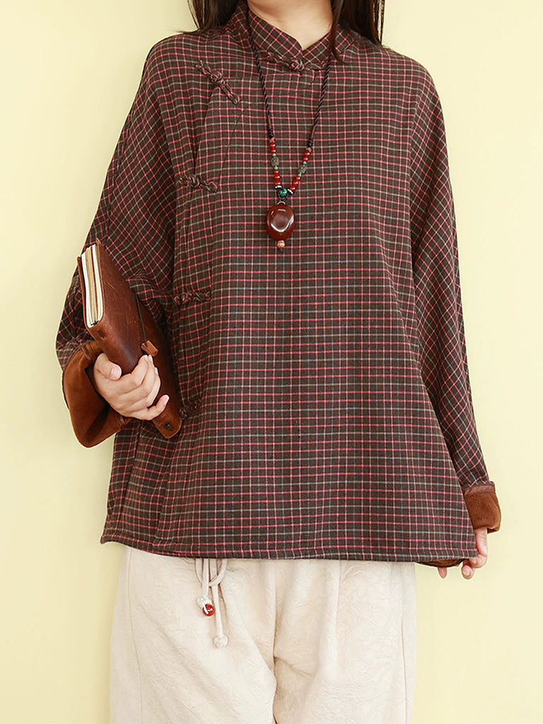 Dámská zimní etnická kostkovaná halenka se stojáčkem a fleecovou podšívkou