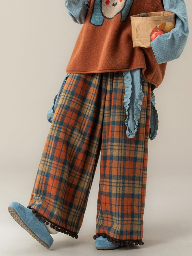 Dámské zimní vintage kostkované kalhoty s širokými nohavicemi a střapcovým lemem