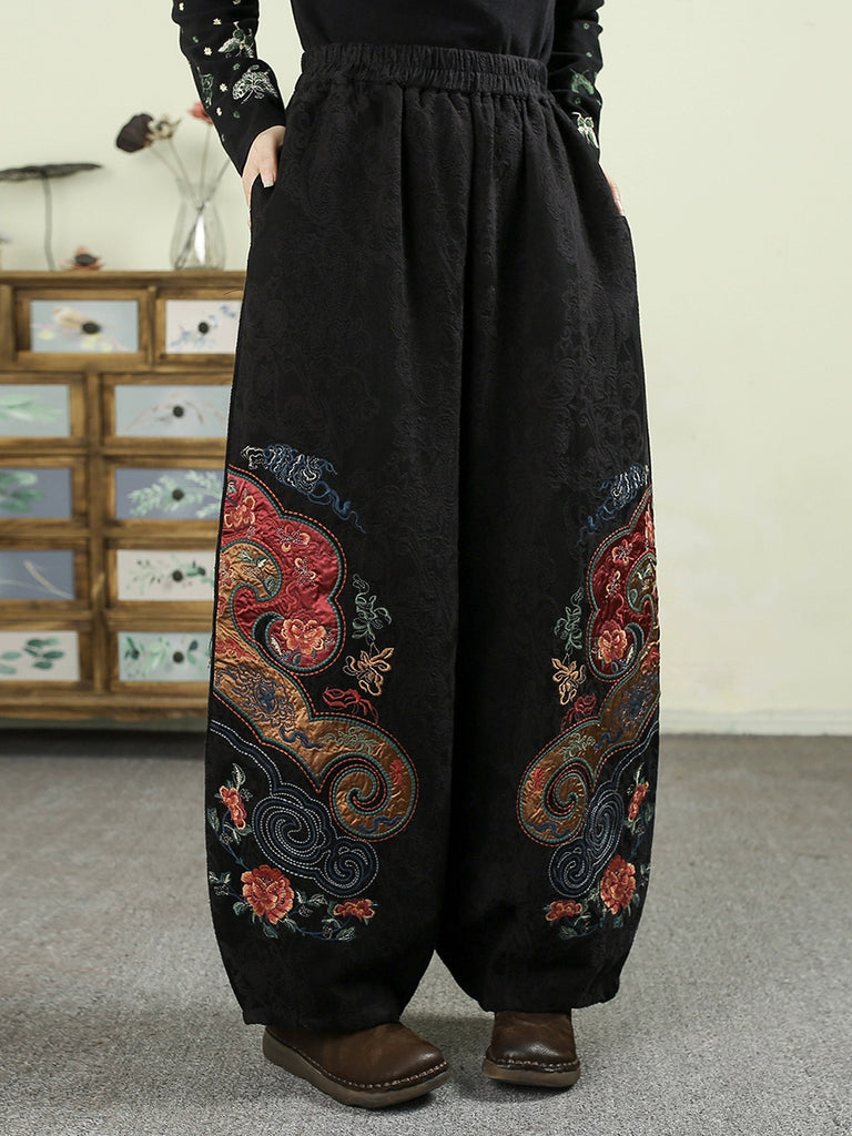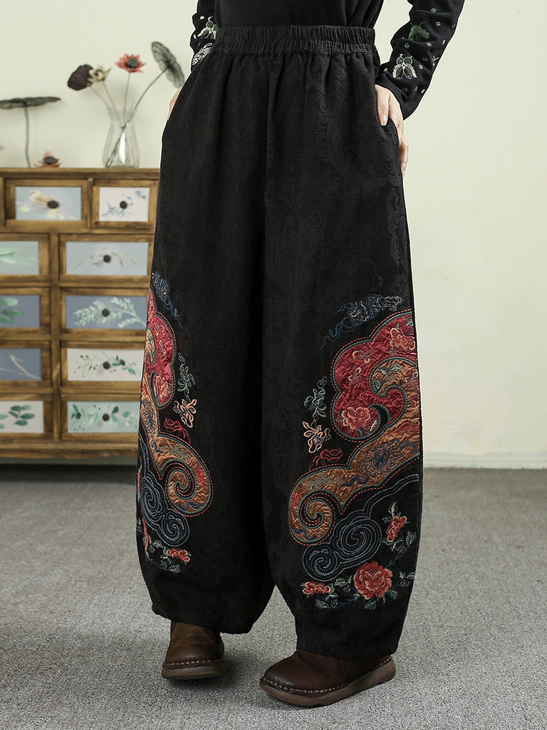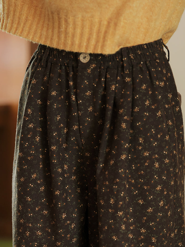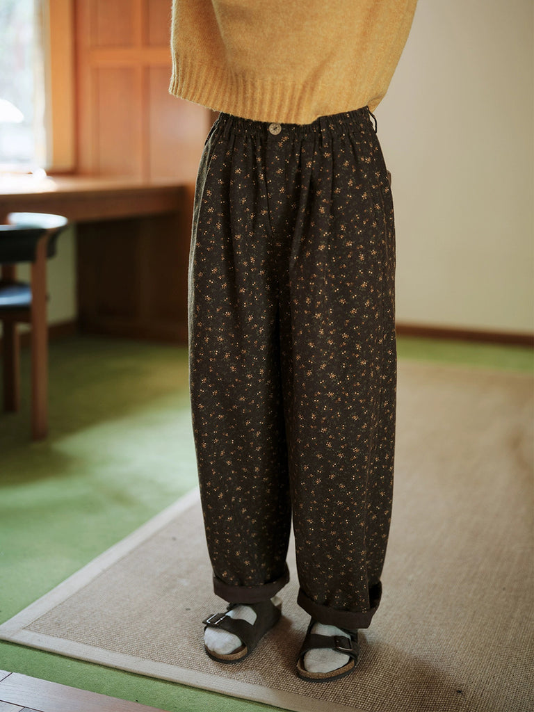 Dámské zimní vintage květinové harémové kalhoty s fleecovou podšívkou
