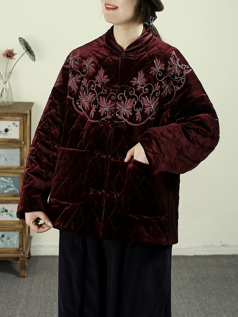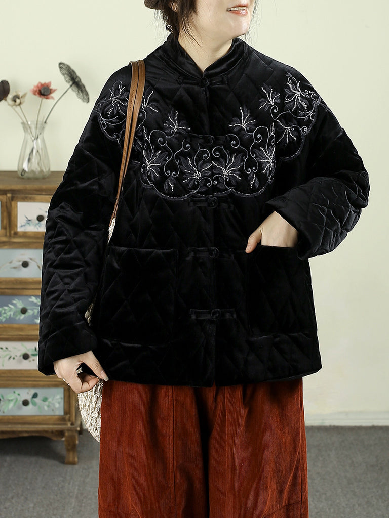 Dámská zimní bunda s vintage výšivkou a prošívaným stojáčkem