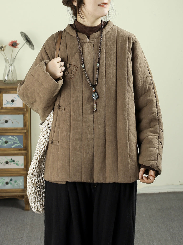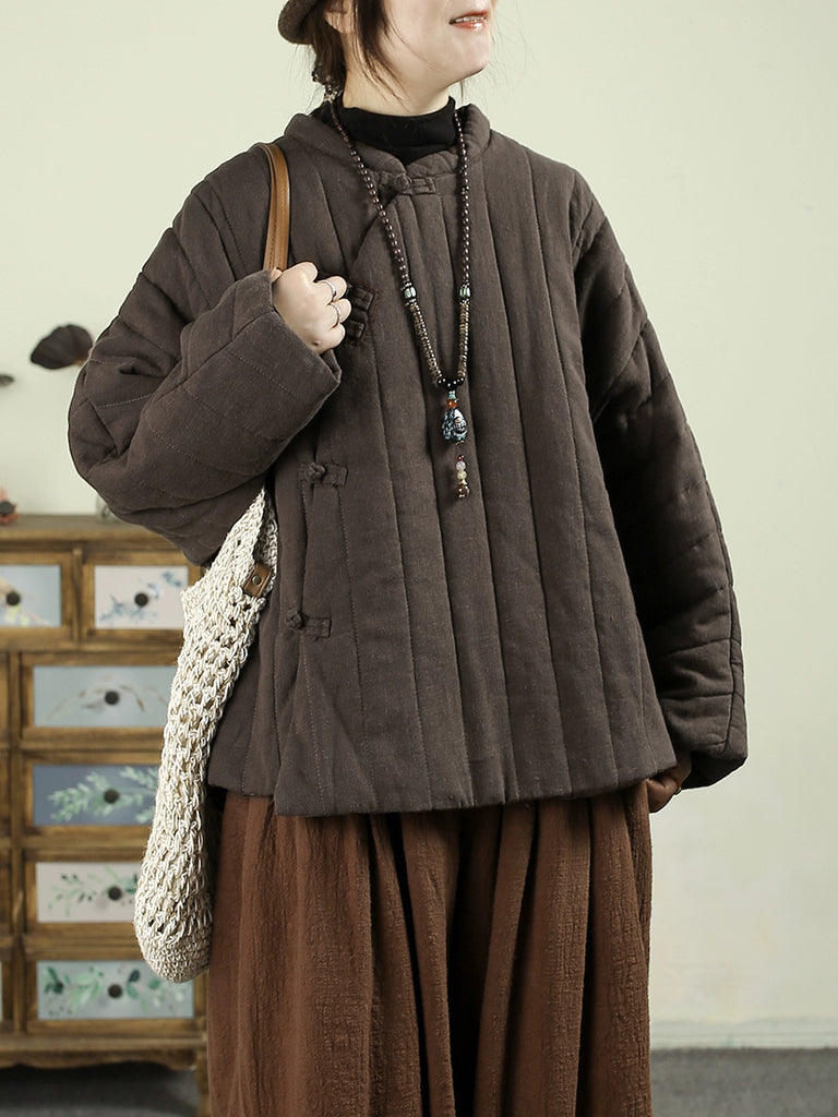 Dámský zimní retro čistě barevný lněný bavlněný prošívaný kabát