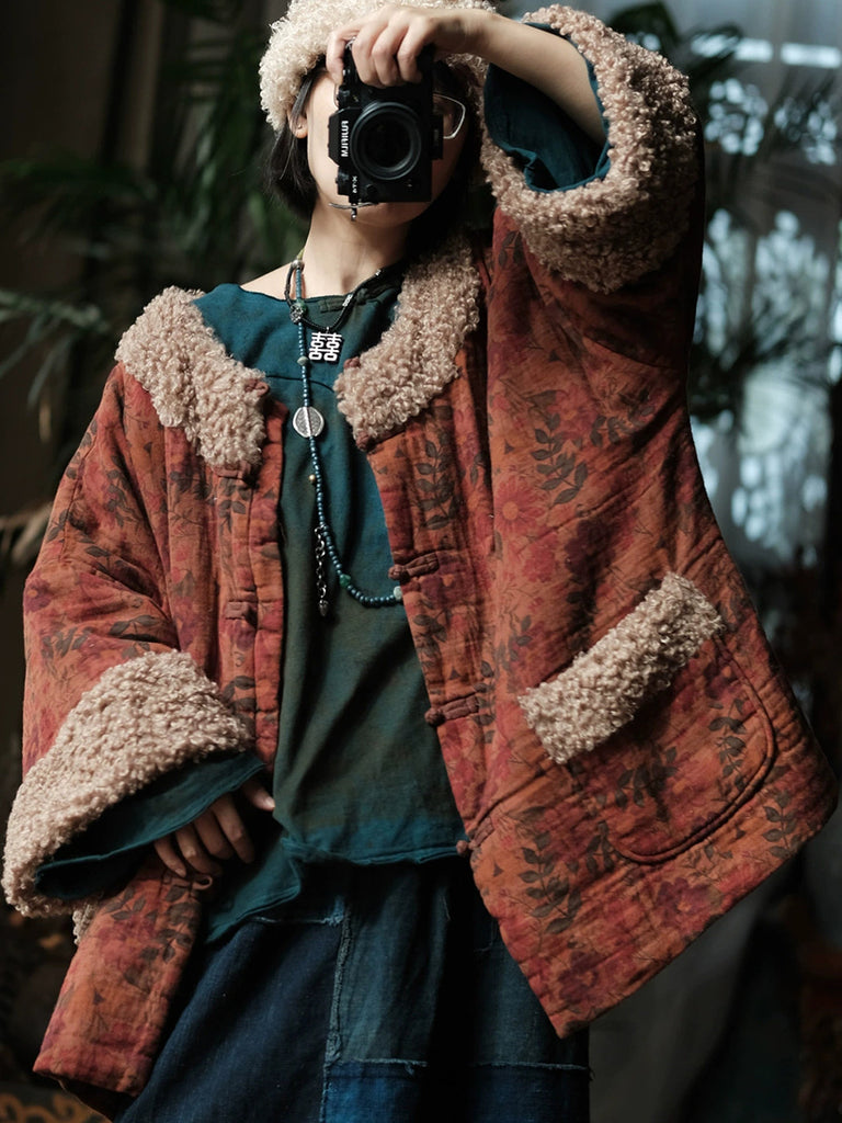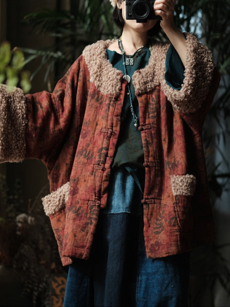 Dámský vintage zimní květinový fleecový bavlněný kabát s výstřihem do O-neck