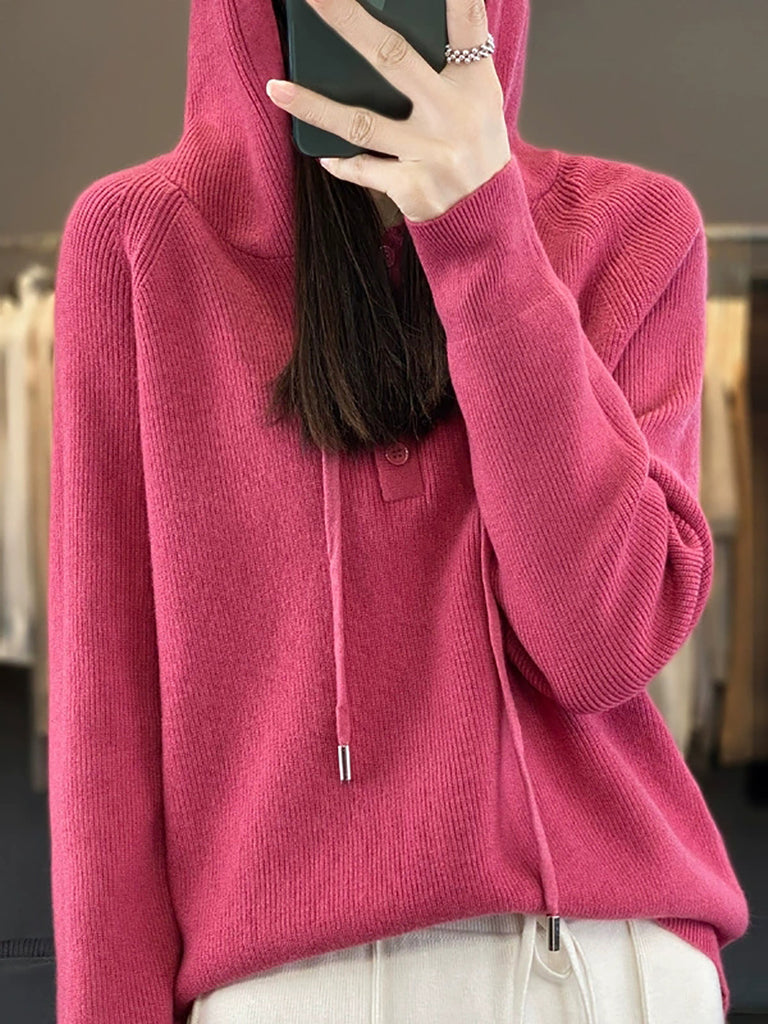 Dámský podzimní ležérní pletený svetr s kapucí v čistě barevných barvách
