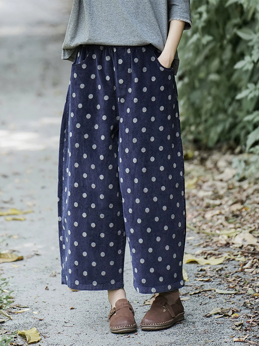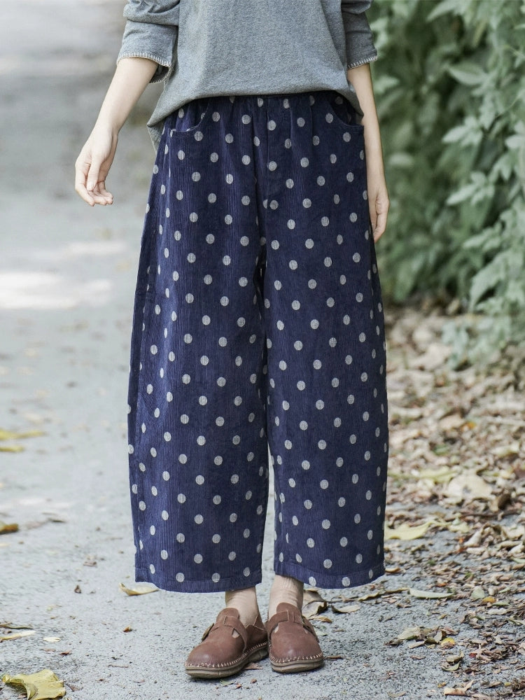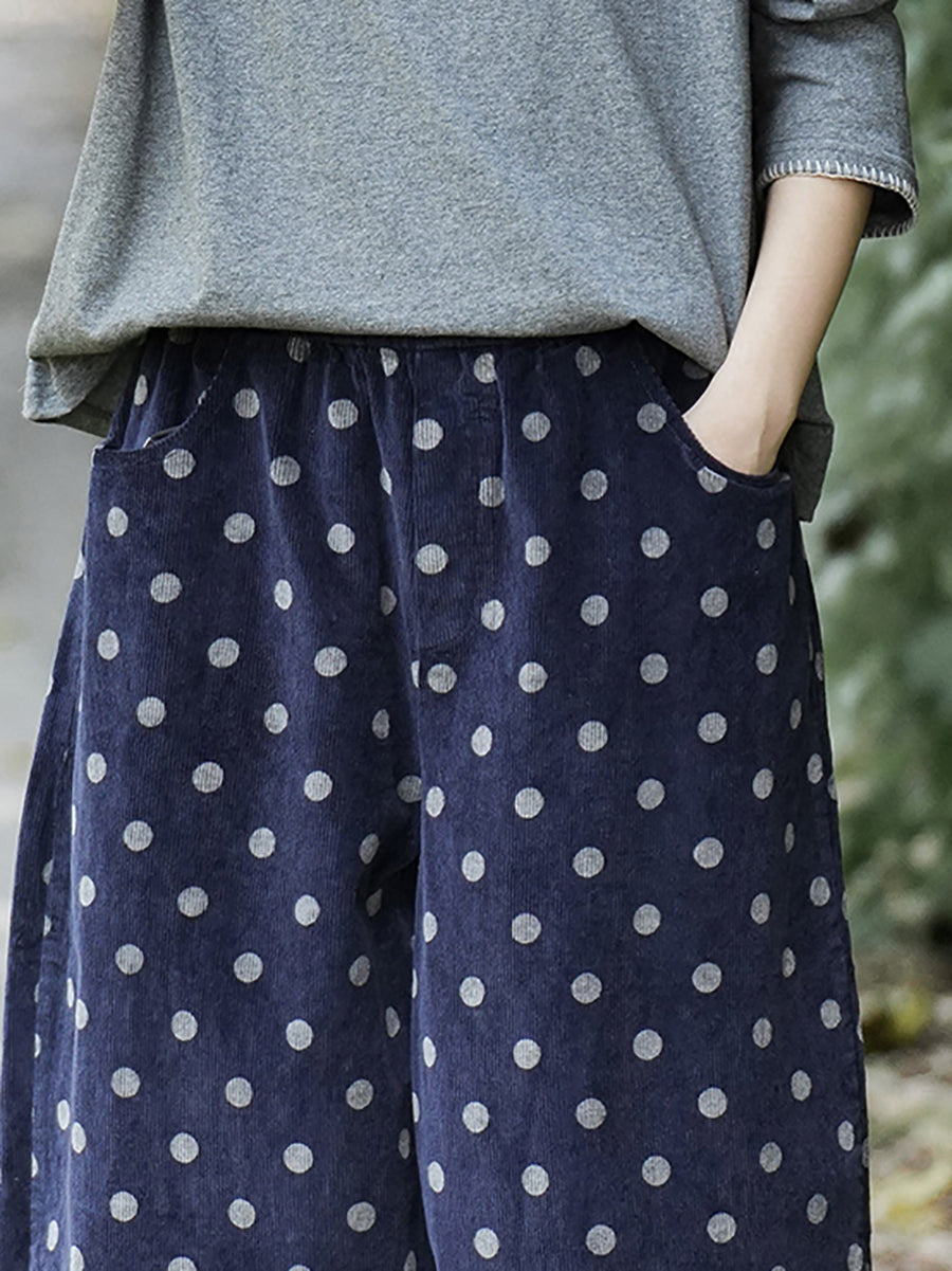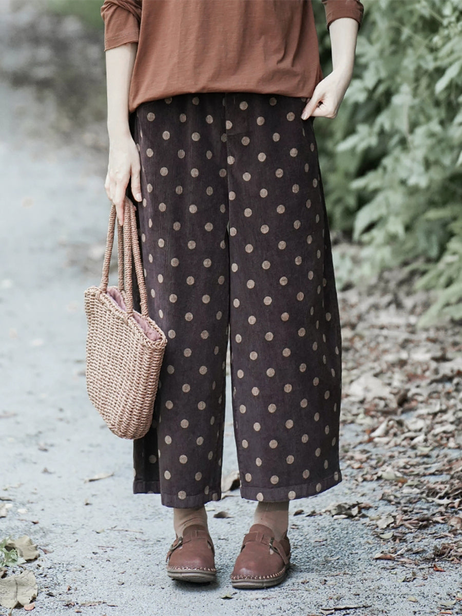 Dámské zimní retro bavlněné kalhoty s puntíky a širokými nohavicemi