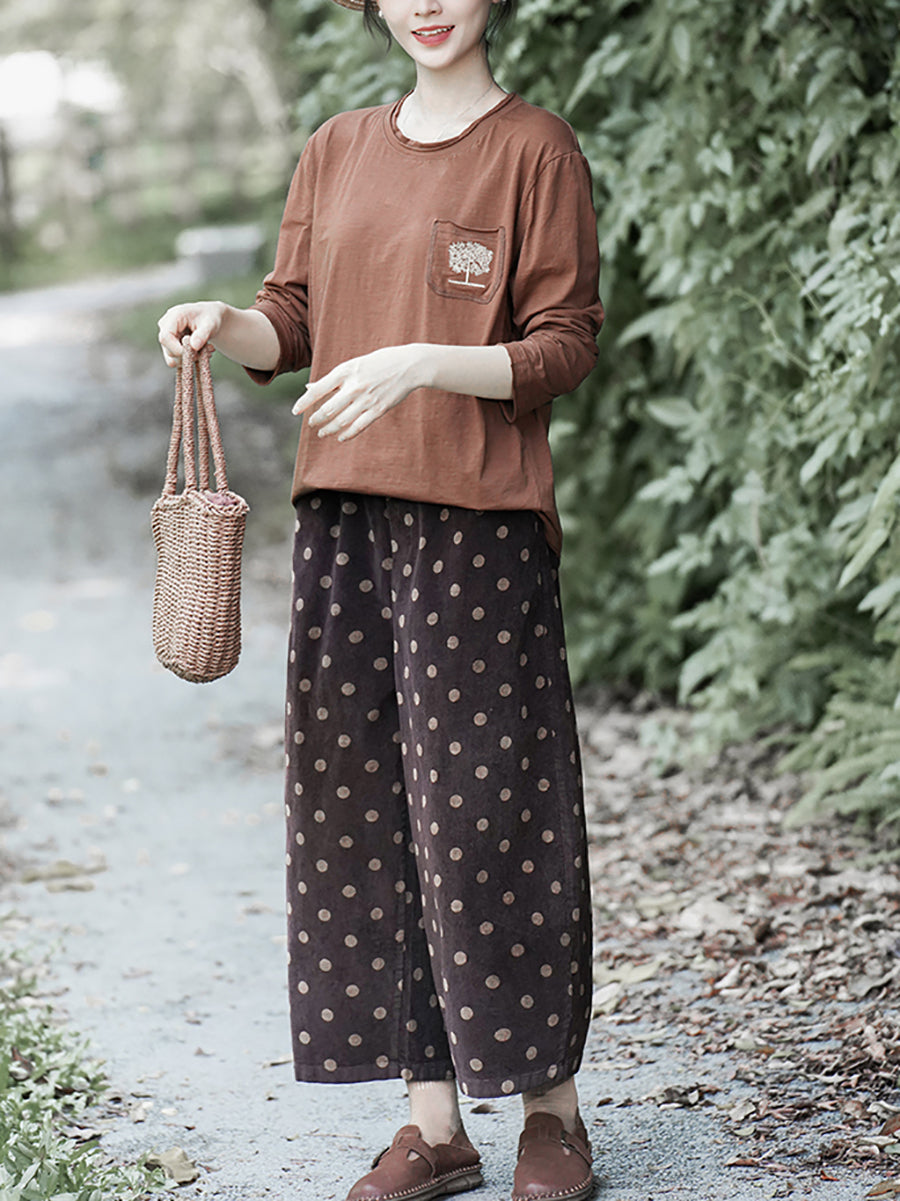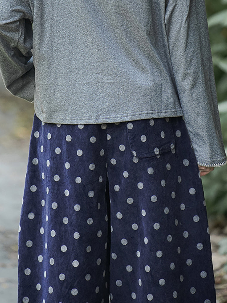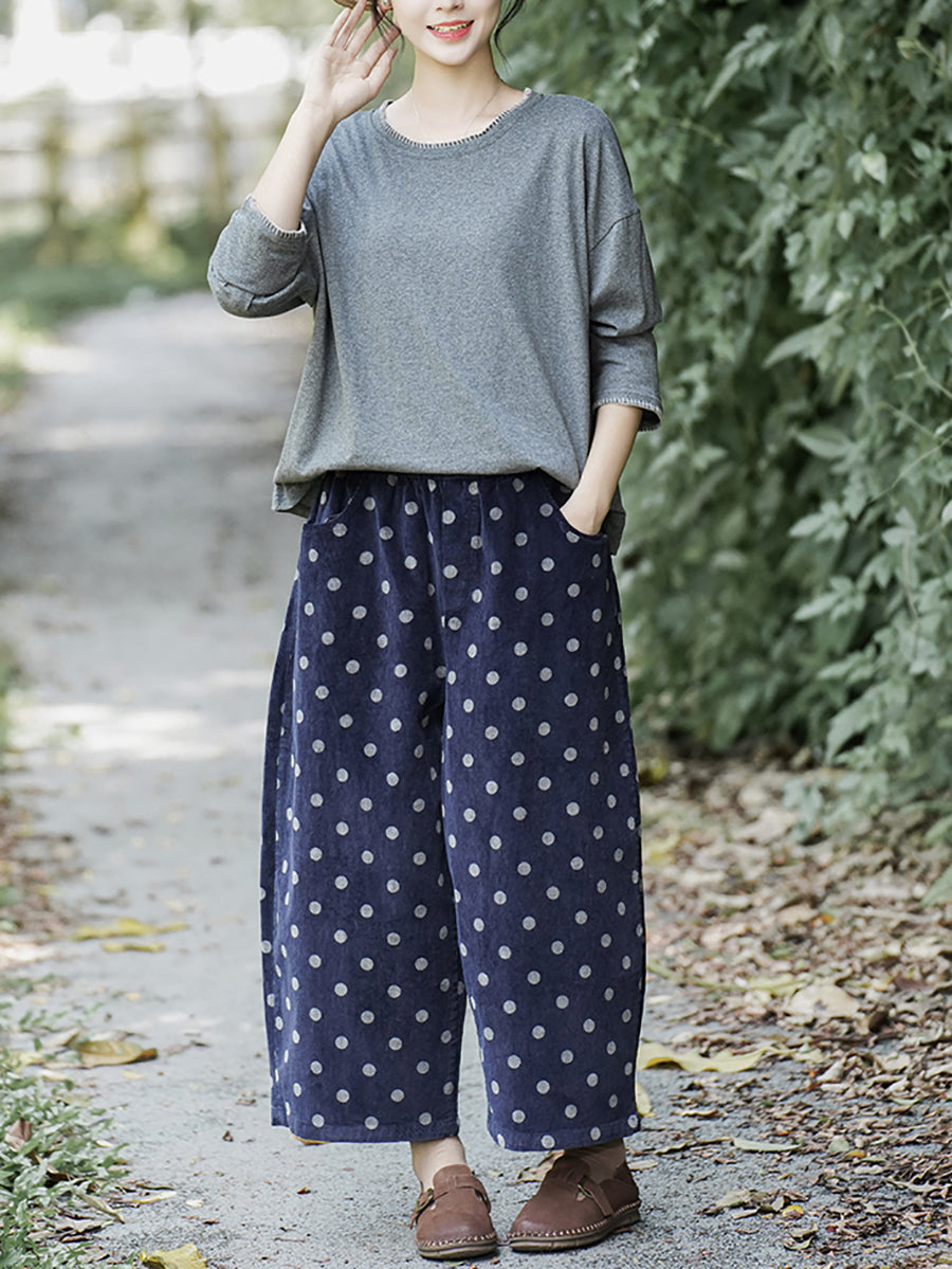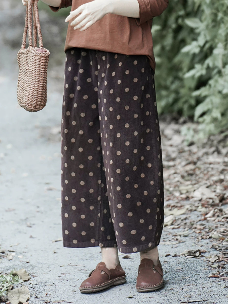 Dámské zimní retro bavlněné kalhoty s puntíky a širokými nohavicemi