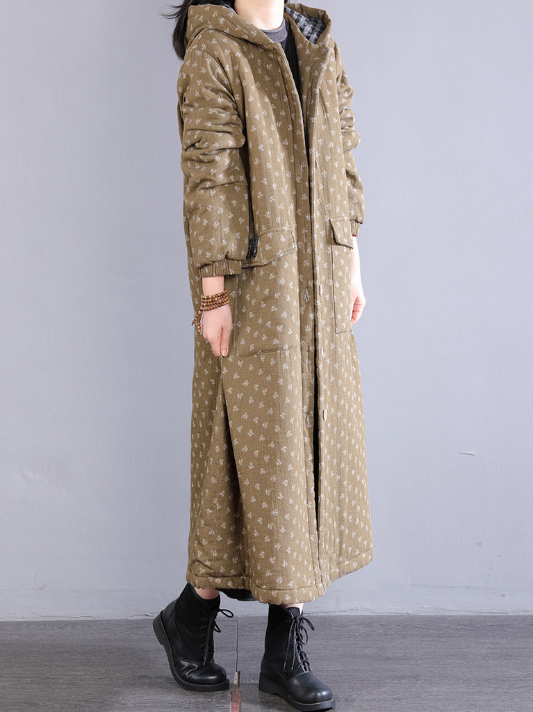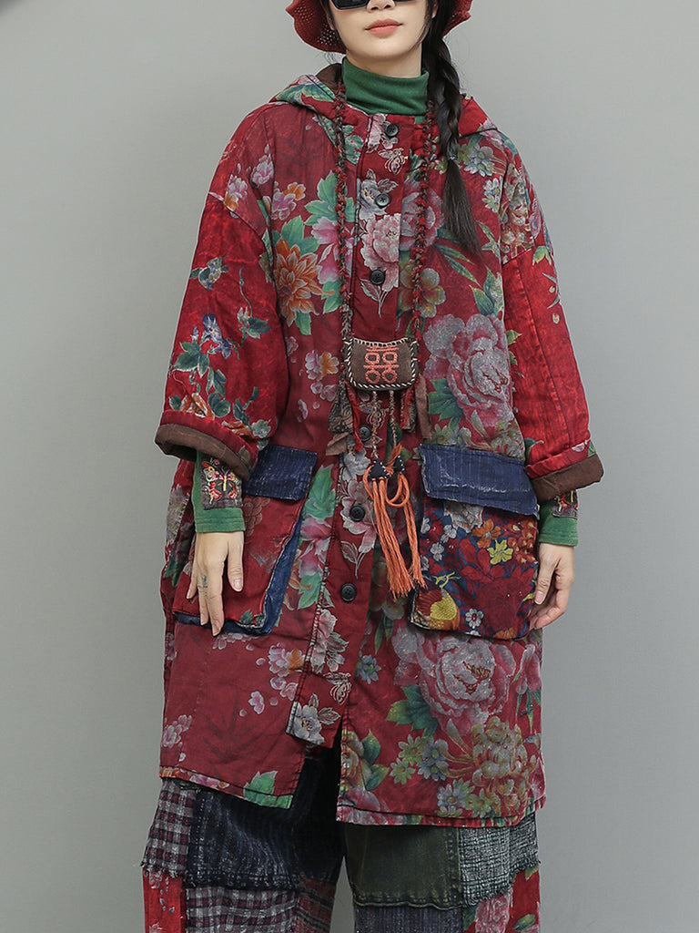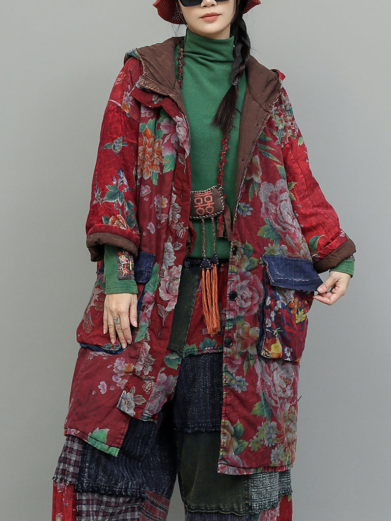 Dámský zimní retro bavlněný kabát s kapucí a květinovým vzorem