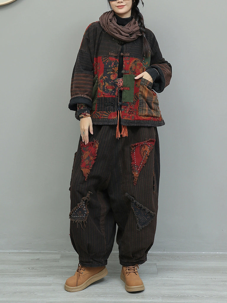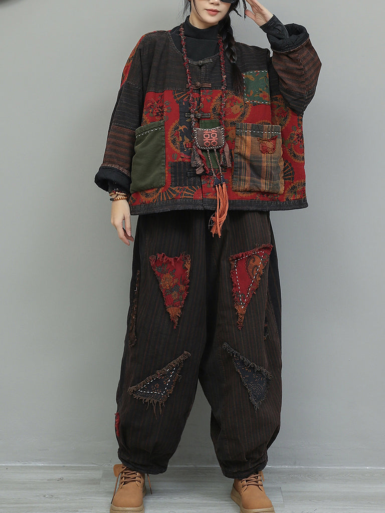 Dámské zimní retro květinové patchworkové obleky s výstřihem do O-neck a prošívanou podšívkou