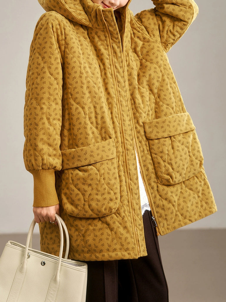 Dámský zimní umělecký květinový prošívaný kabát s kapucí