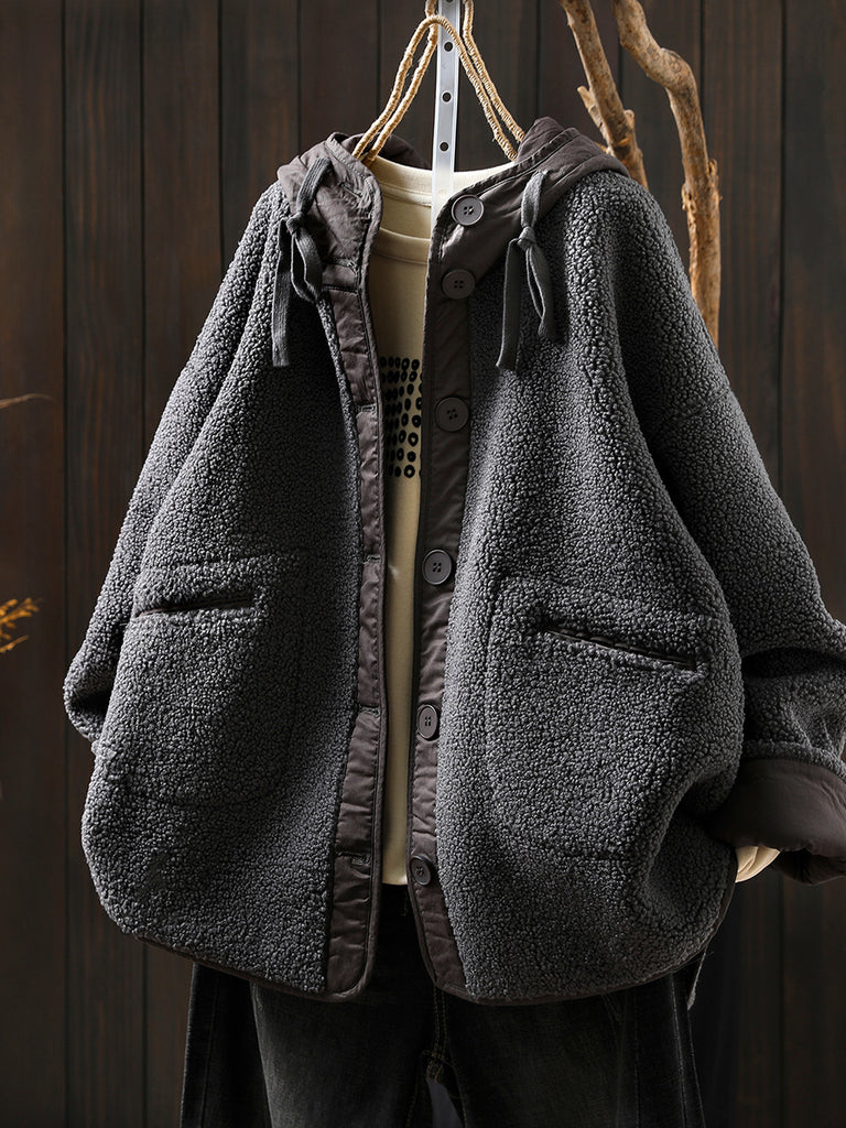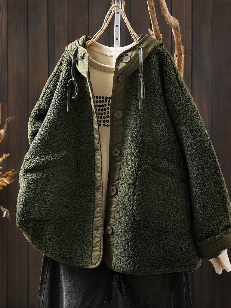Dámský zimní ležérní fleecový kabát s kapucí v čisté barvě