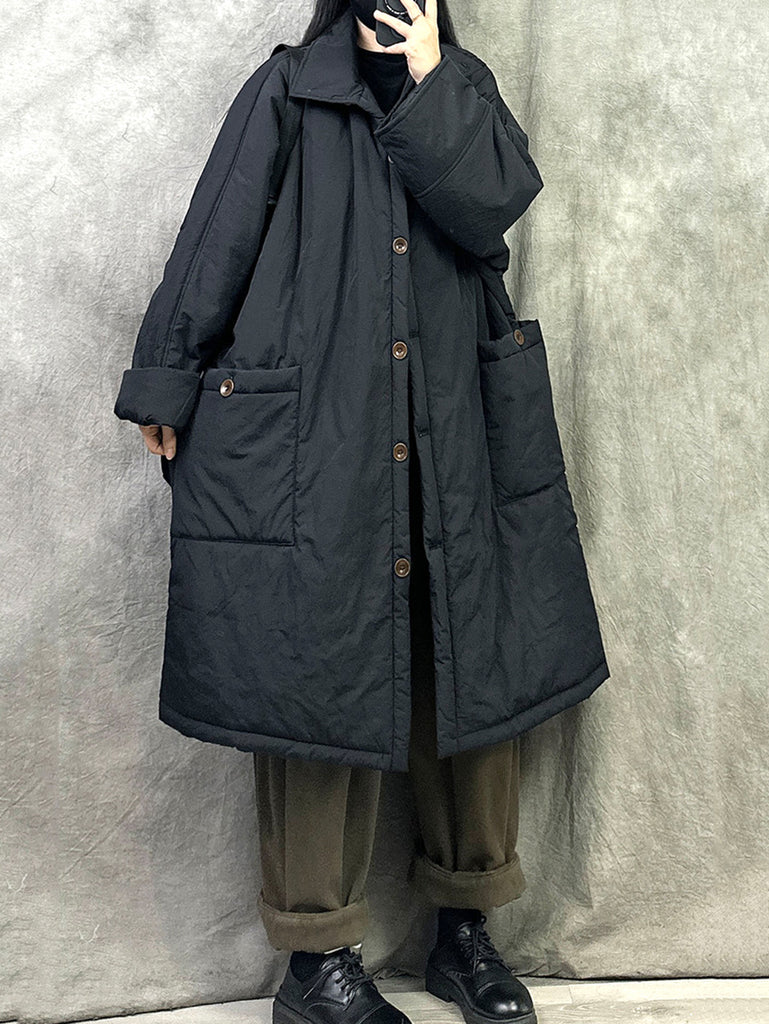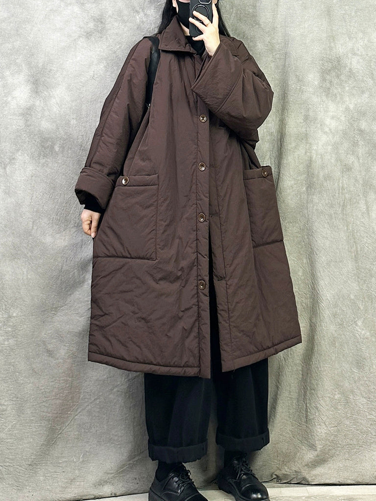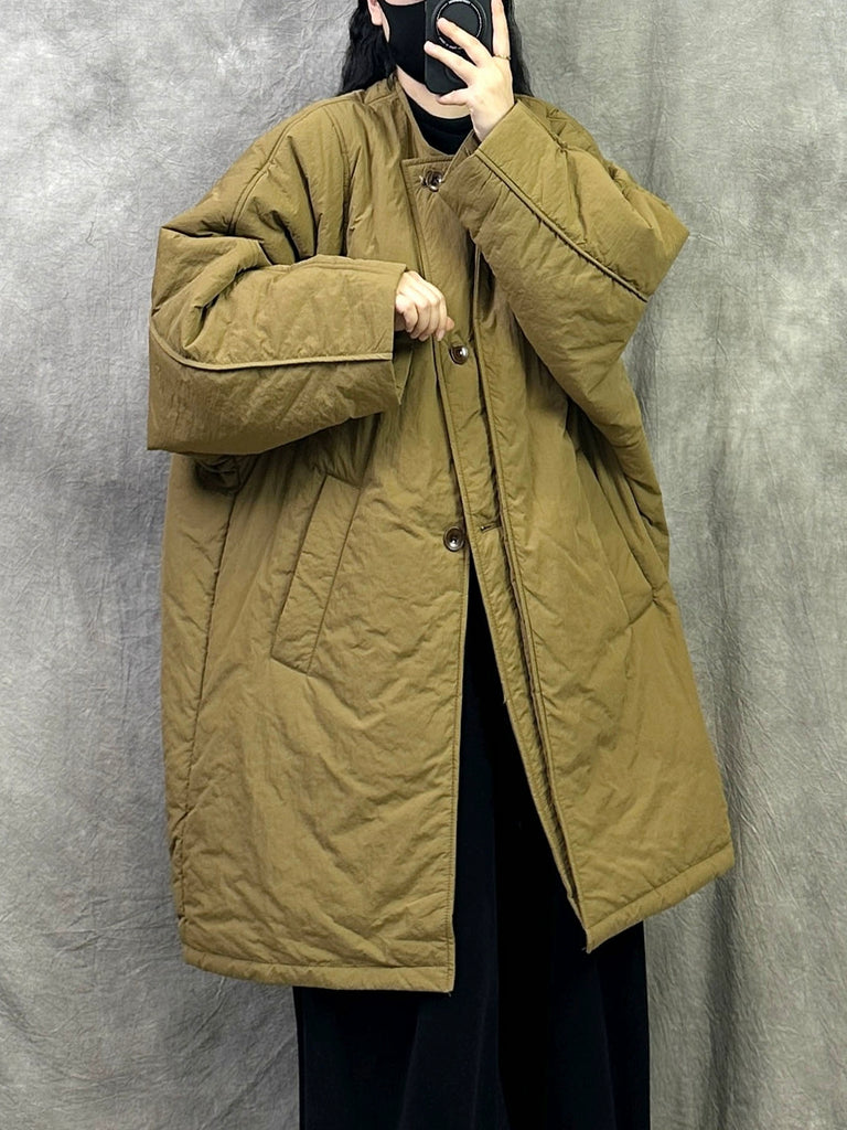 Dámský zimní ležérní čistě barevný prošívaný dlouhý kabát s výstřihem do O-neck