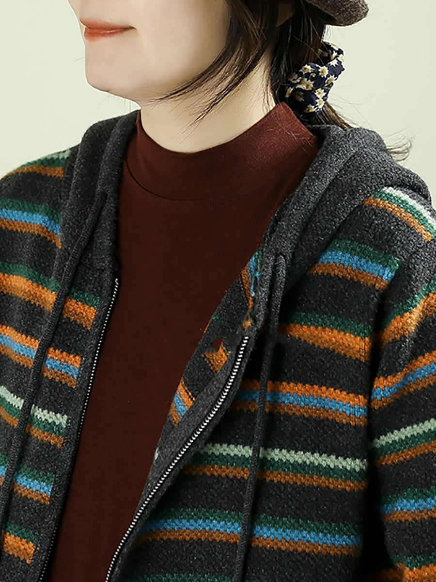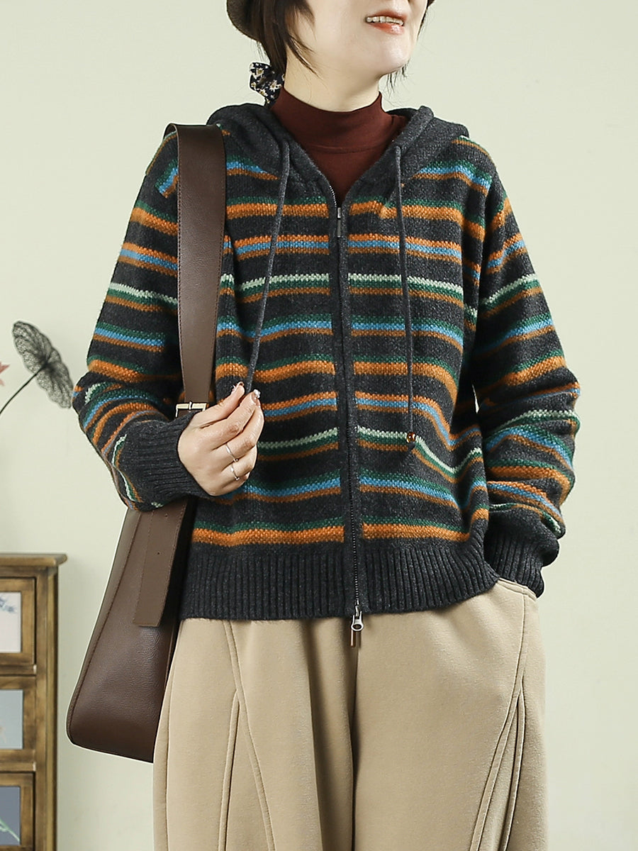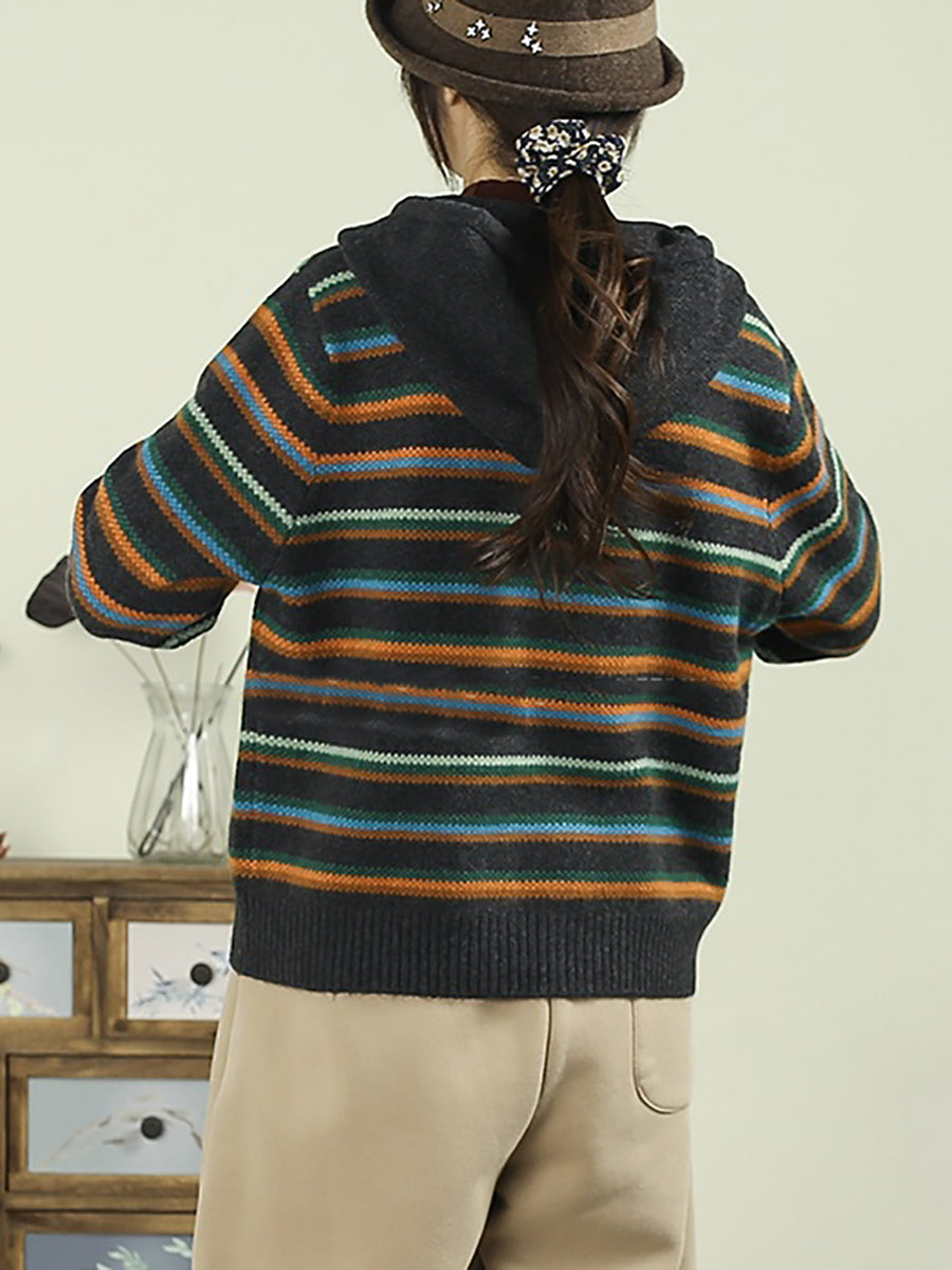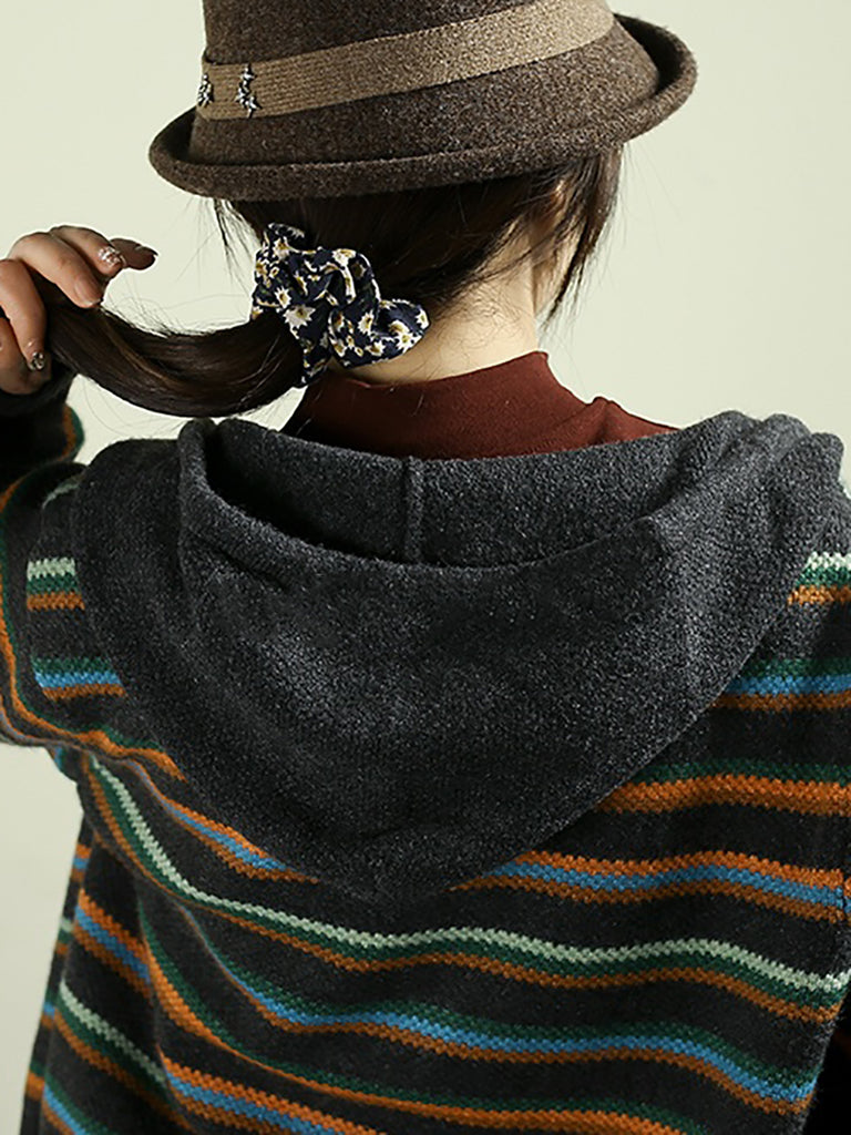 Dámský podzimní retro pruhovaný svetr s kapucí