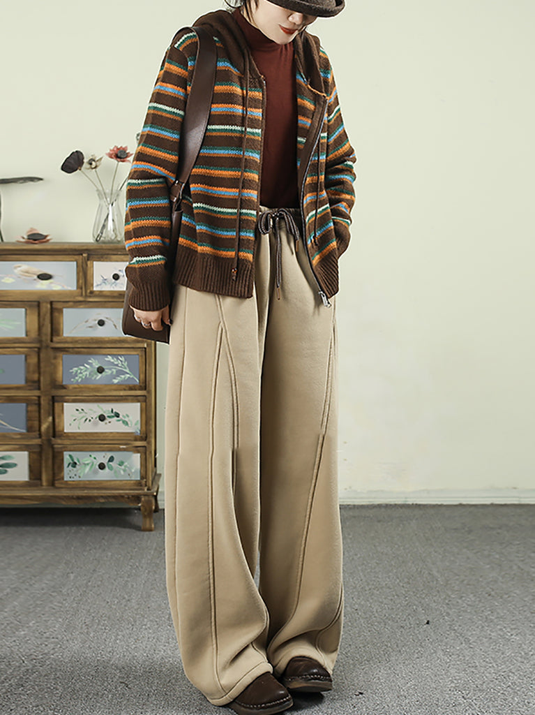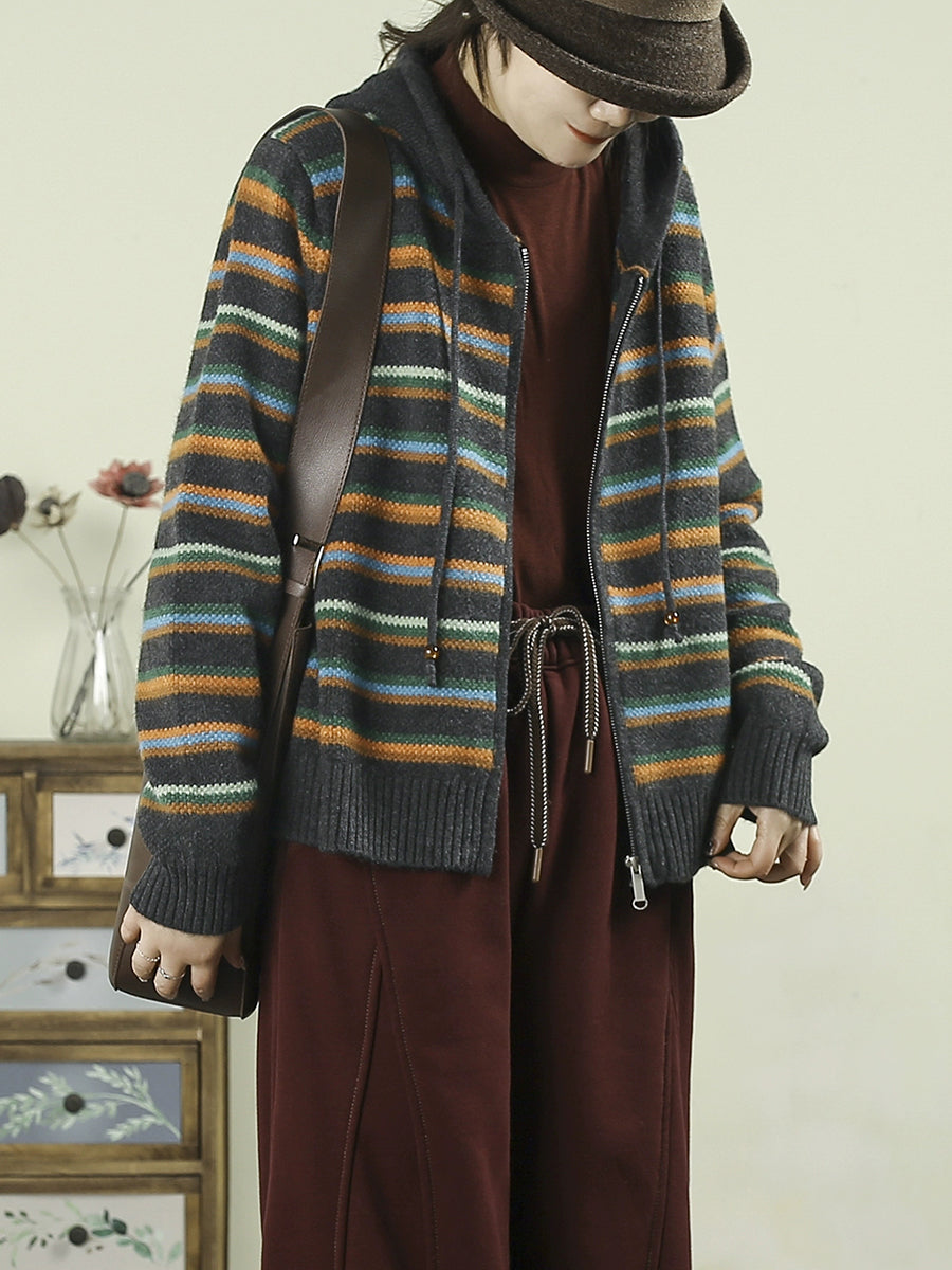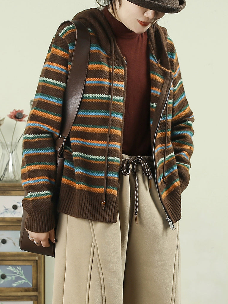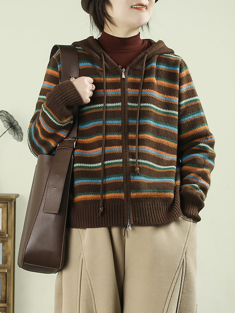 Dámský podzimní retro pruhovaný svetr s kapucí