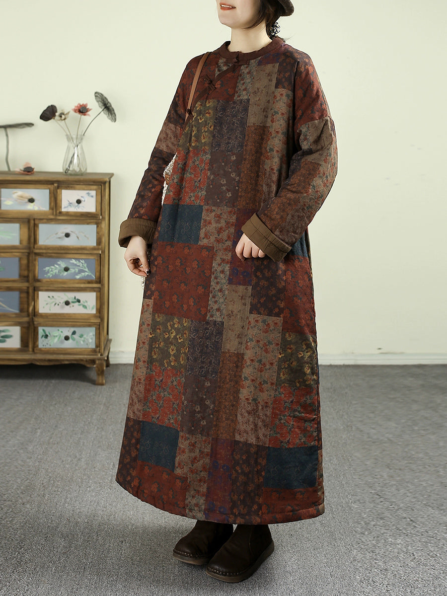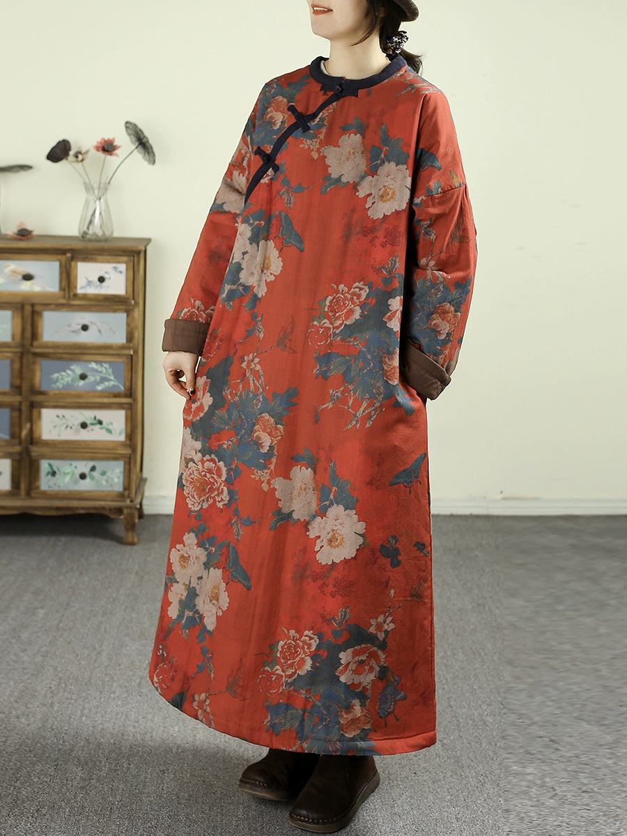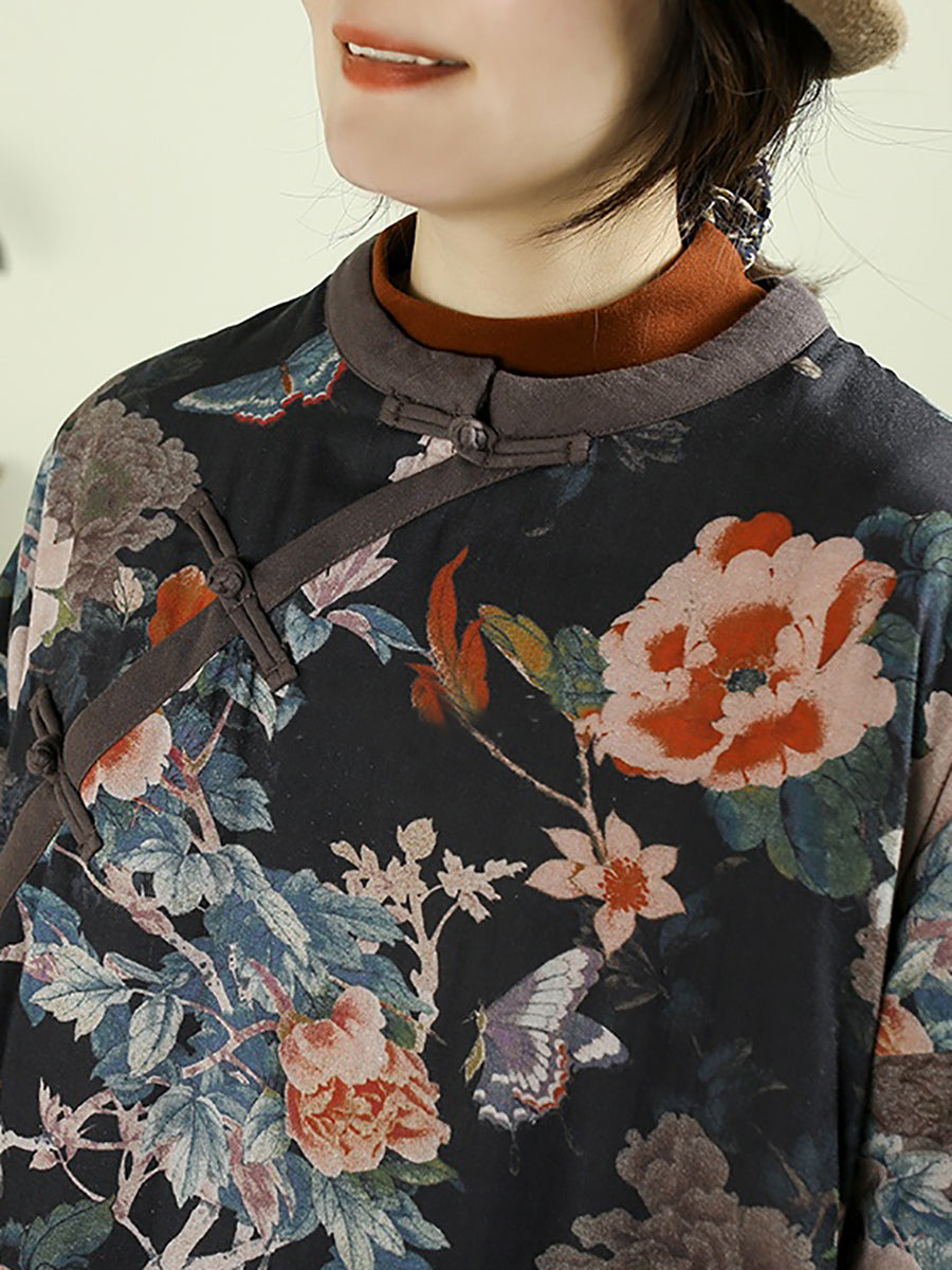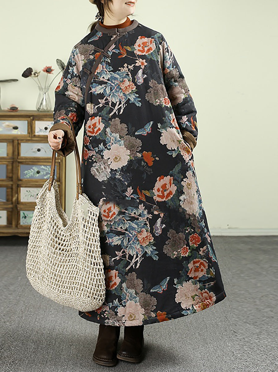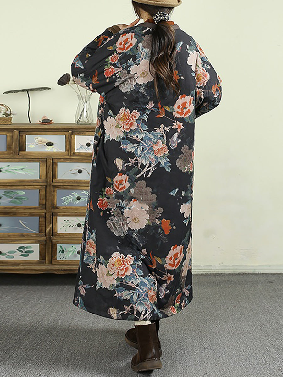 Dámský zimní květinový kabát s výstřihem do O-kroju, 100% bavlna, prošívaný