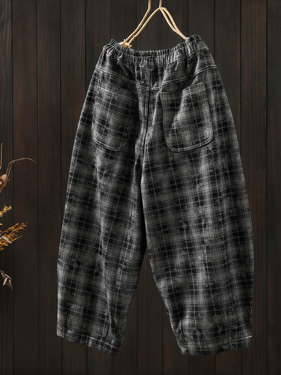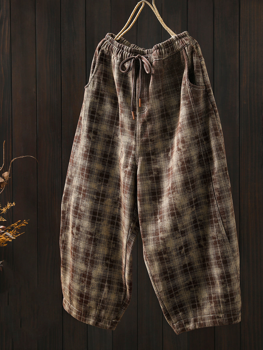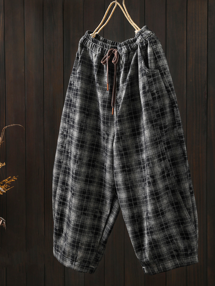 Dámské zimní retro kostkované harémové kalhoty s fleecovou podšívkou