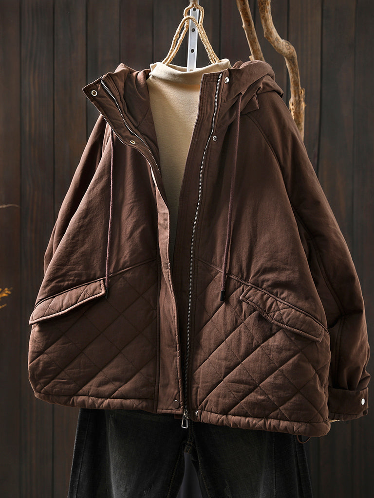 Dámský zimní ležérní čistě barevný prošívaný kabát s kapucí