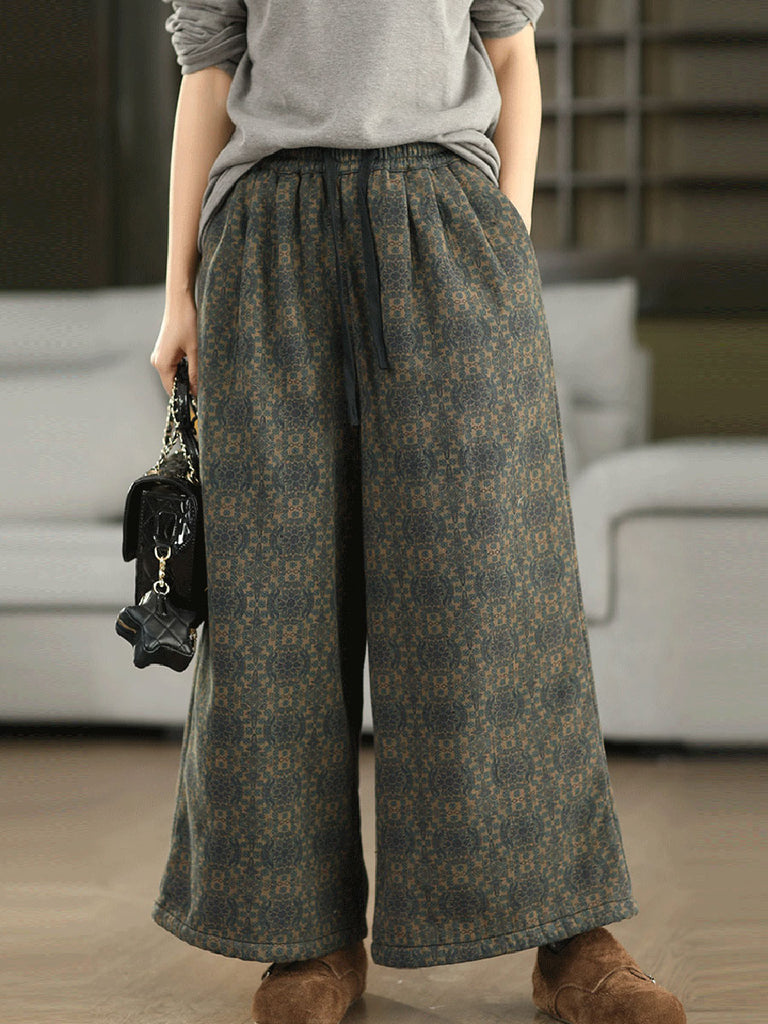 Dámské zimní retro květinové fleecové kalhoty rovného střihu