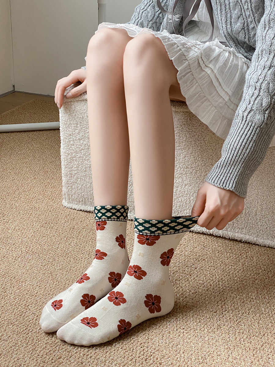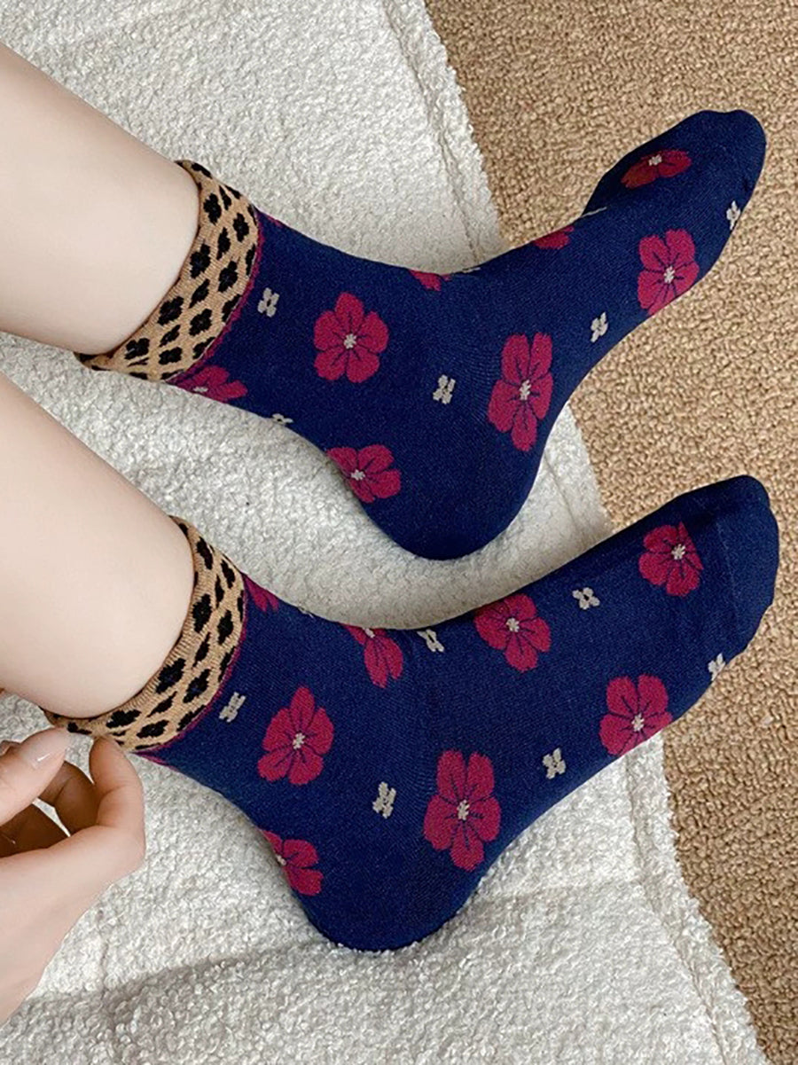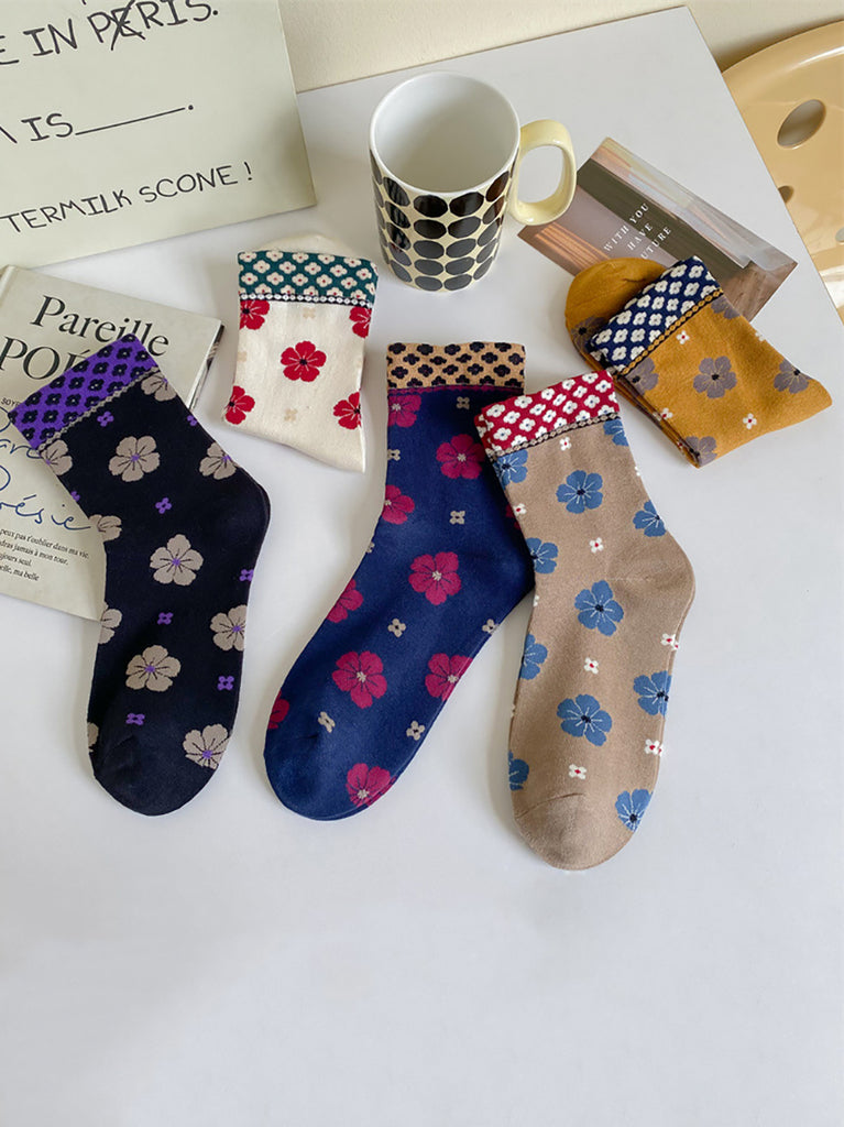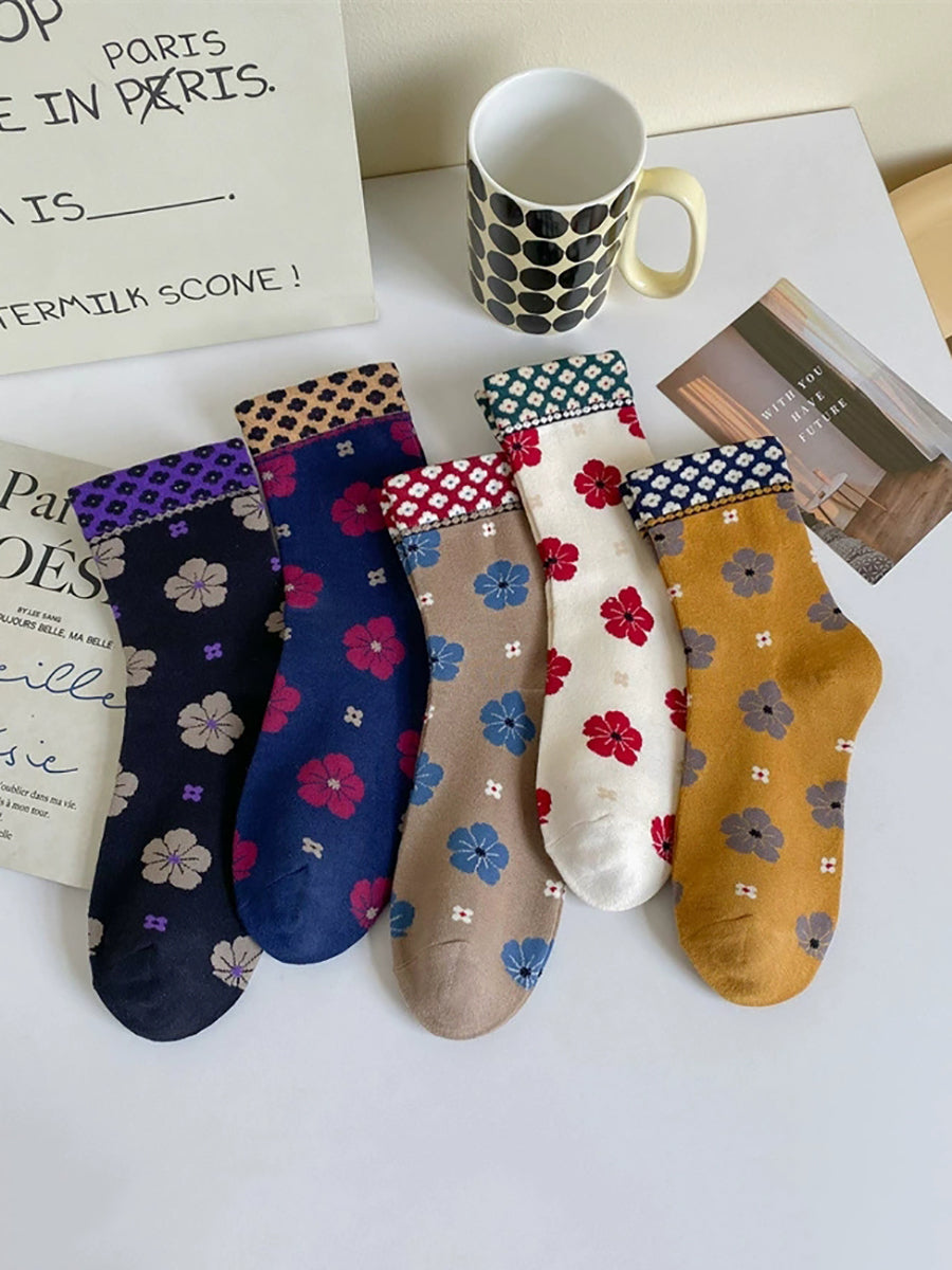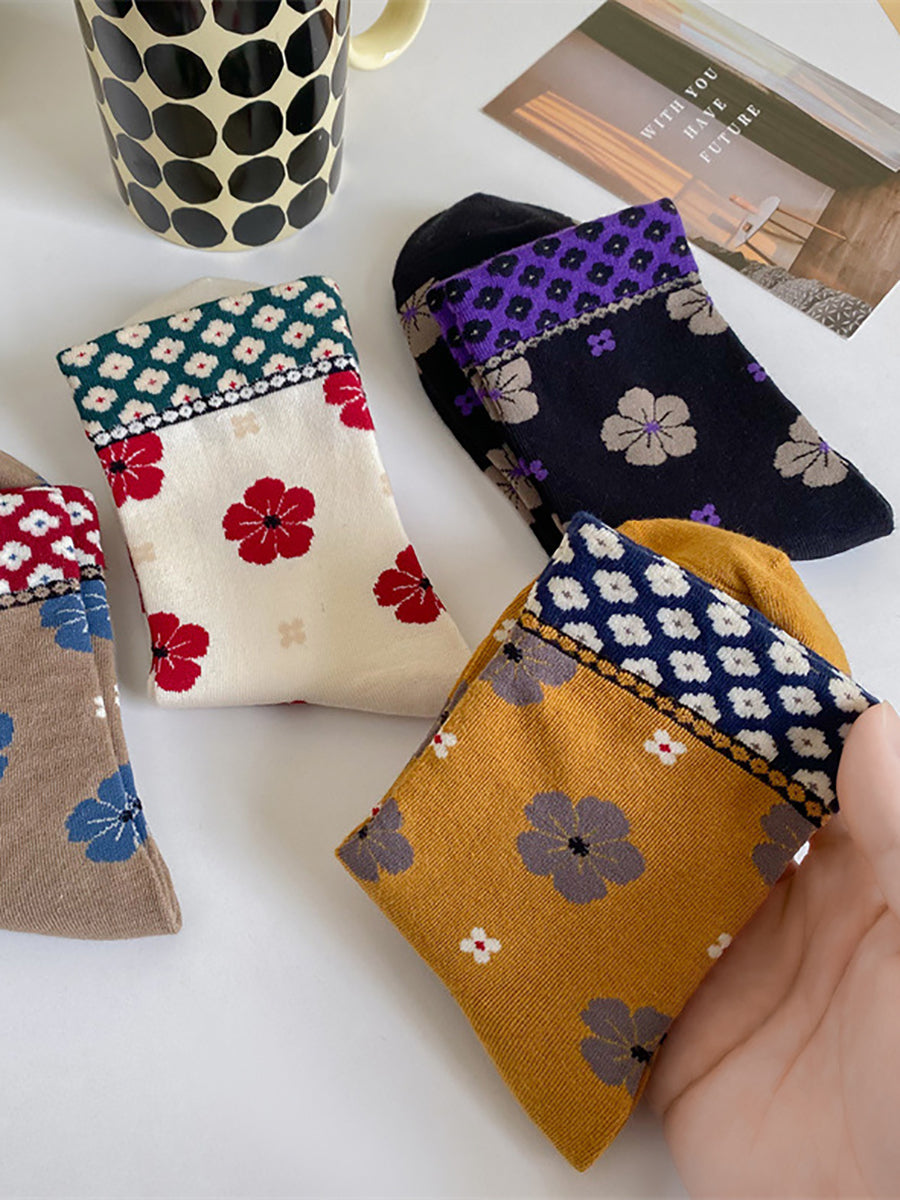 5 párů dámských bavlněných ponožek s uměleckým květinovým vzorem