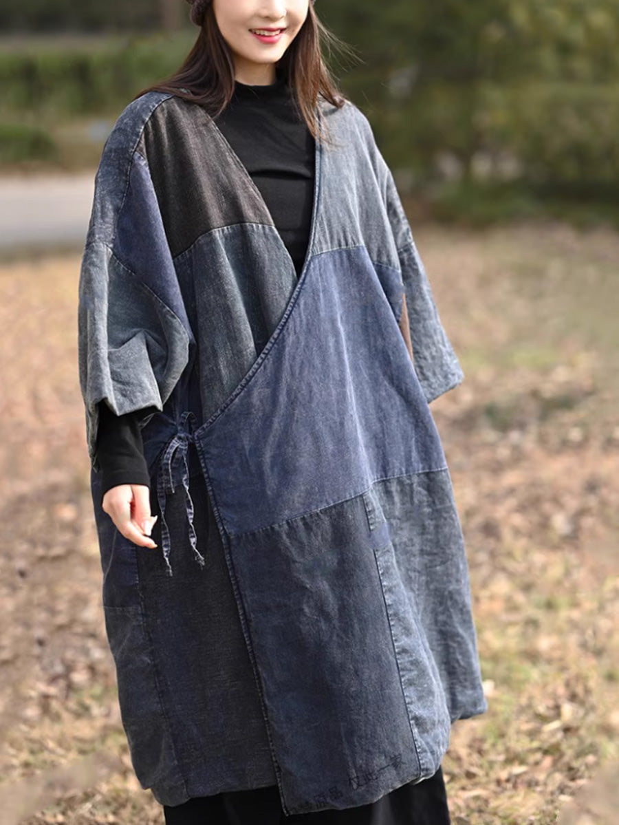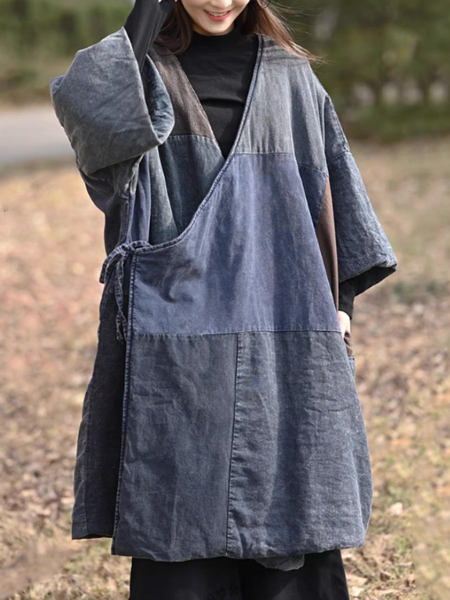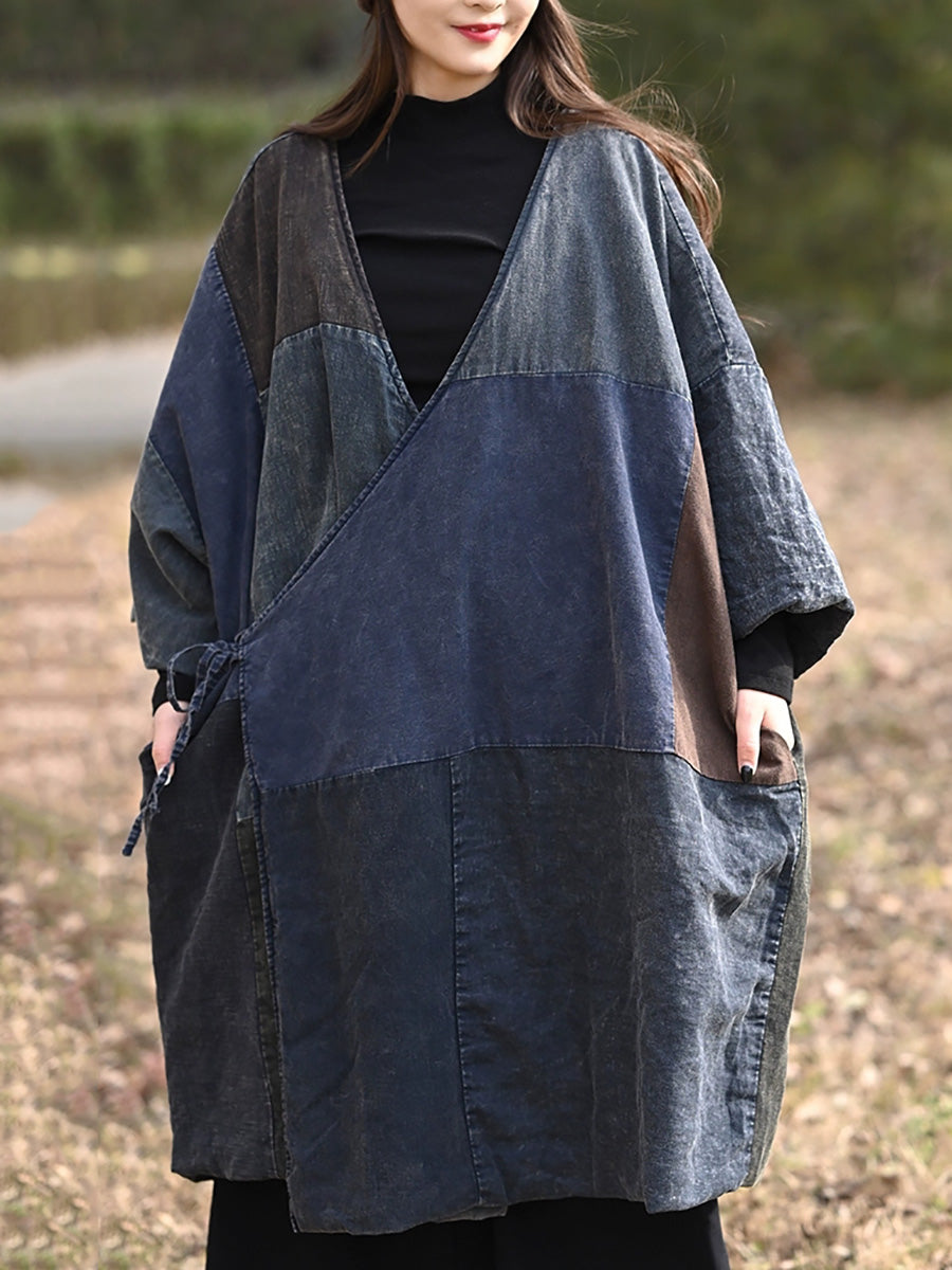 Dámský retro bavlněný prošívaný kabát s barevnými bloky a výstřihem do V