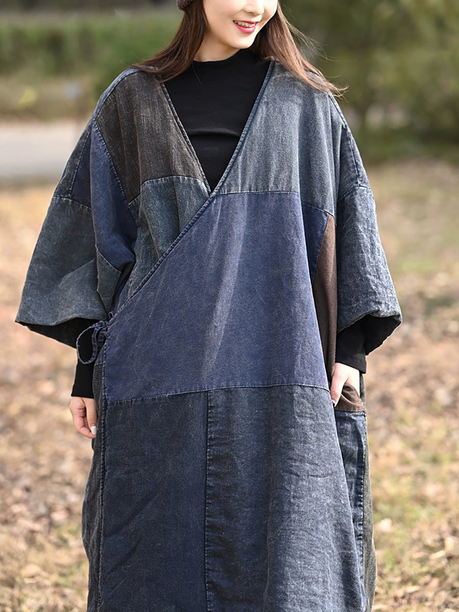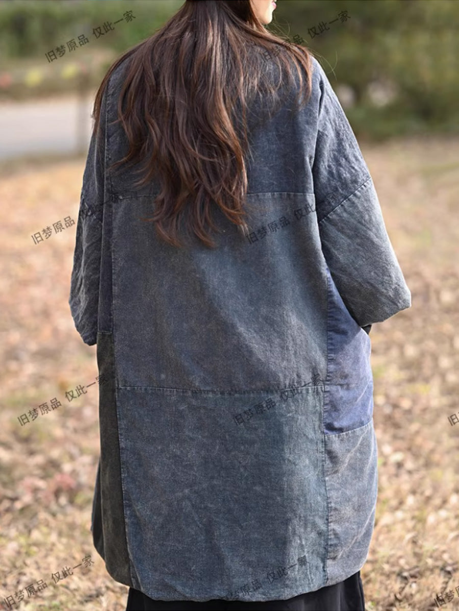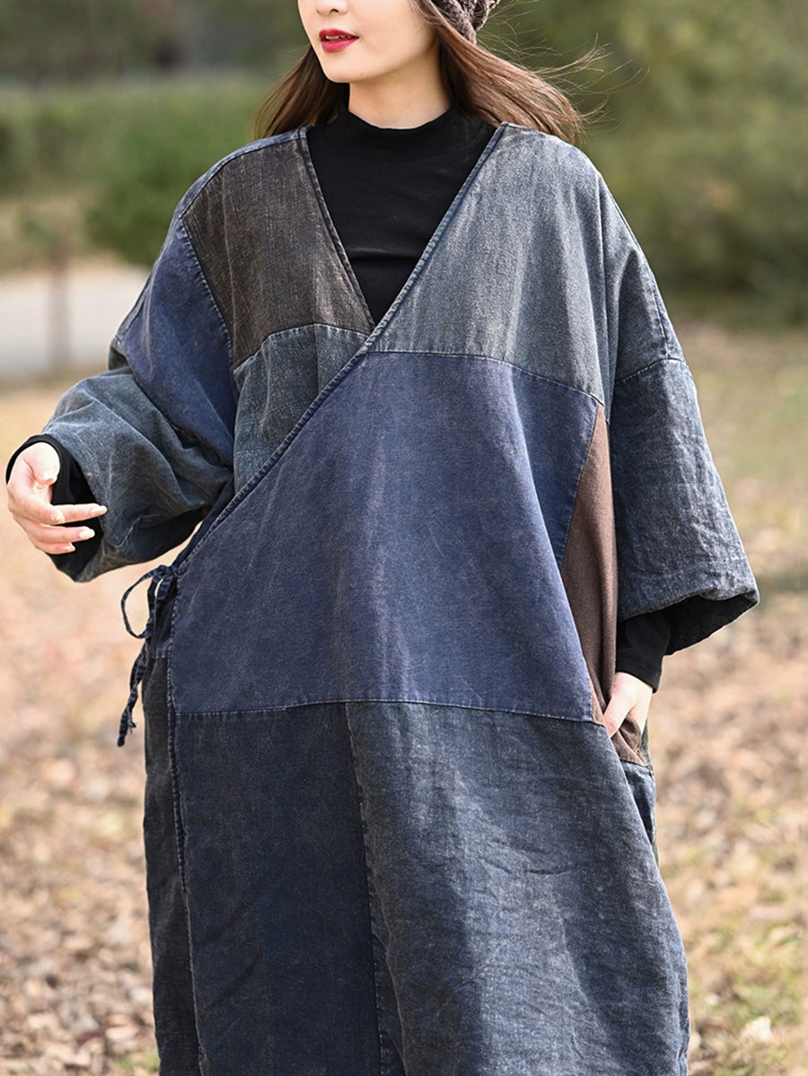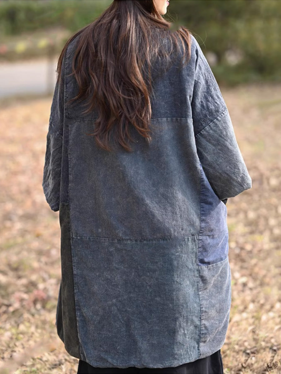 Dámský retro bavlněný prošívaný kabát s barevnými bloky a výstřihem do V
