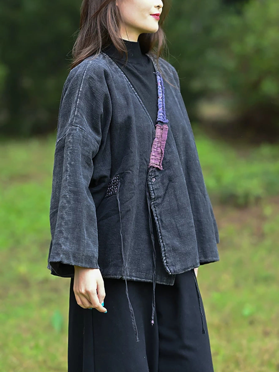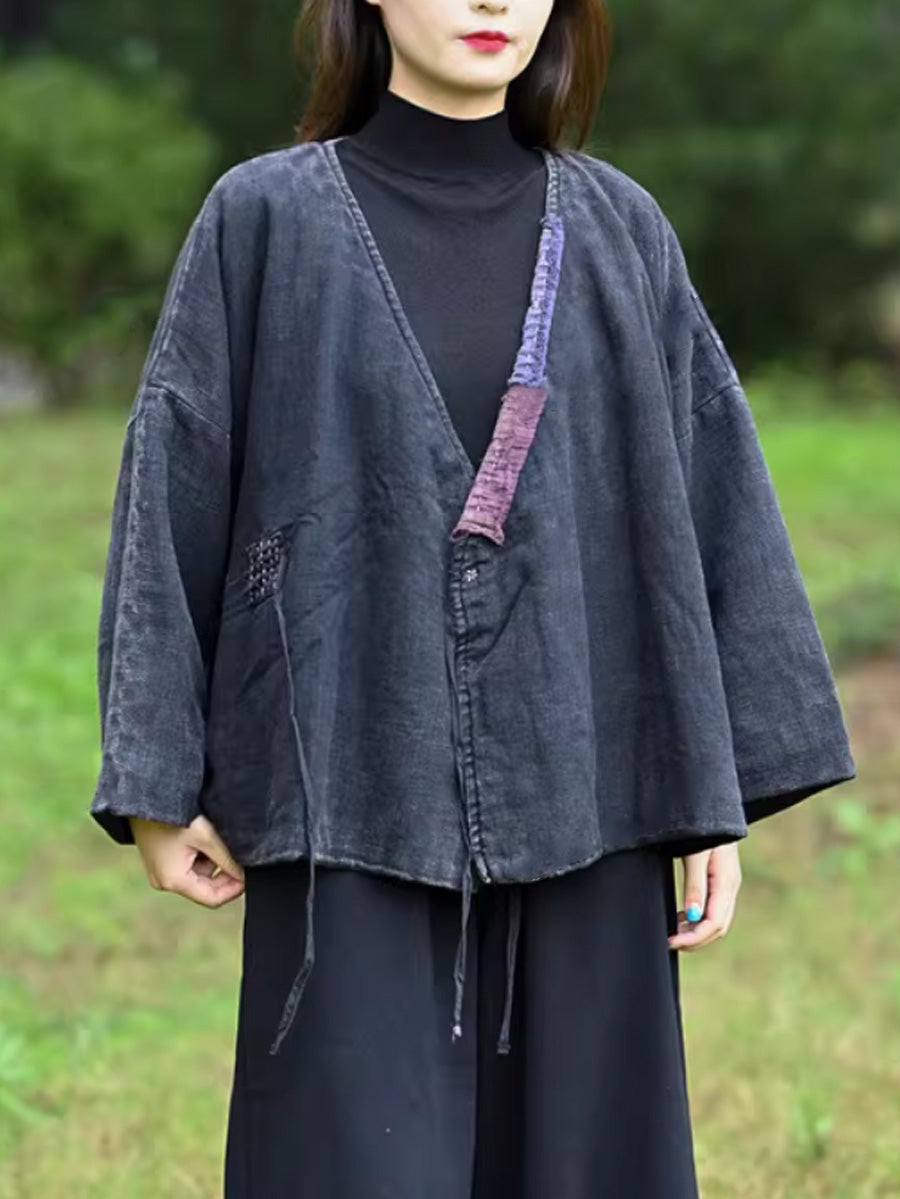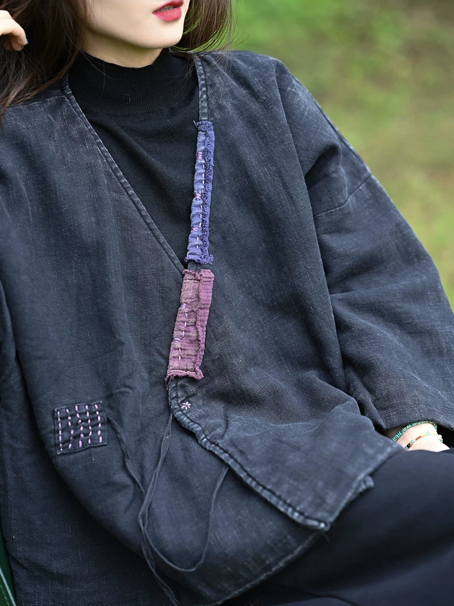 Dámský zimní retro patchworkový kabát s výstřihem do V