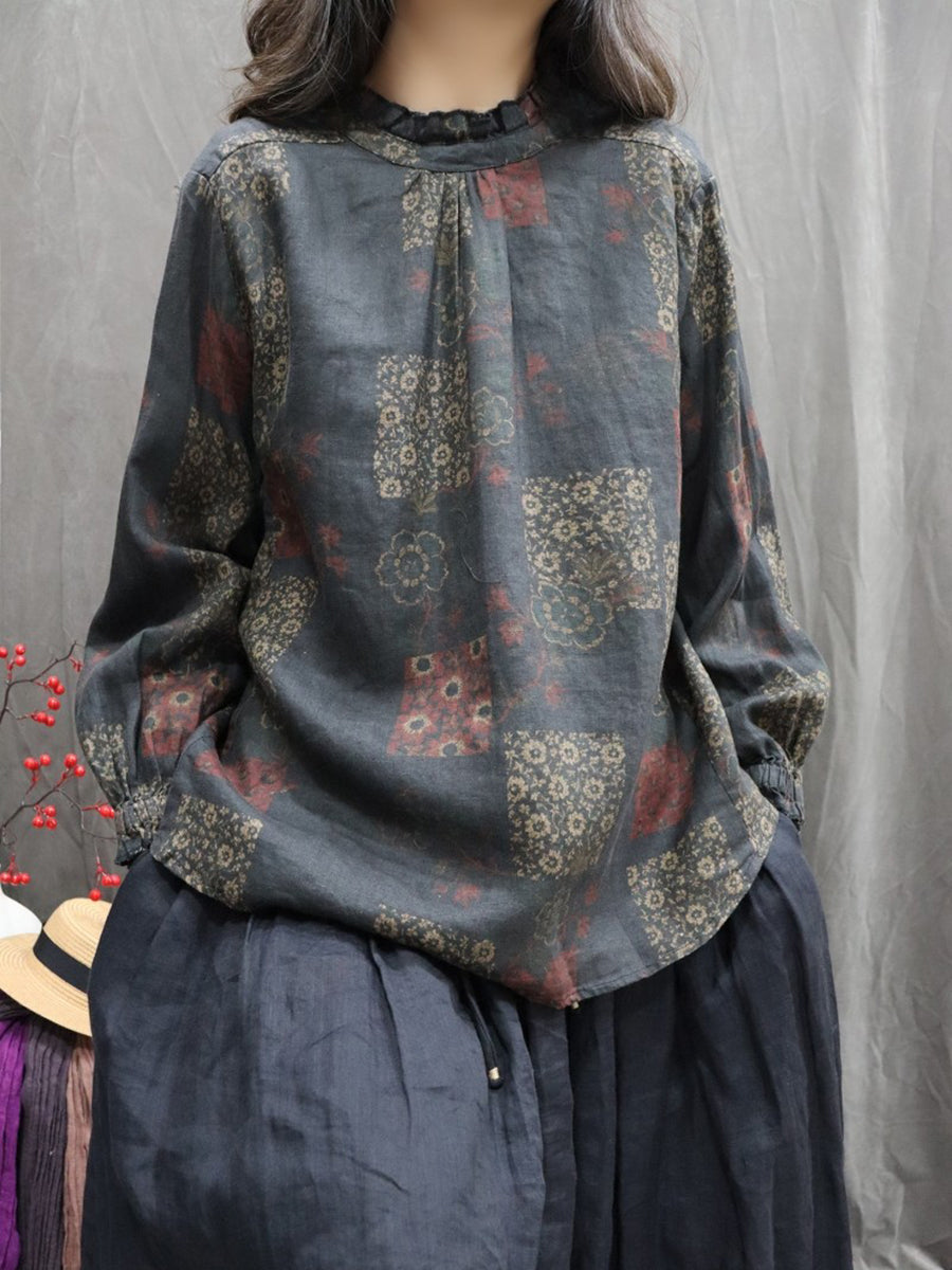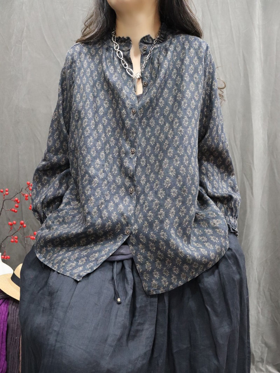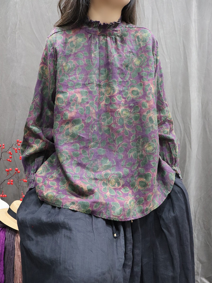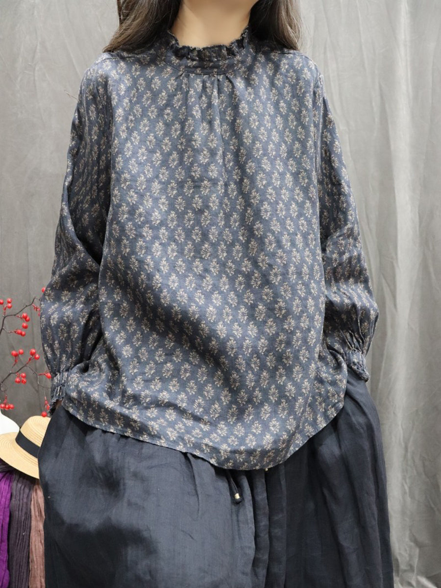 Dámská jarní umělecká květinová košile se stojáčkem, 100% lněný vzor