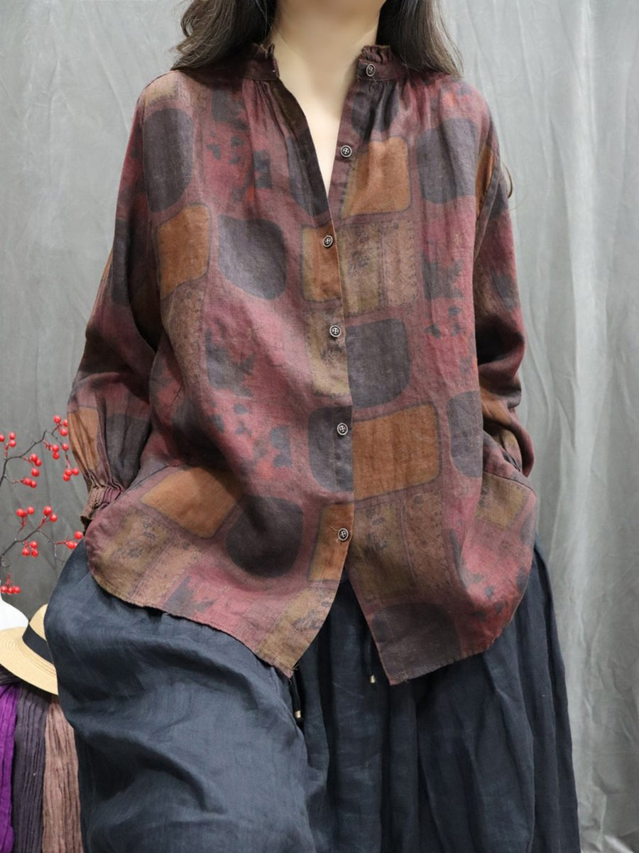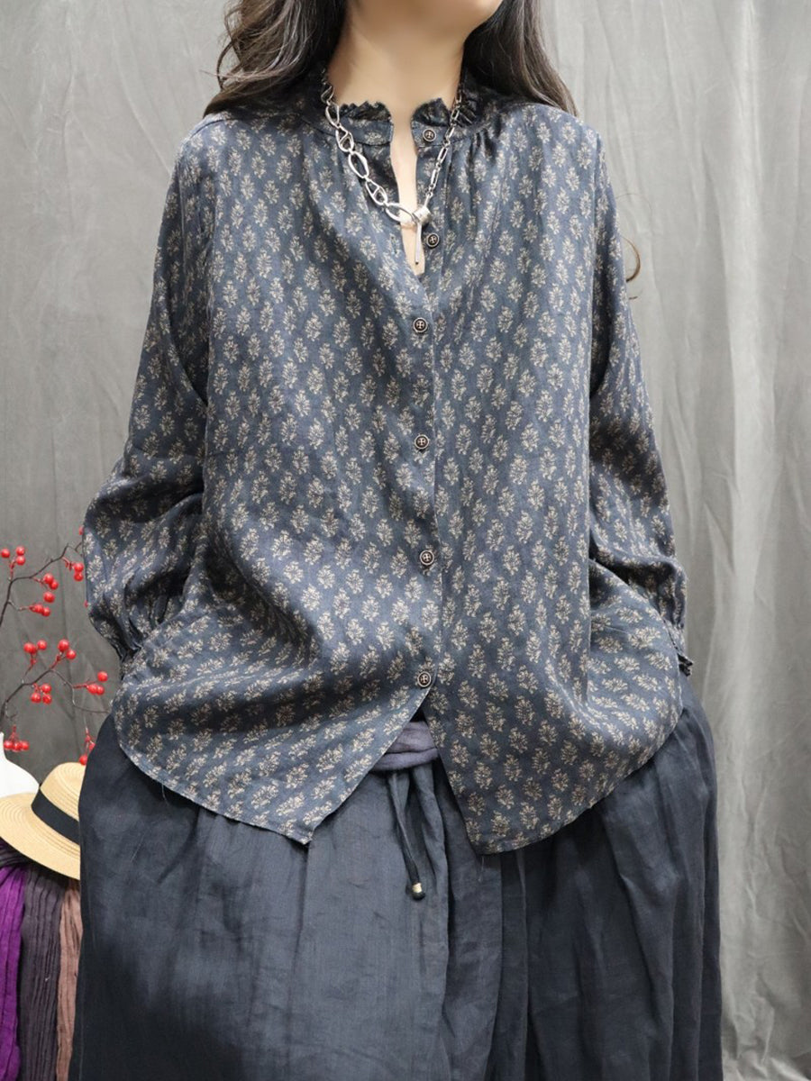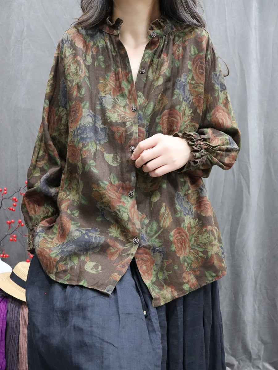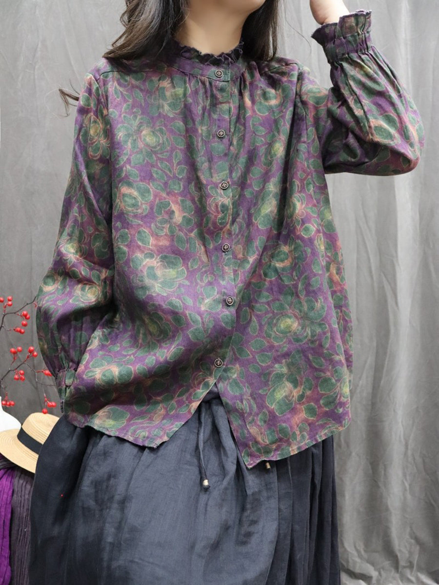 Dámská jarní umělecká květinová košile se stojáčkem, 100% lněný vzor