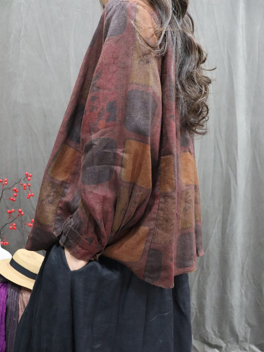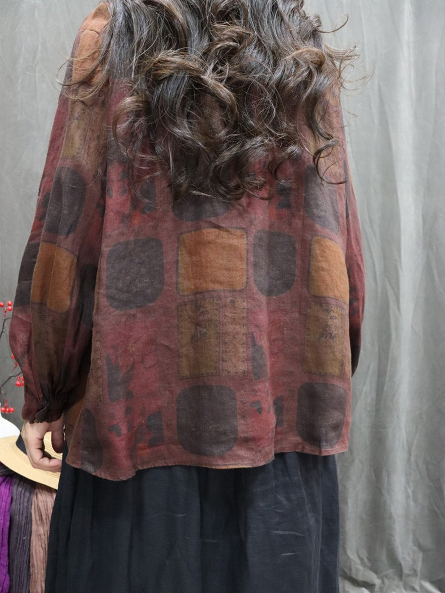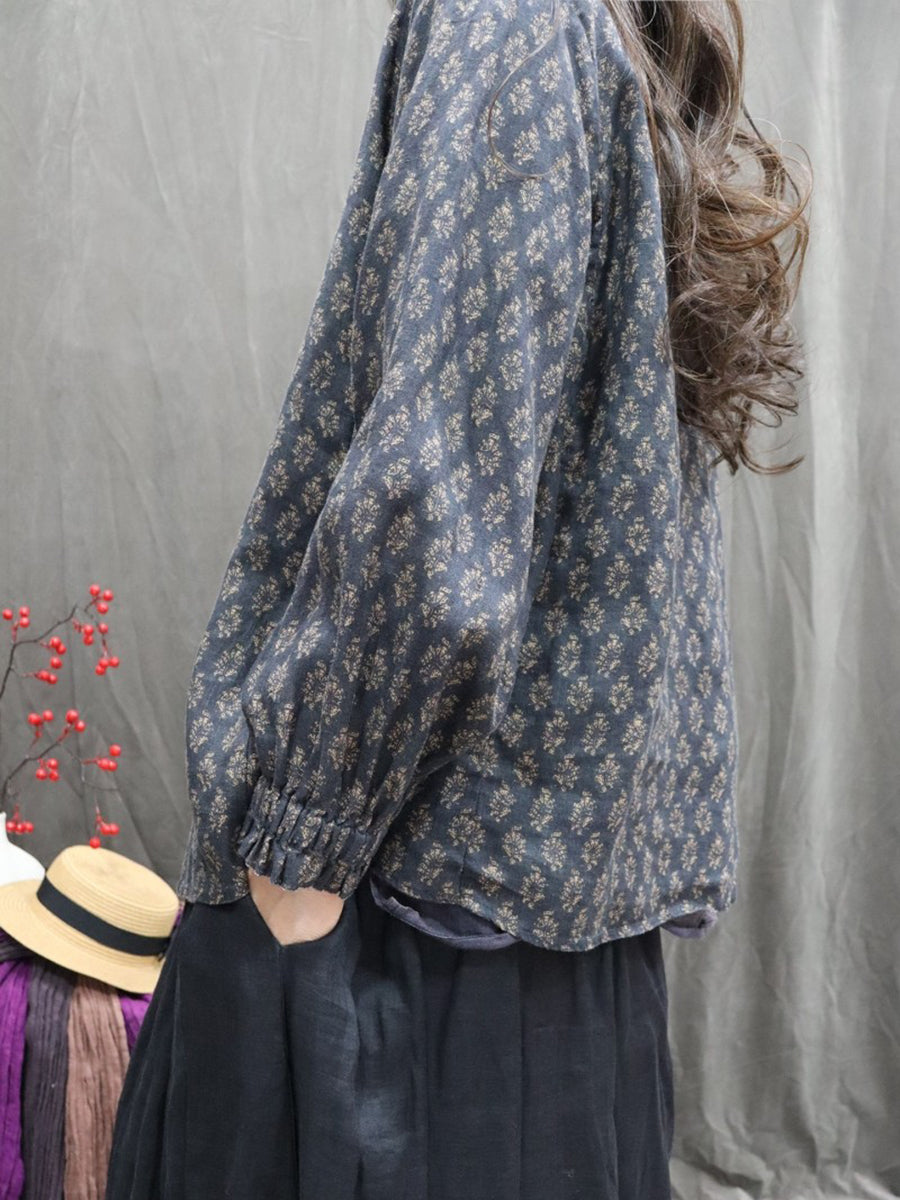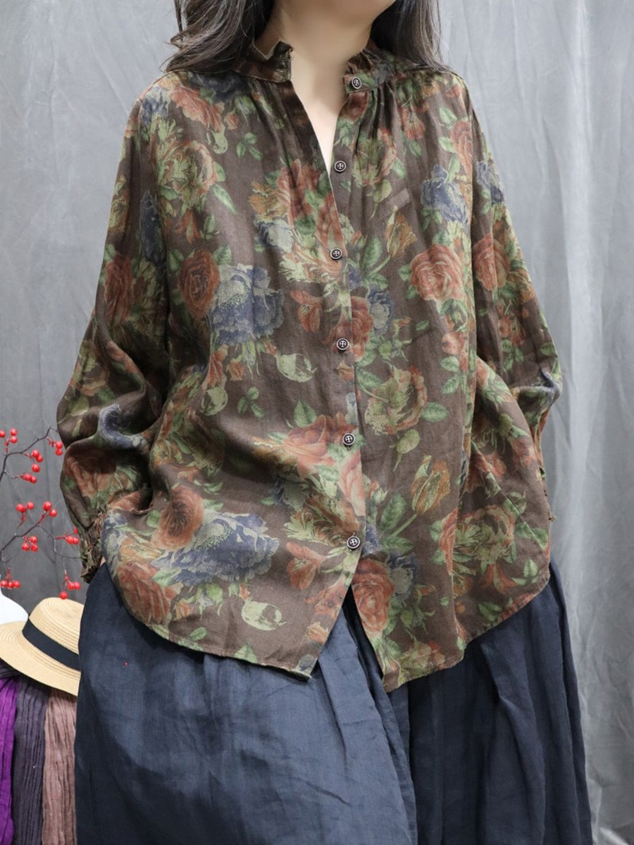 Dámská jarní umělecká květinová košile se stojáčkem, 100% lněný vzor