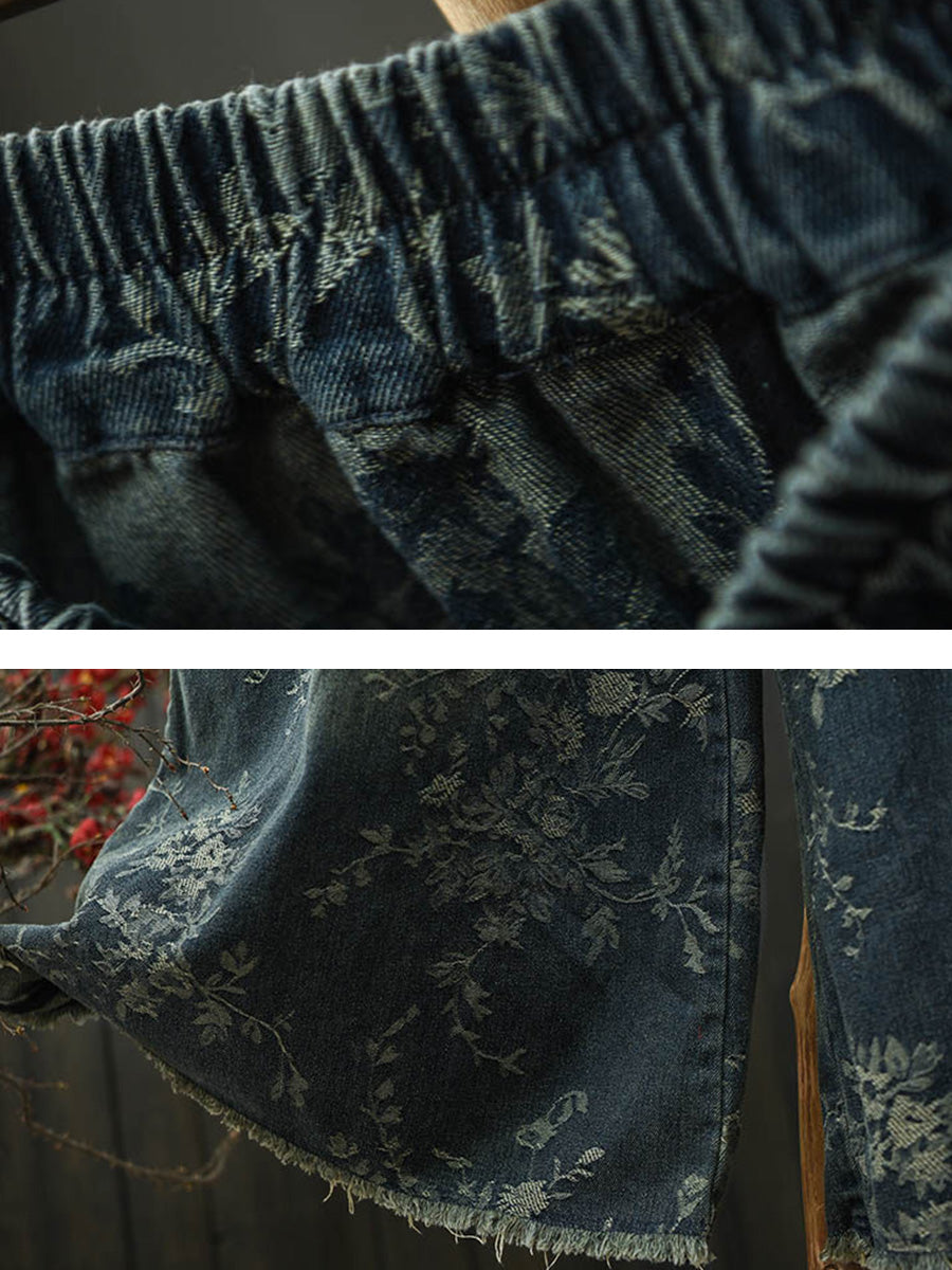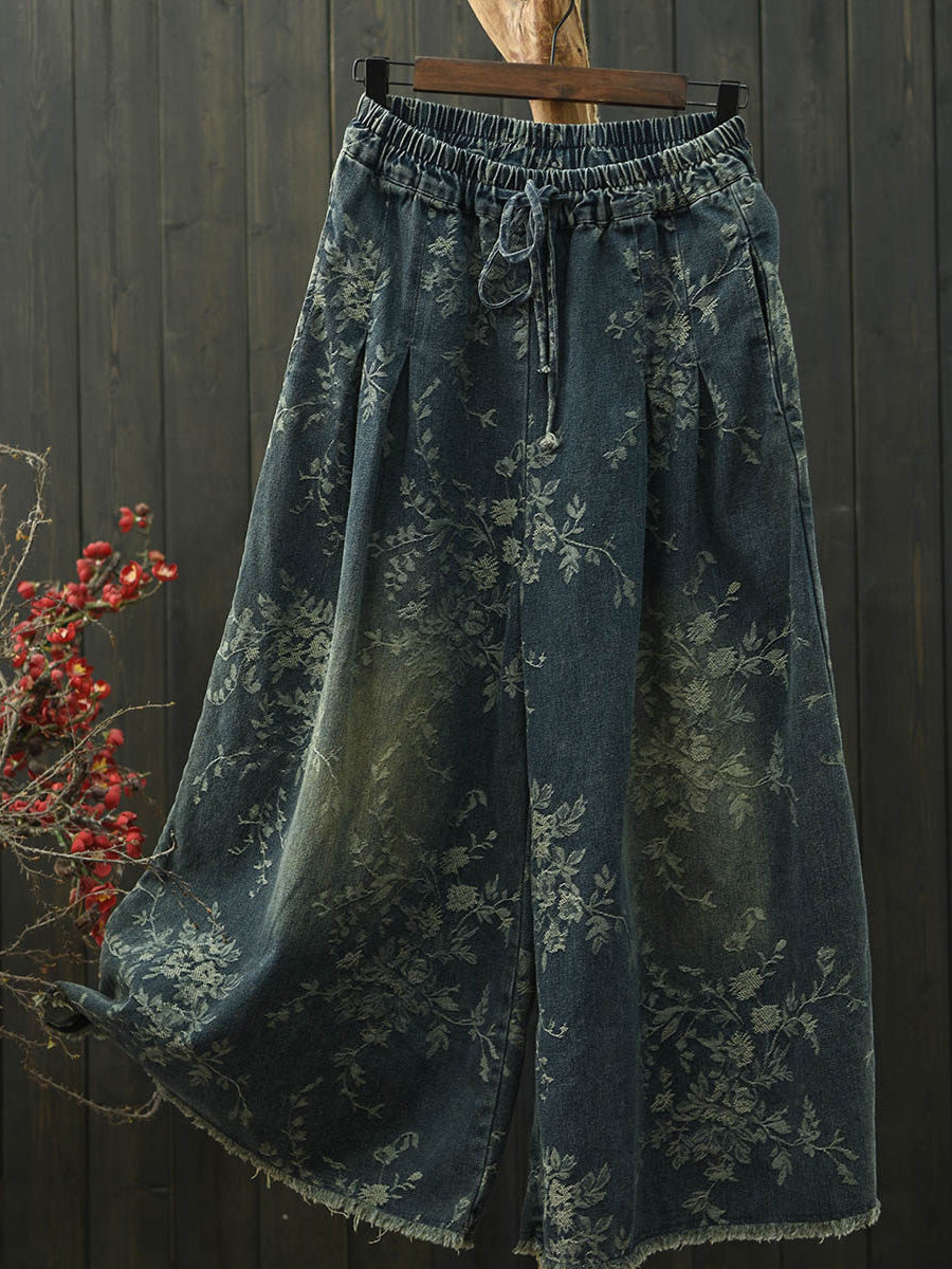 Dámské jarní vintage květinové džínové kalhoty s širokými nohavicemi
