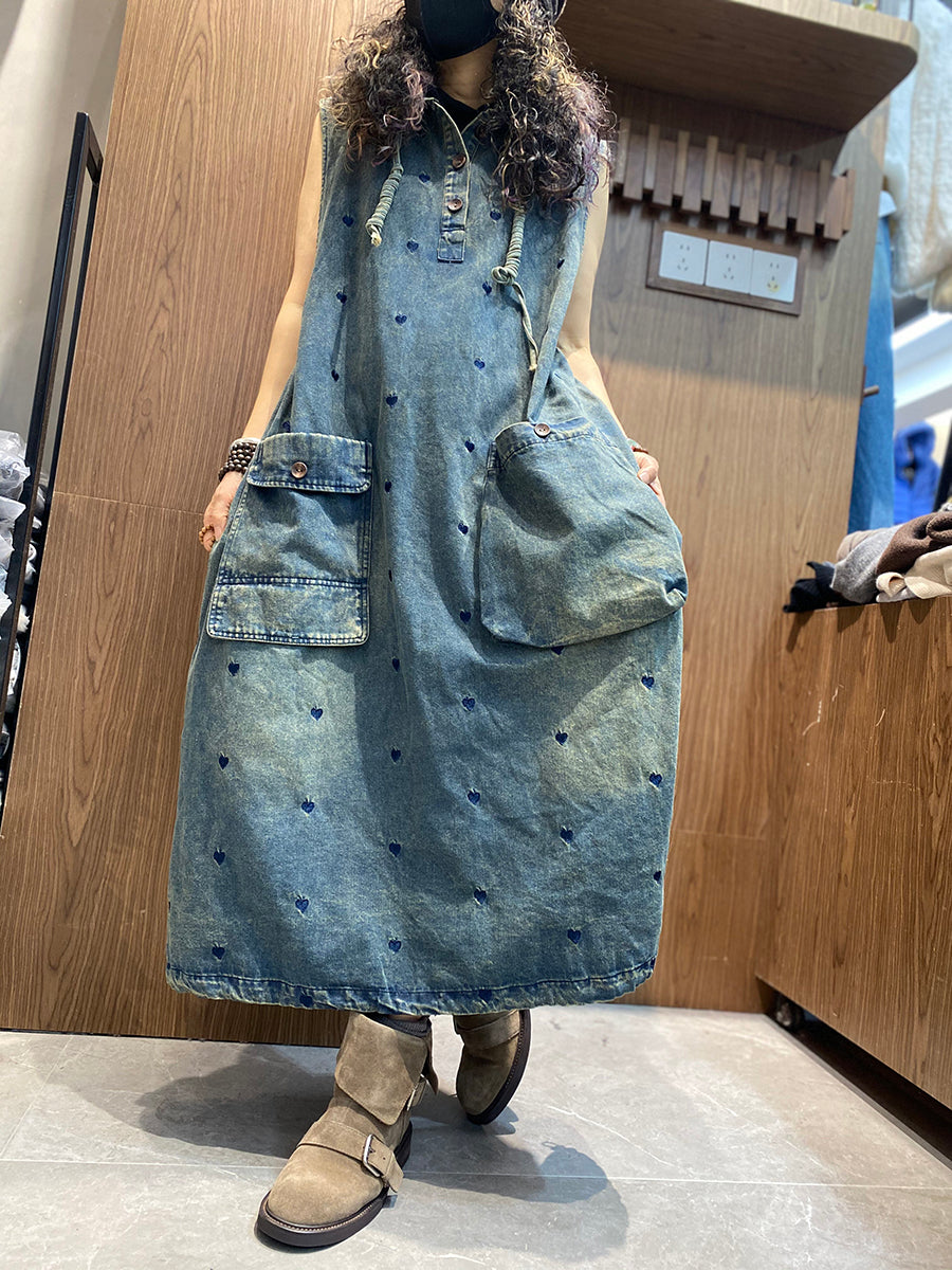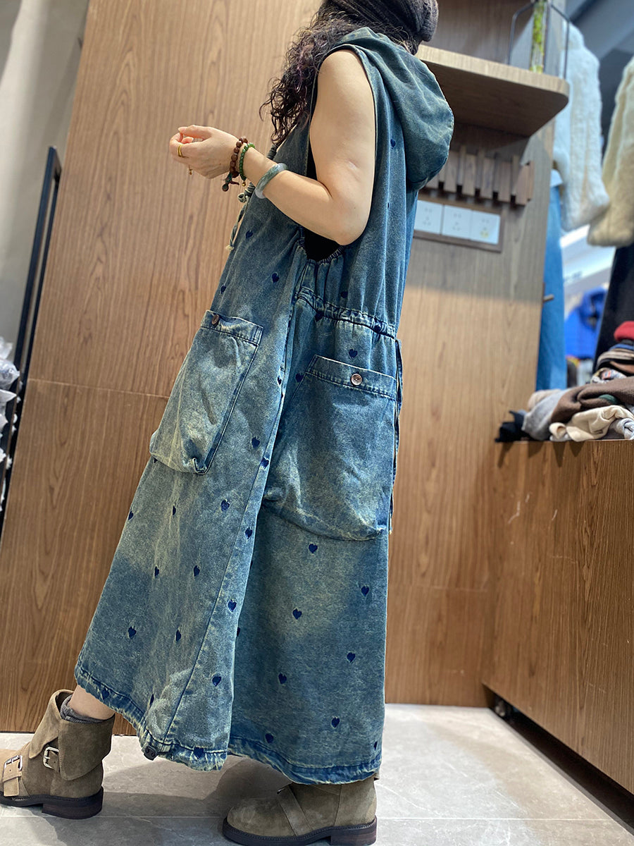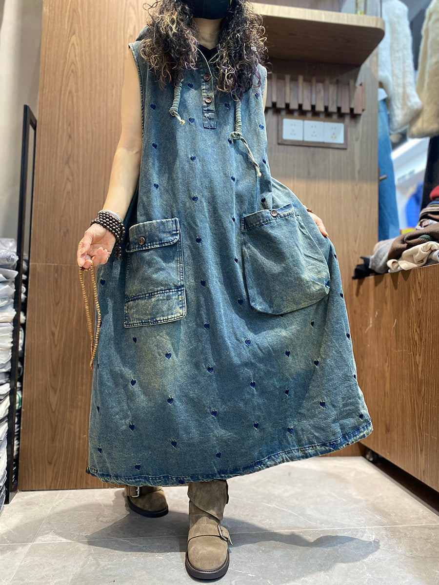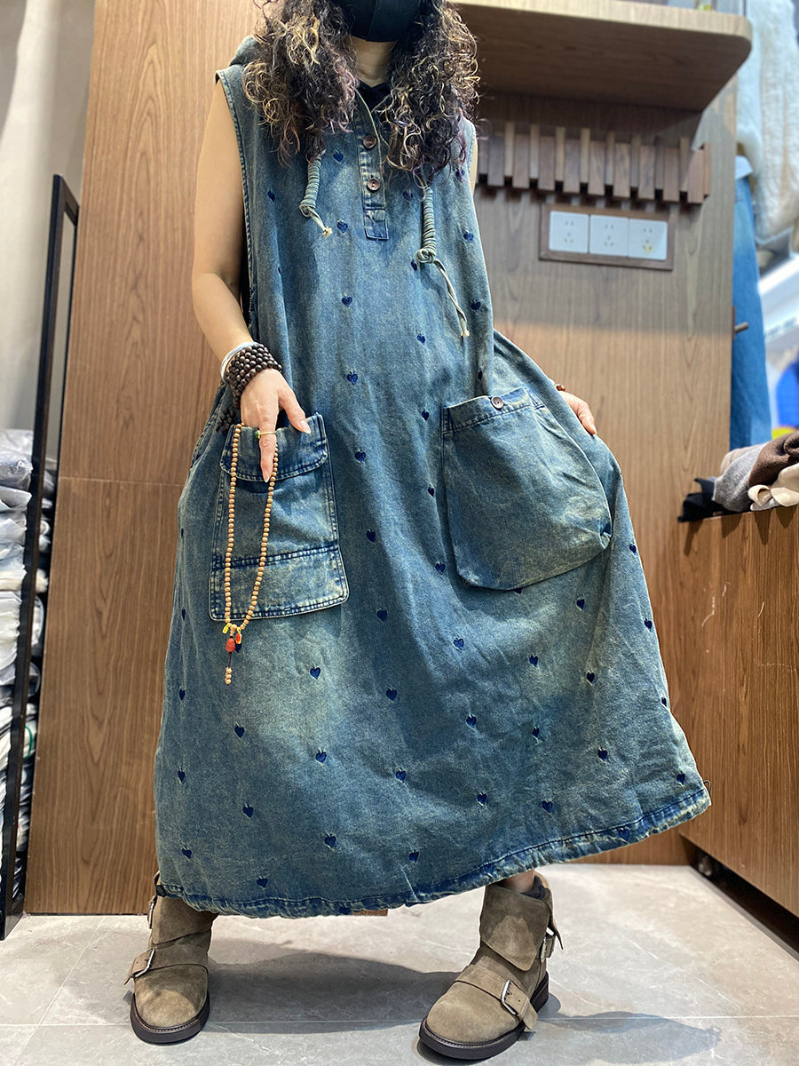 Dámské jarní džínové šaty s kapucí a výšivkou s motivem srdce