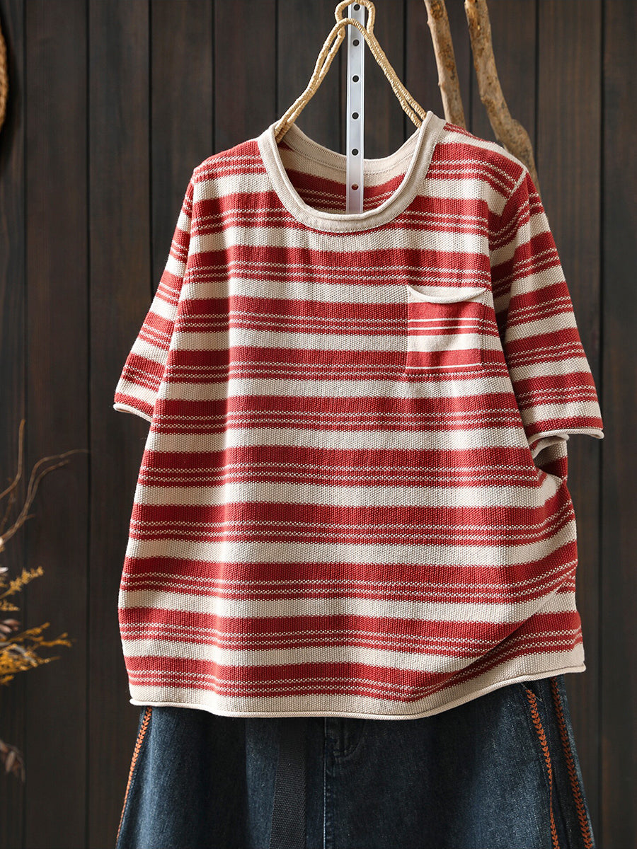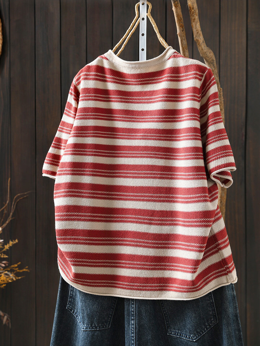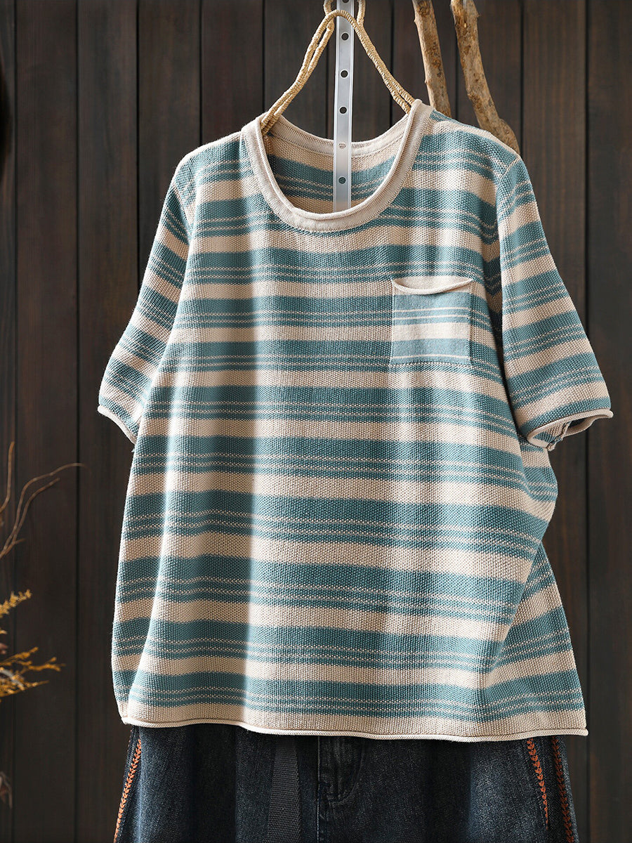 Dámské letní ležérní pruhované bavlněné tričko s výstřihem do O-neck