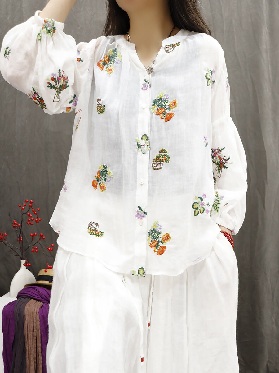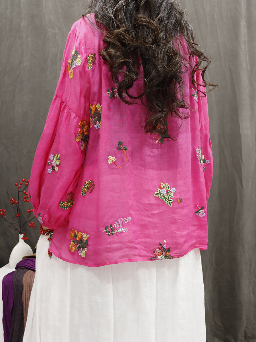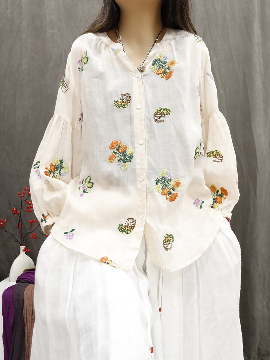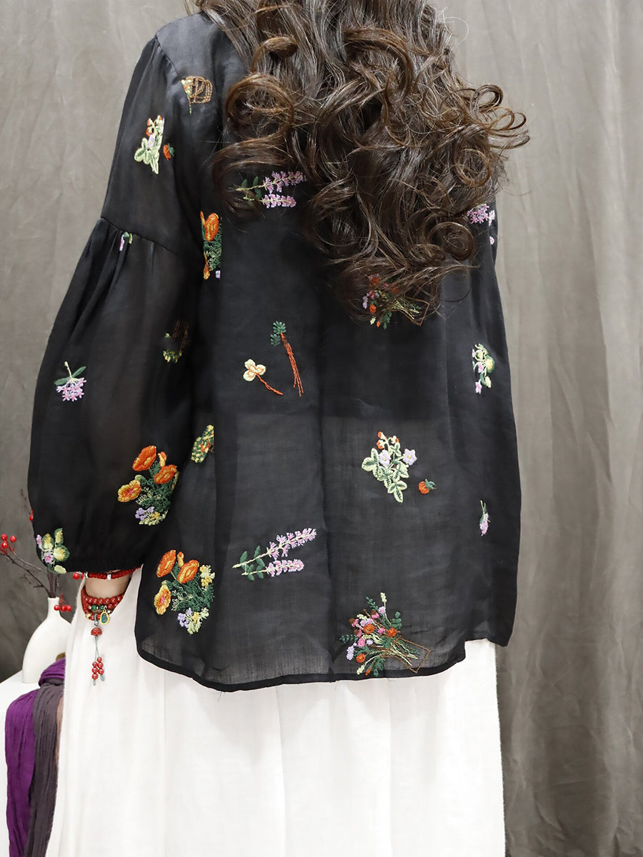 Dámská letní květinová výšivka, 100% ramie, halenka s výstřihem do V