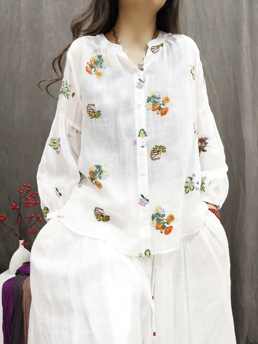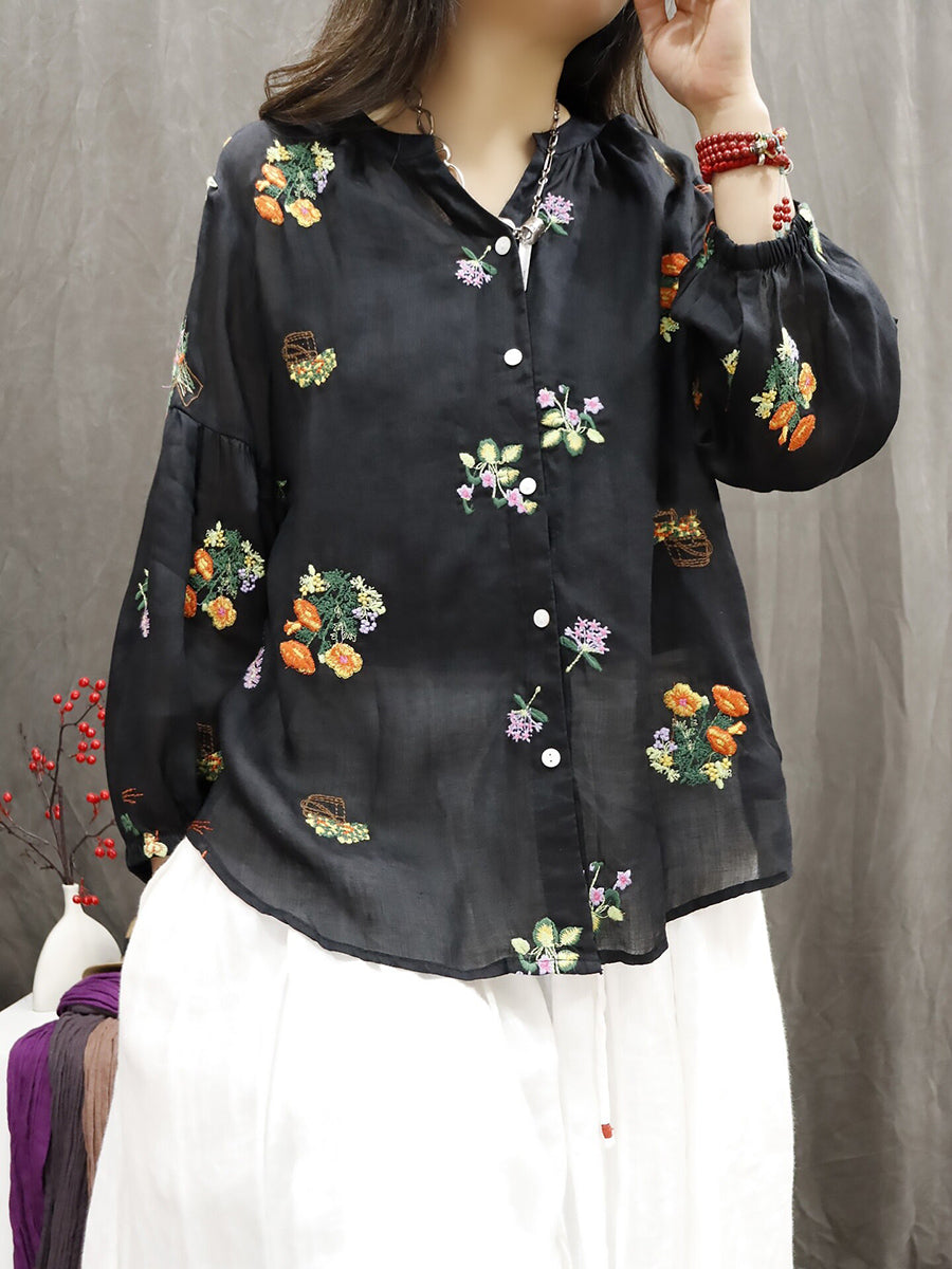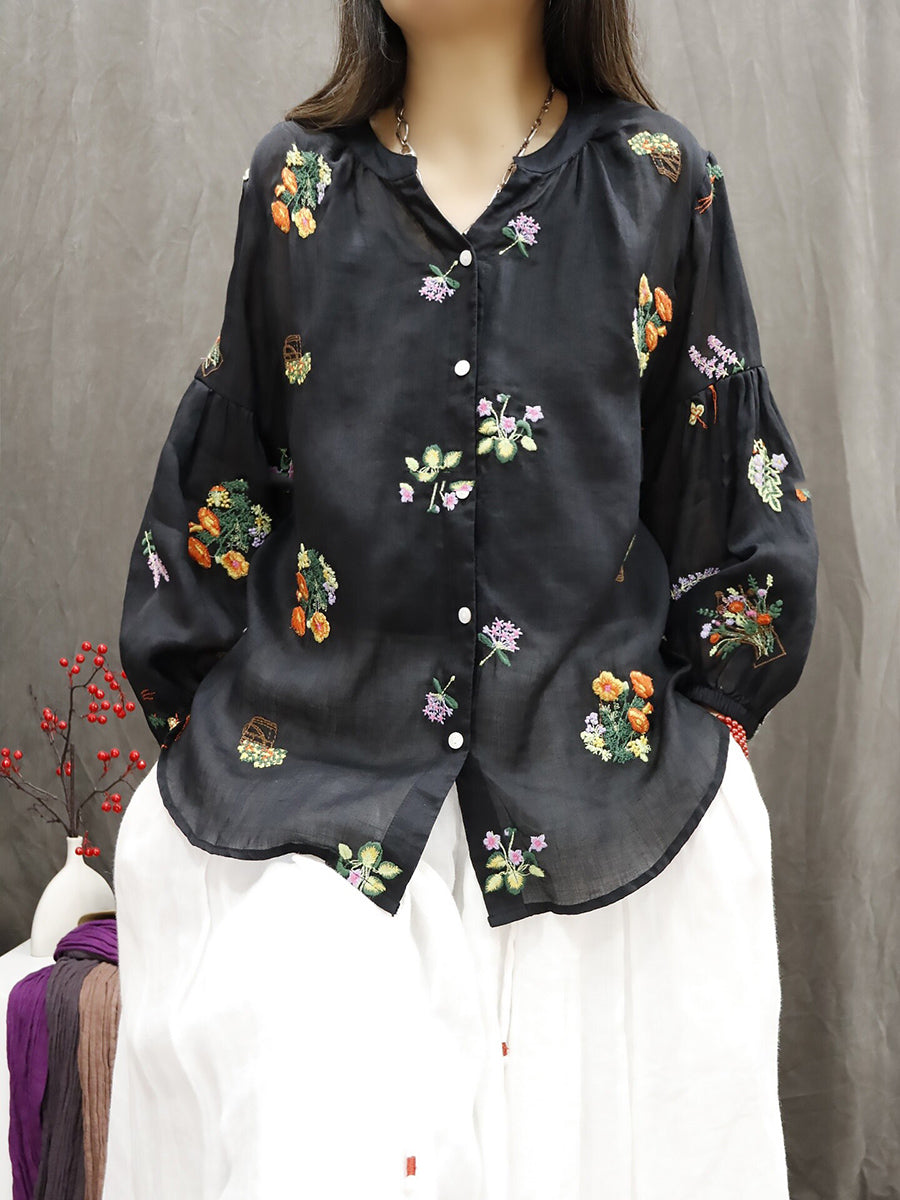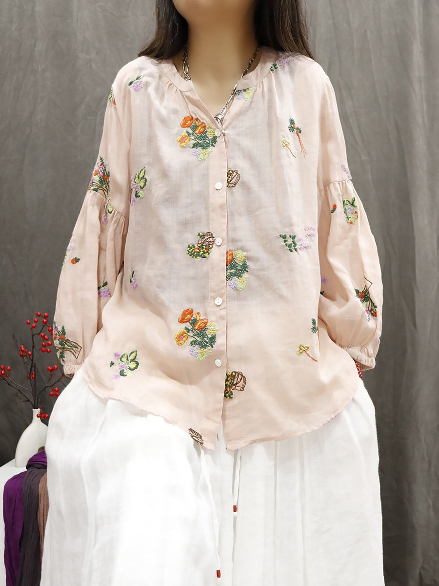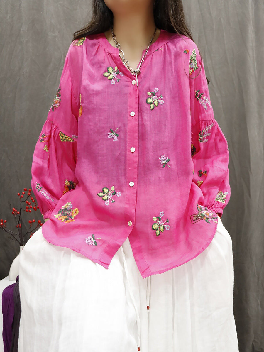 Dámská letní květinová výšivka, 100% ramie, halenka s výstřihem do V